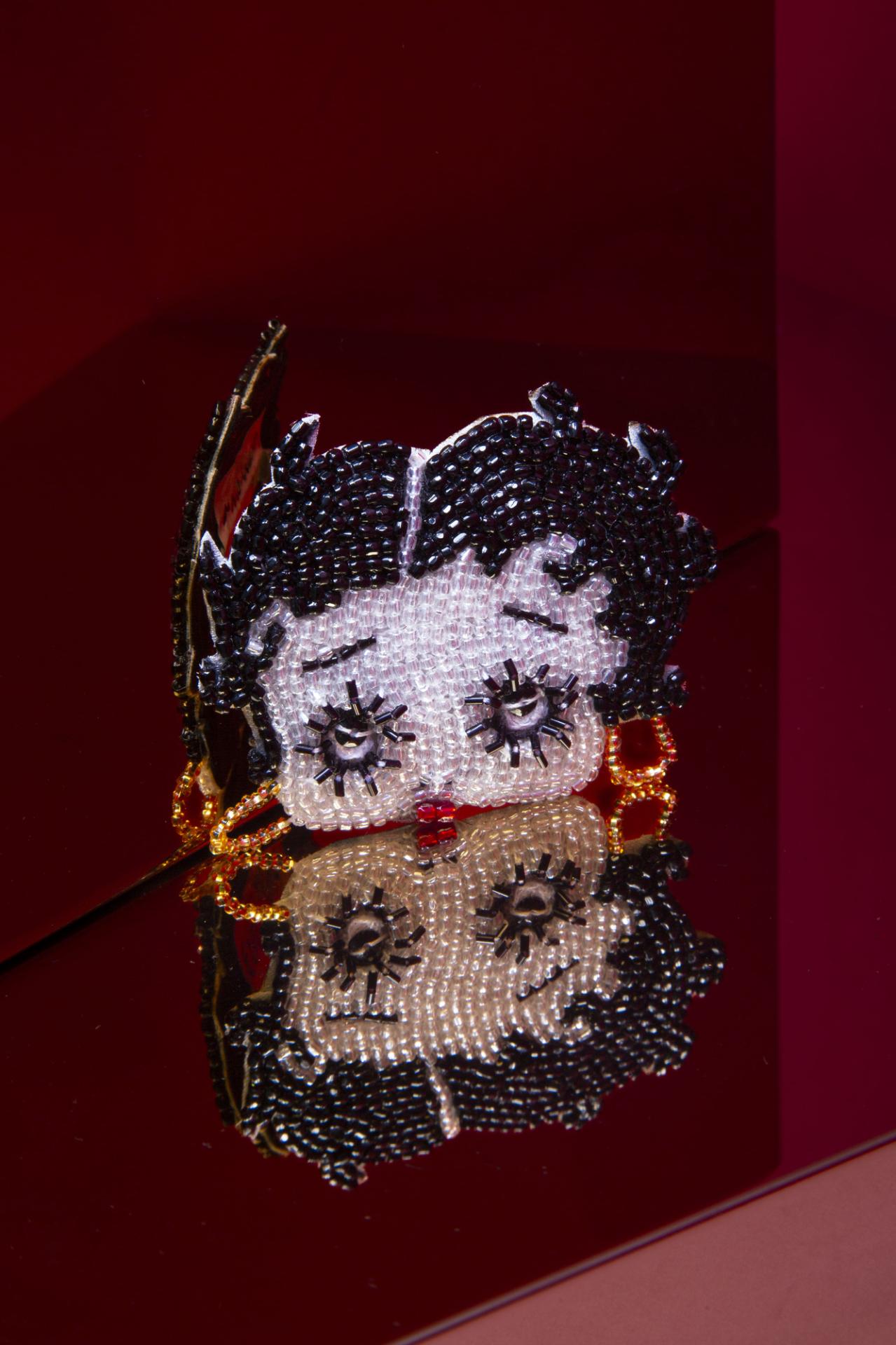 A colorful enamel pin featuring a strong retro inspired heroine with bright hair and bold graphic elements.
