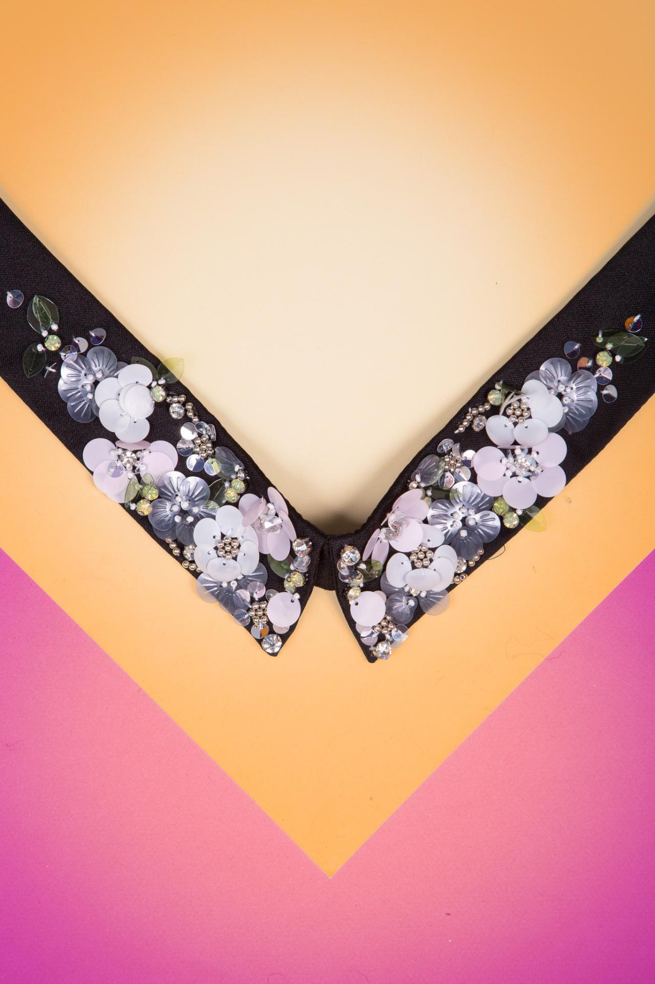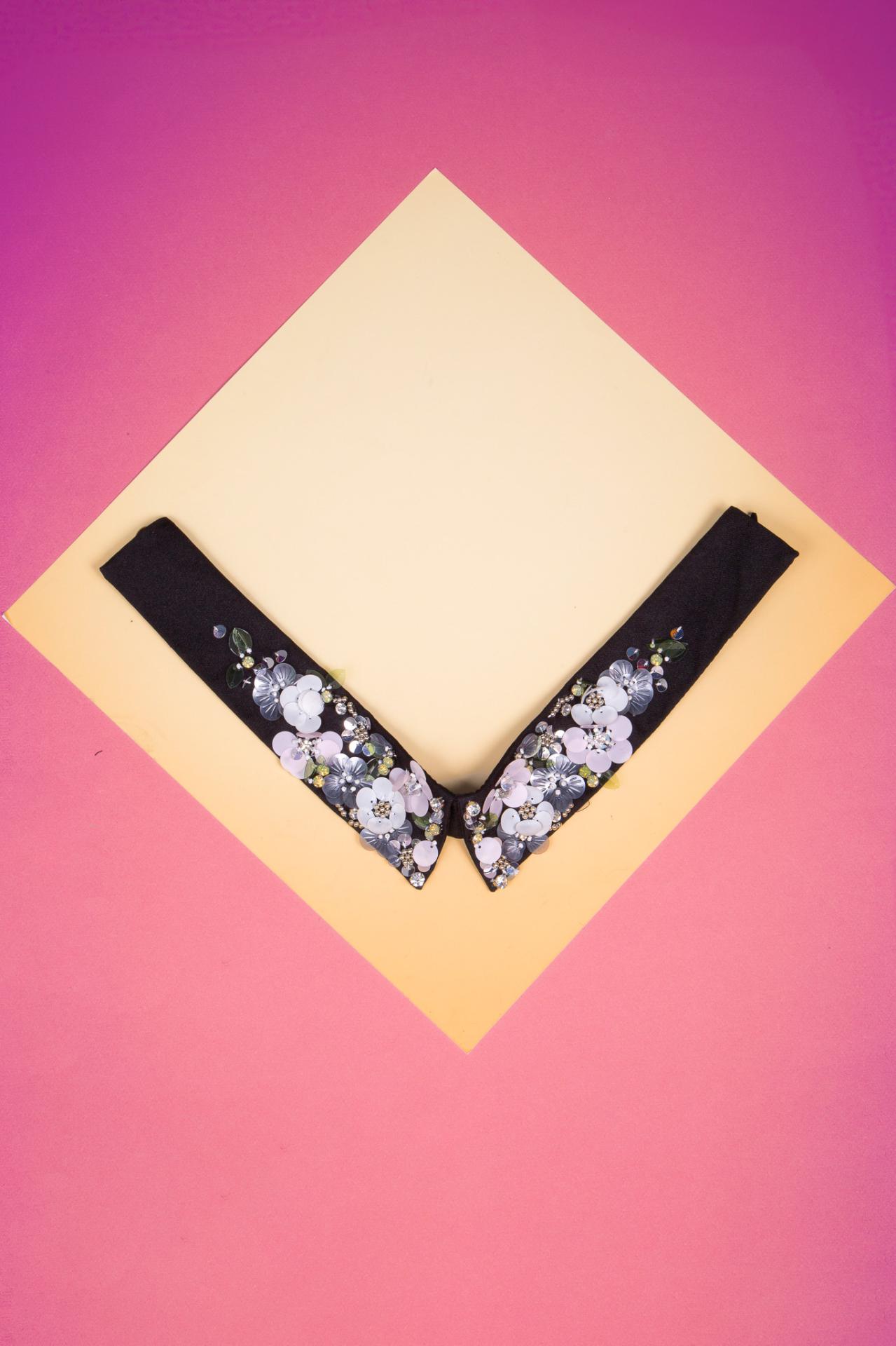 A black collar decorated with floral sequins, pearls, and crystal accents for a soft elegant finish.