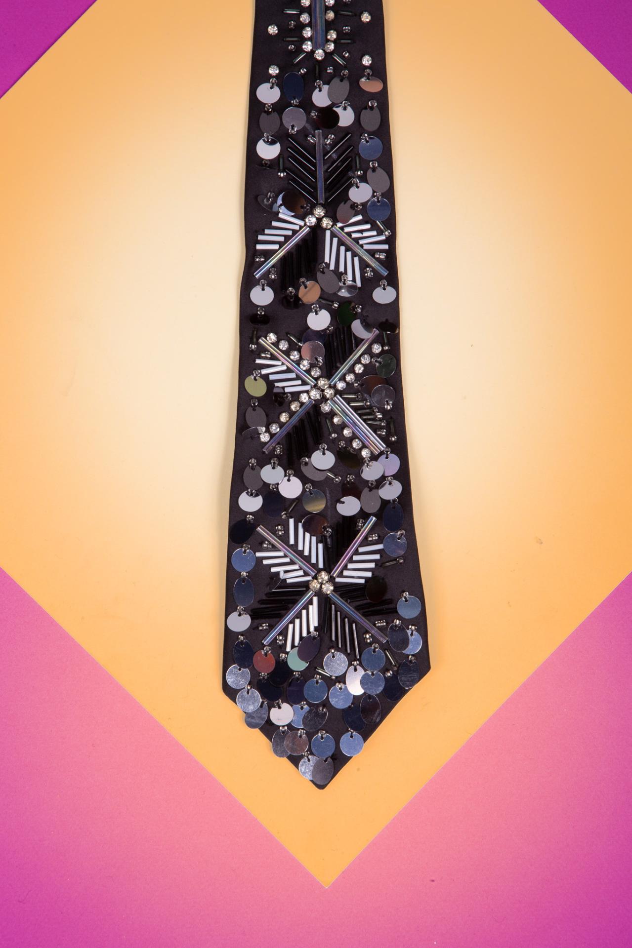 A black tie decorated with sequins beads and geometric details for a bold modern finish.