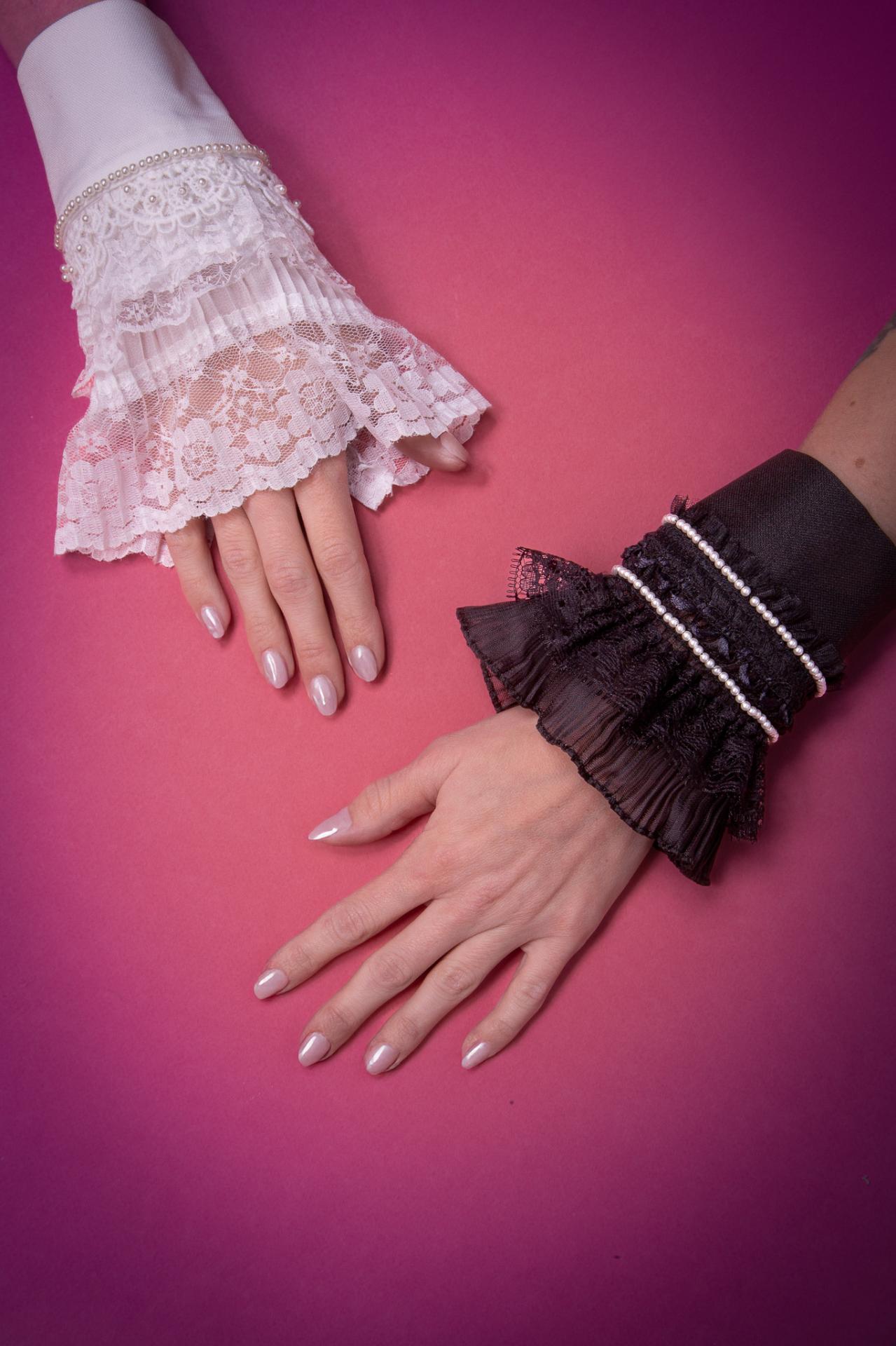 A white fabric cuff adorned with layered lace and a delicate bead trim for a refined romantic touch.