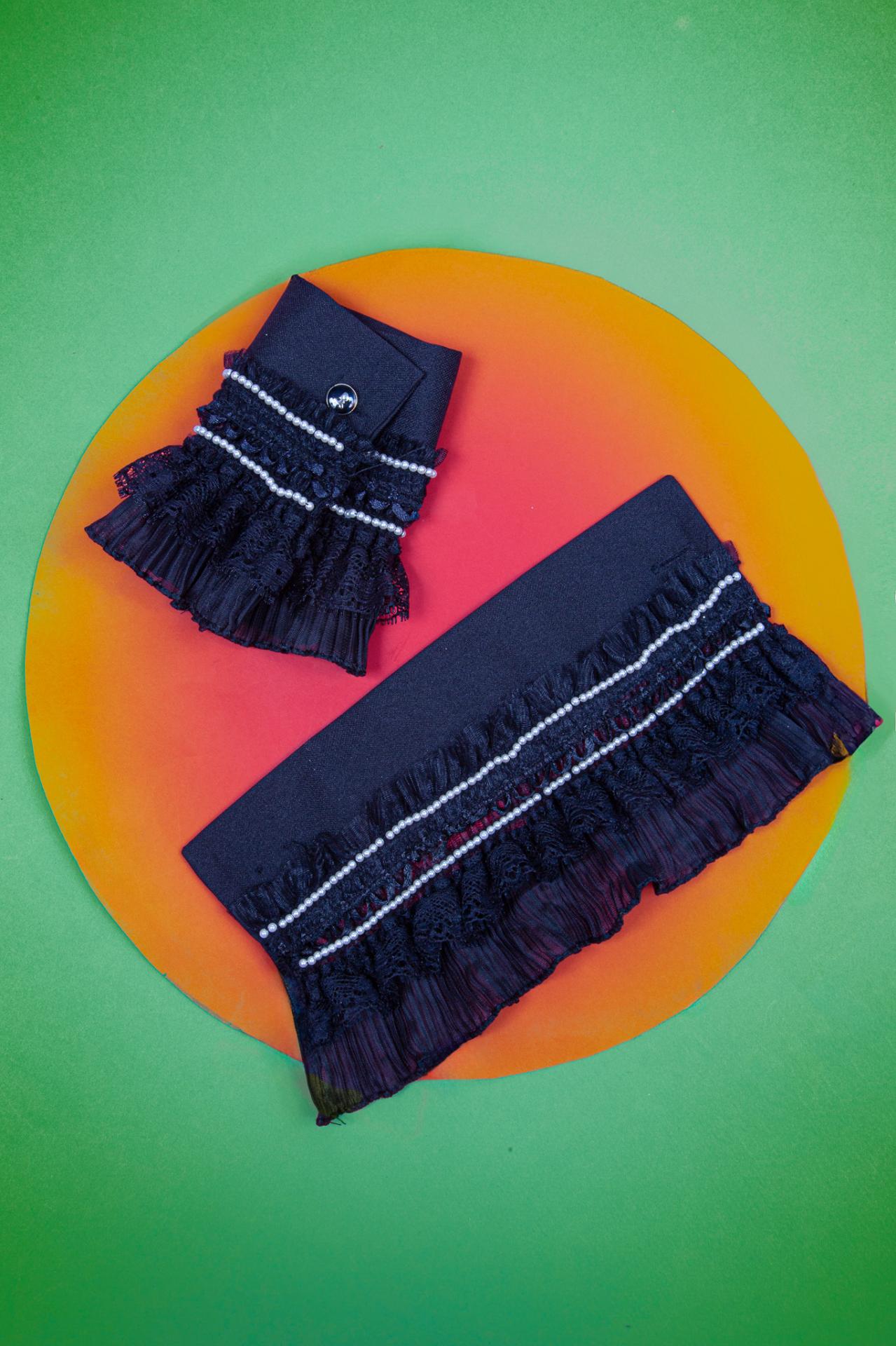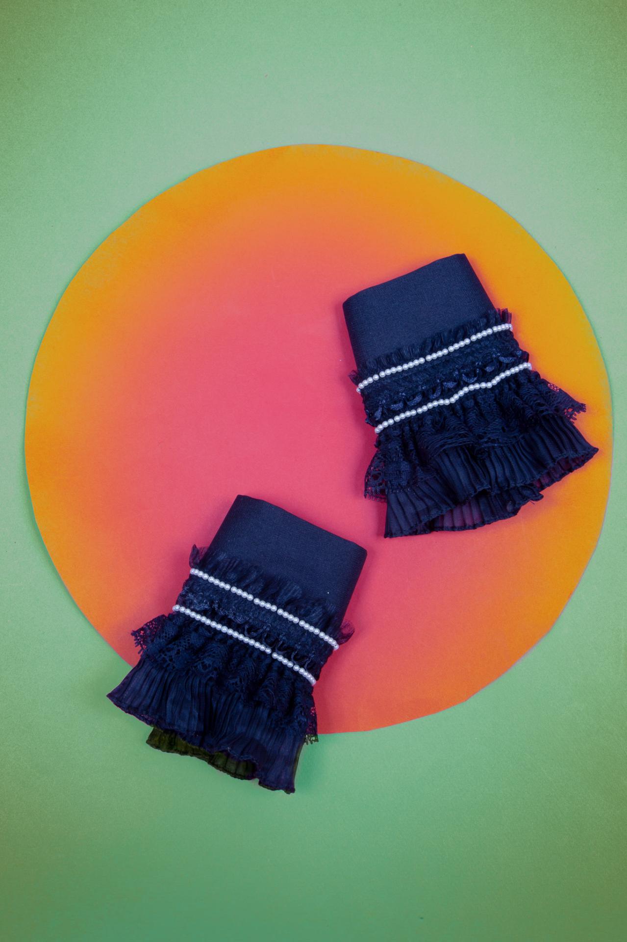A navy fabric cuff decorated with layered ruffles and a delicate bead trim for a chic elegant finish.