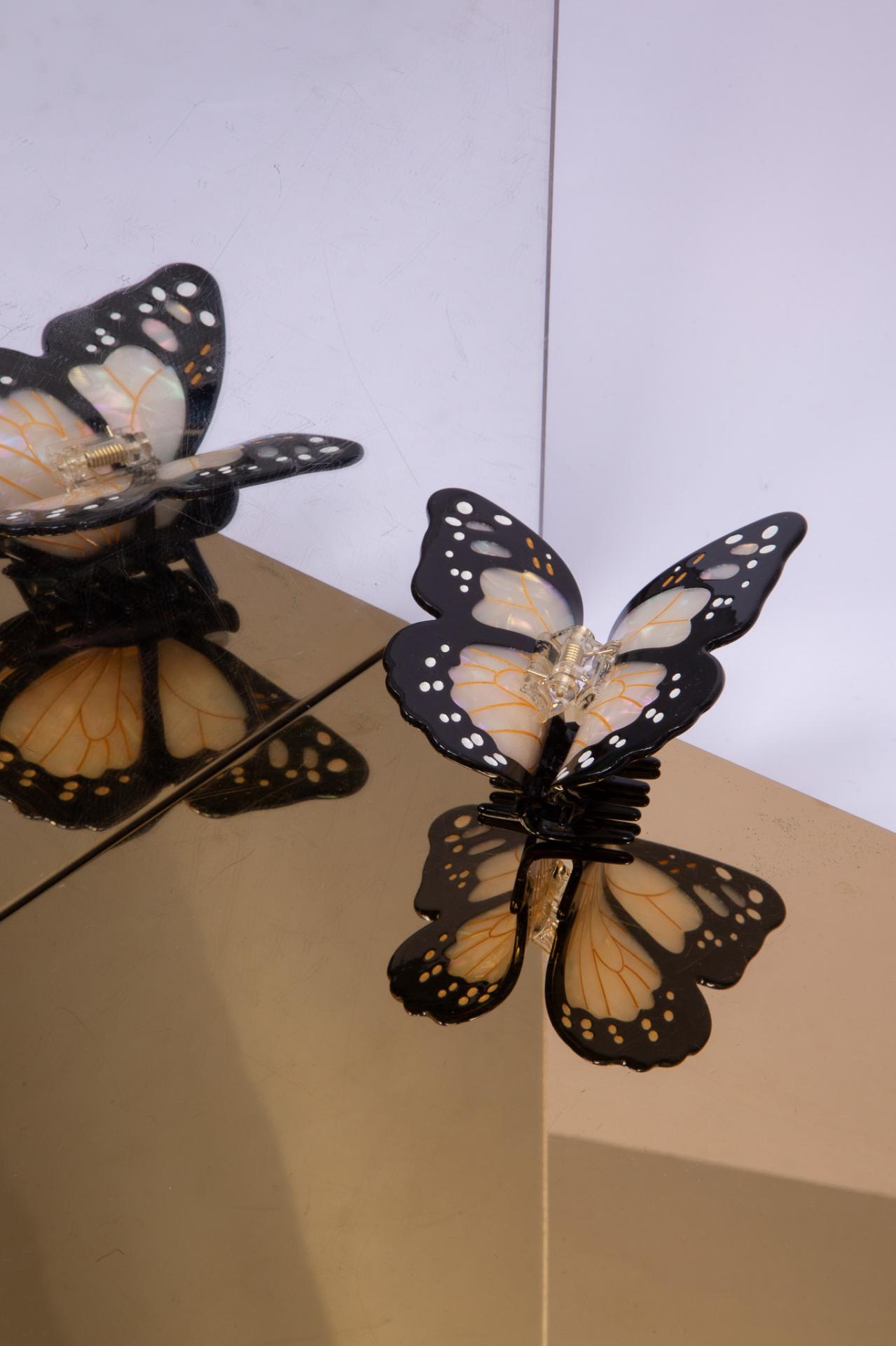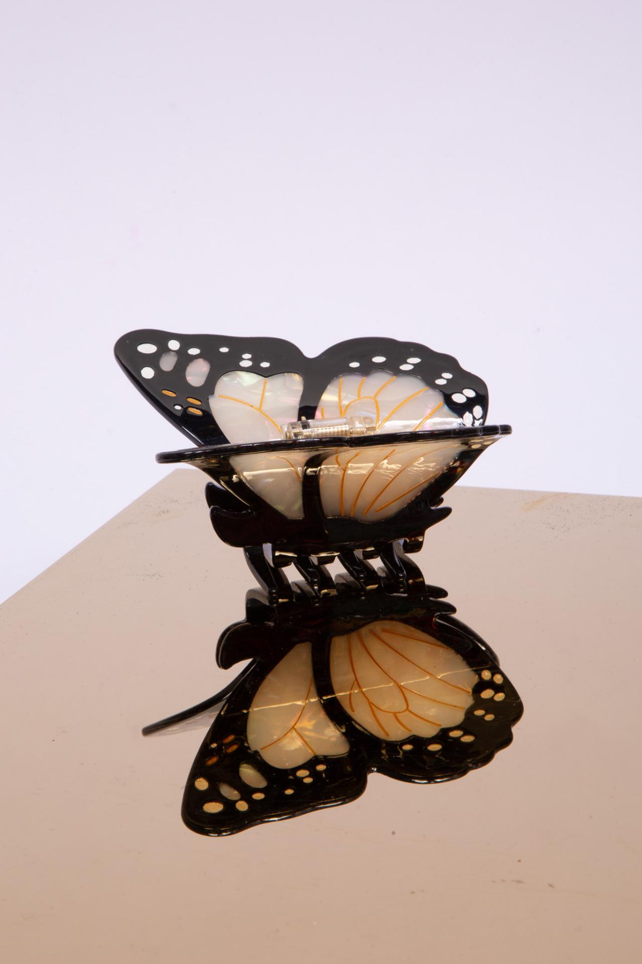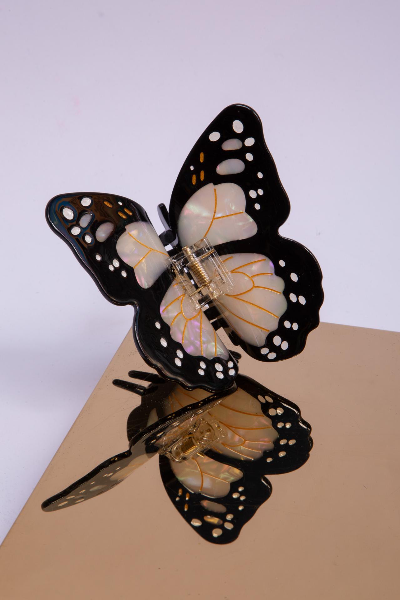 A butterfly hair clip with black wings and pearly white accents for a delicate elegant look.