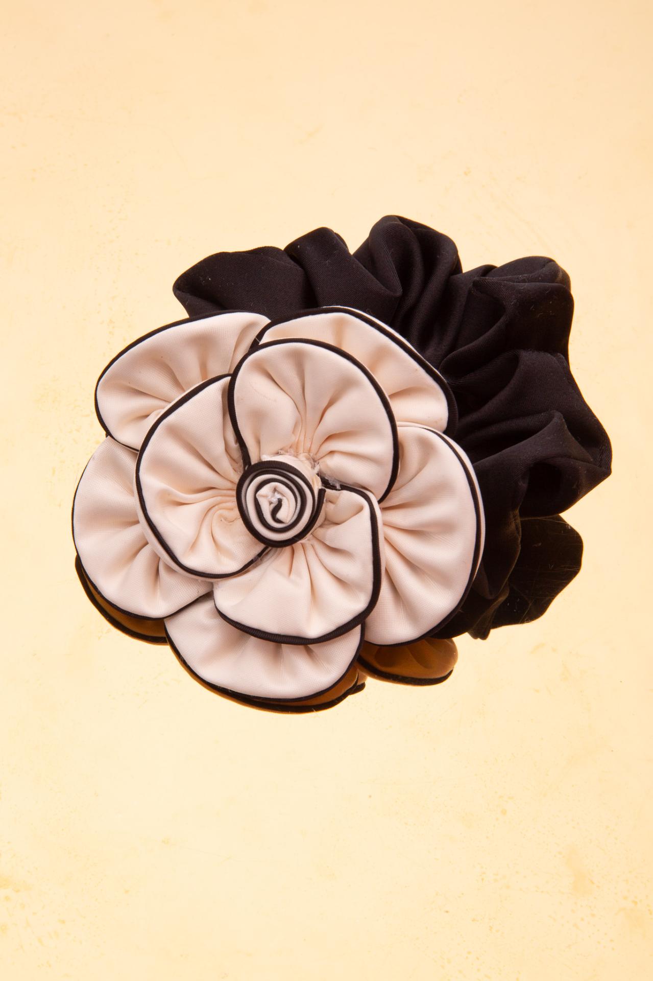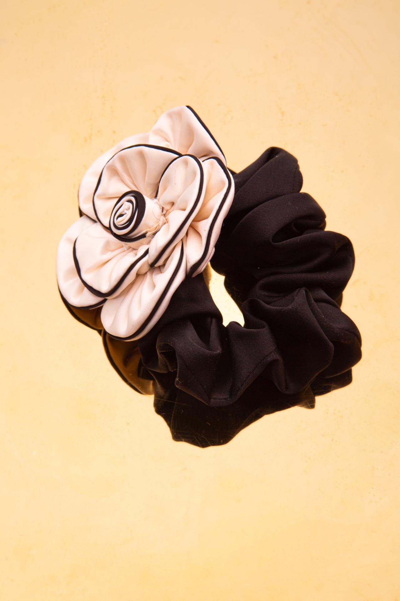 A black scrunchie topped with a soft cream flower for a chic elegant look.