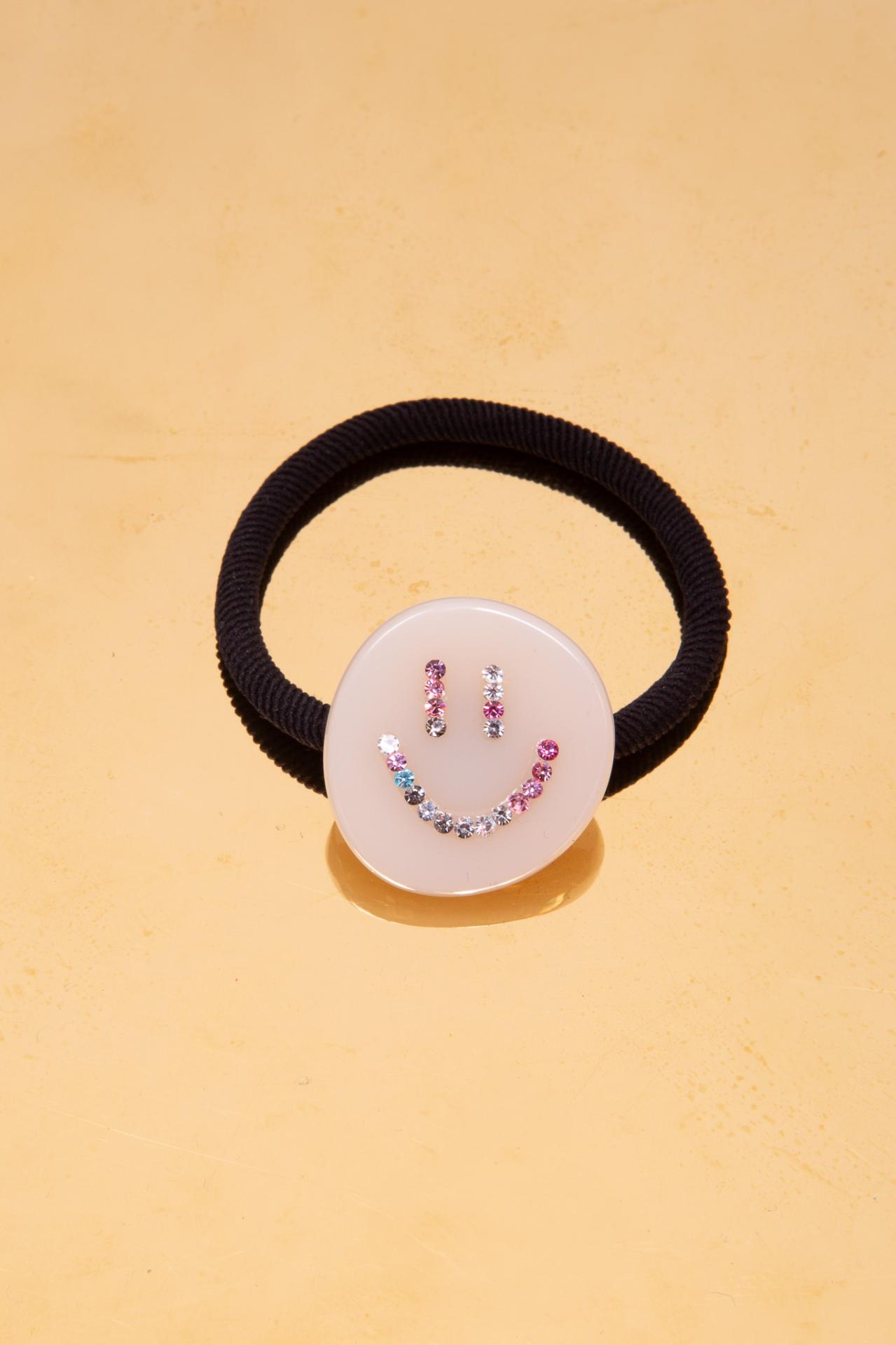 A black hair tie with a glossy smiley charm decorated with colorful crystals for a cute cheerful look.