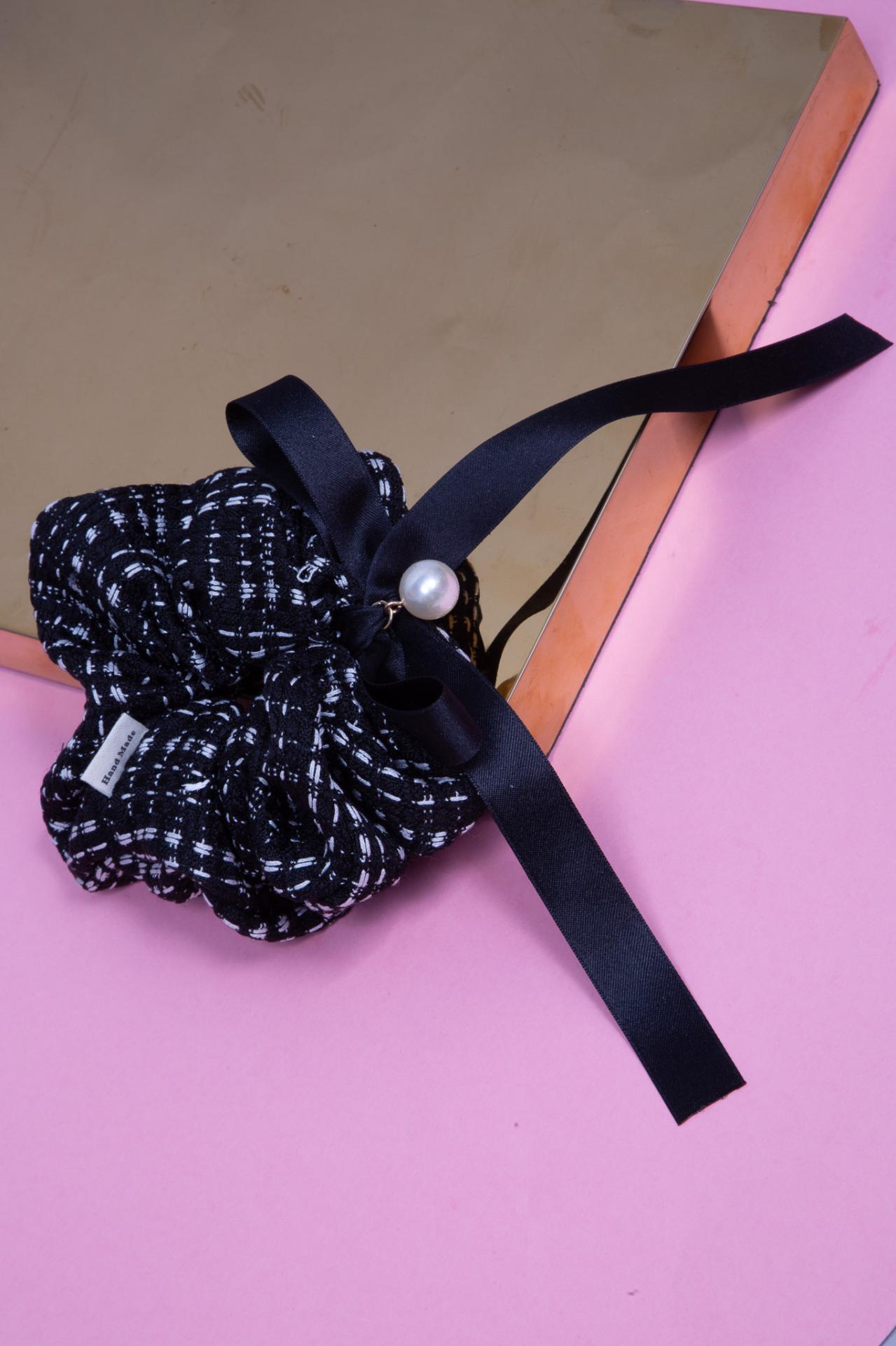 A black tweed scrunchie decorated with a satin ribbon and a pearl charm for a chic elegant look.