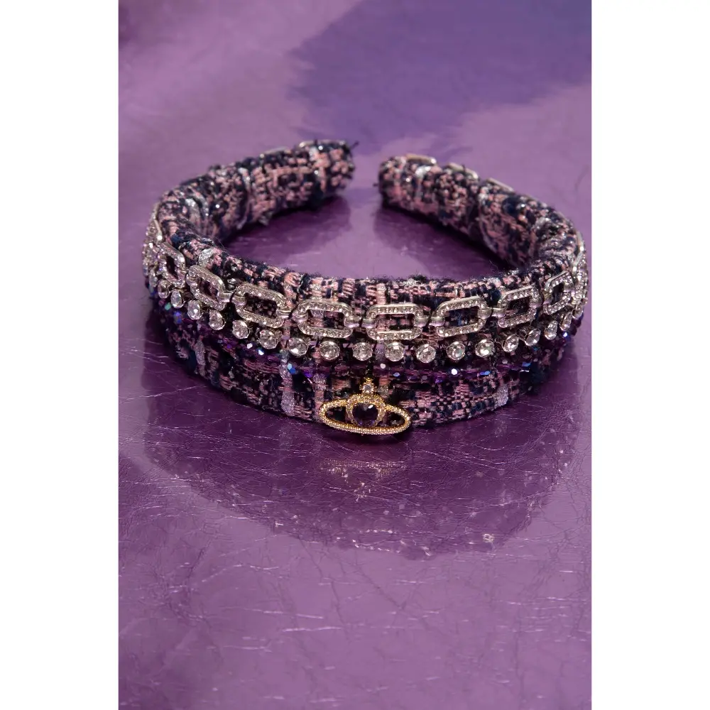 A tweed headband accented with sparkling crystal chains and a tiny crown charm for an elegant royal touch.