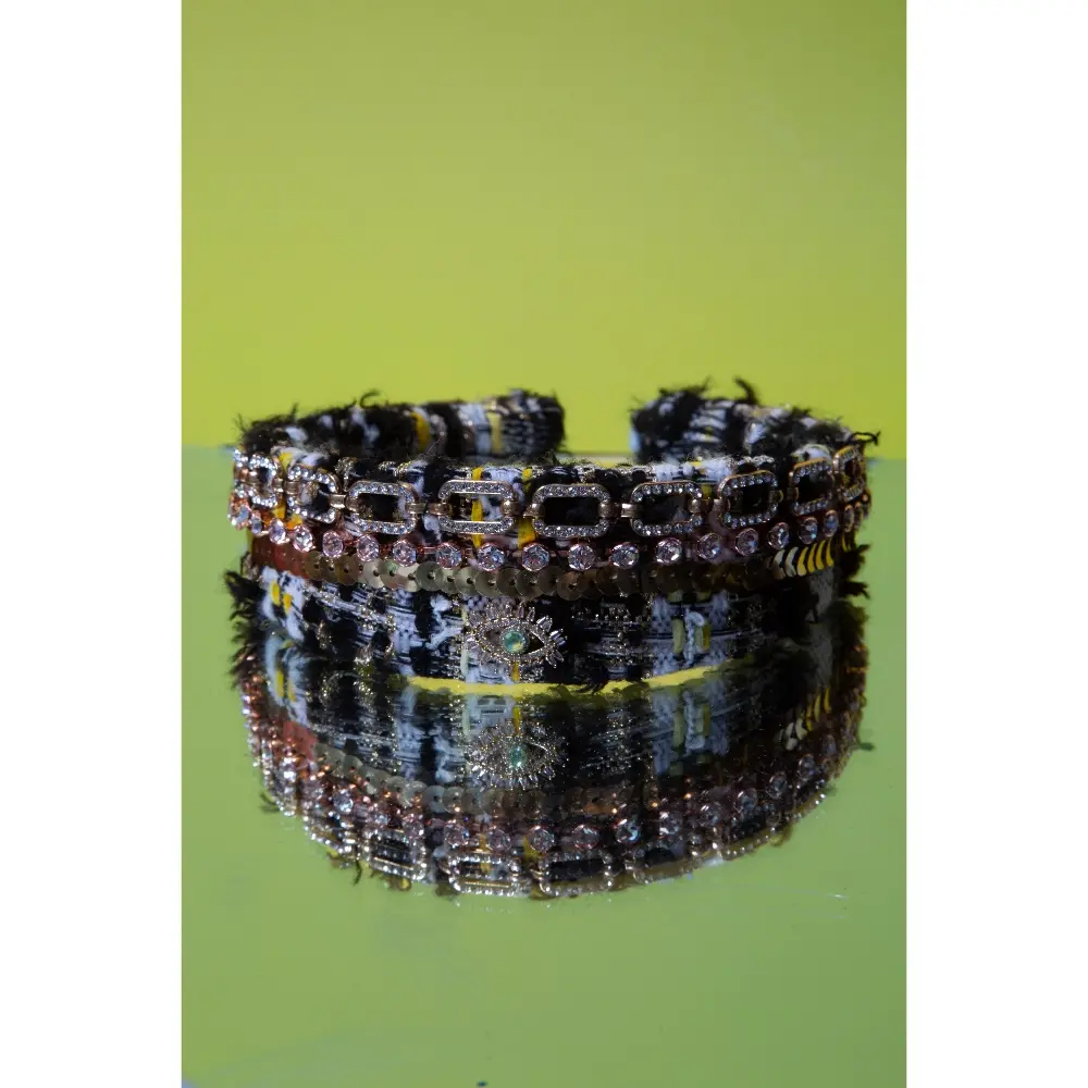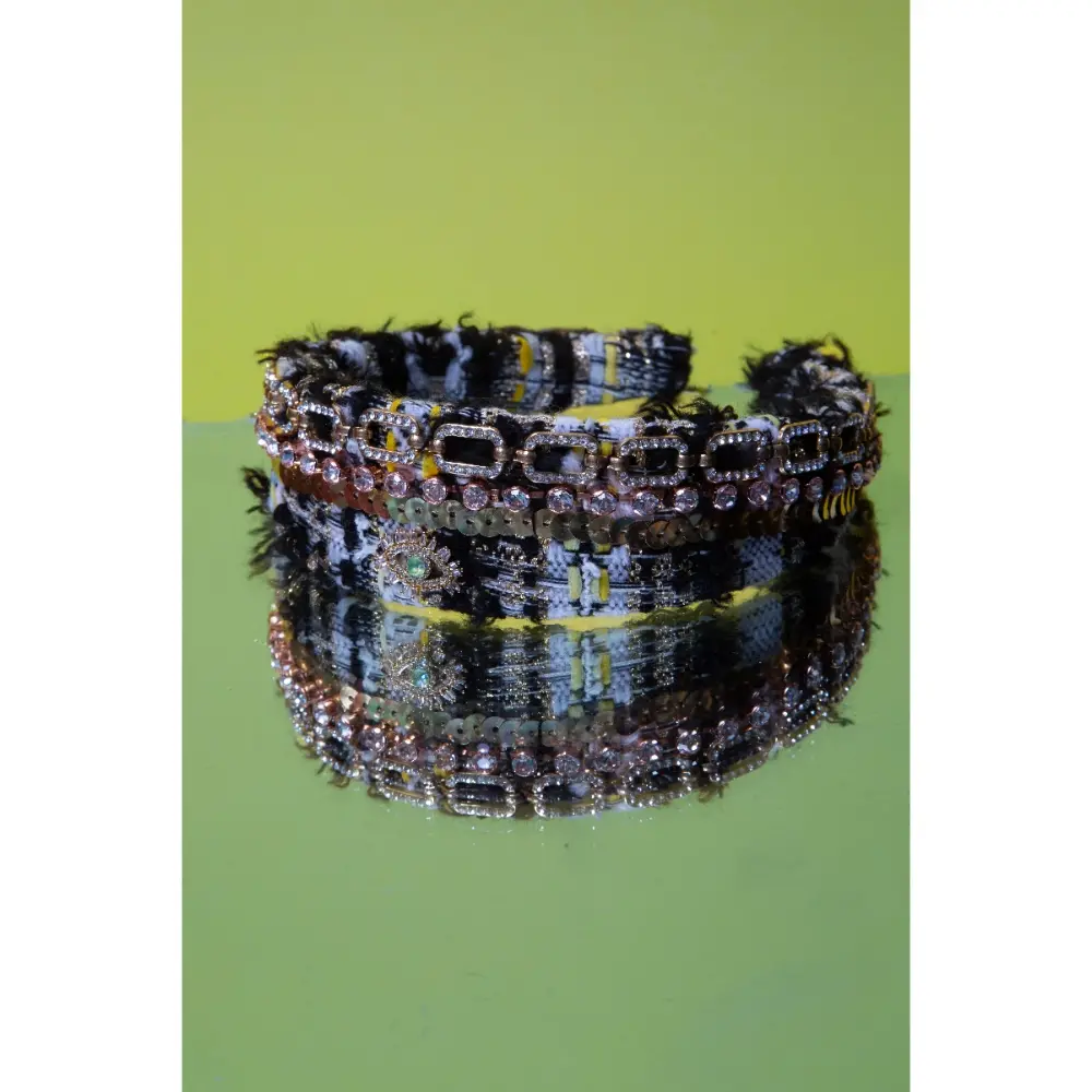 A tweed headband decorated with sparkling chains and crystal accents for a bold chic finish.