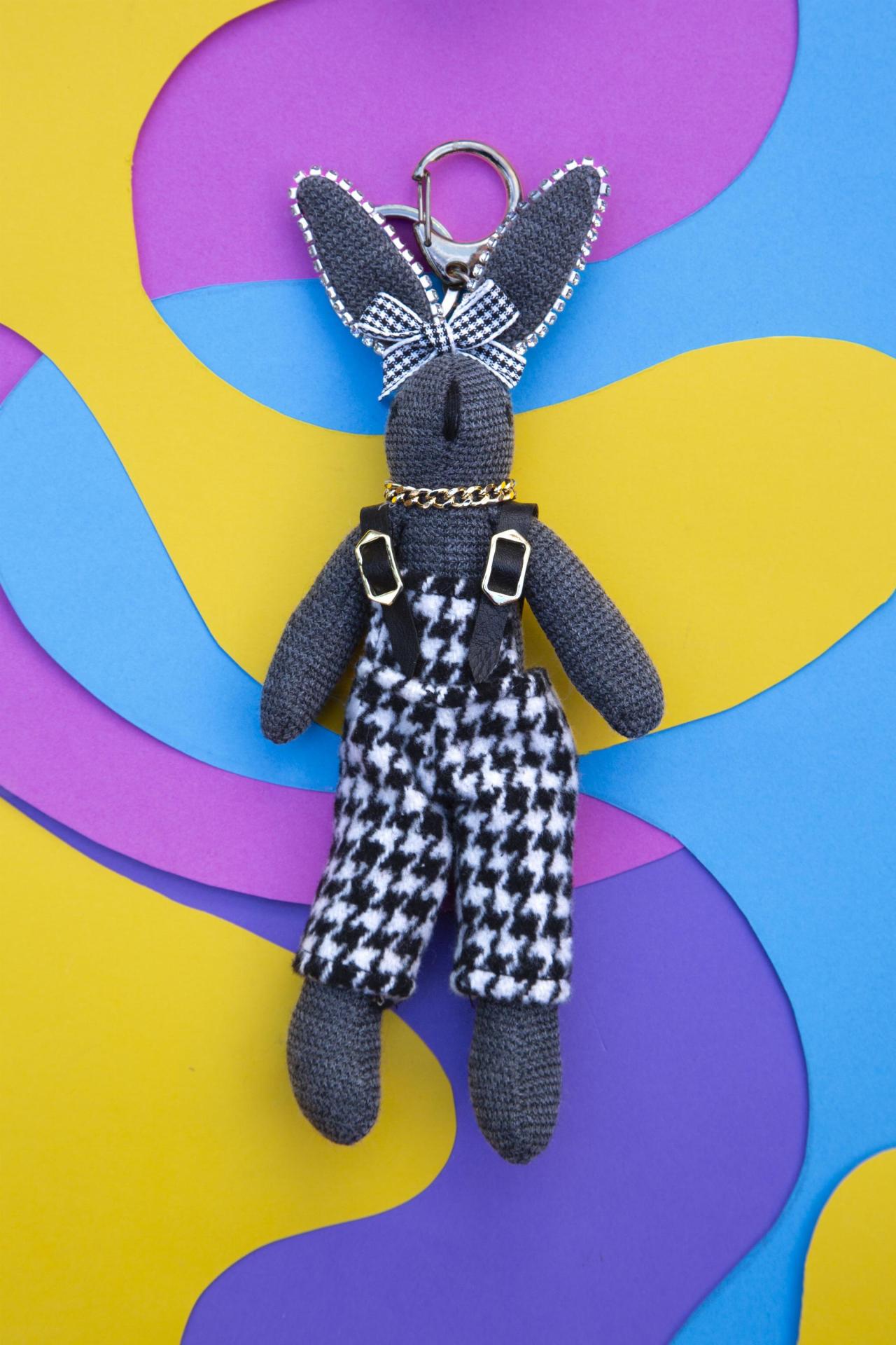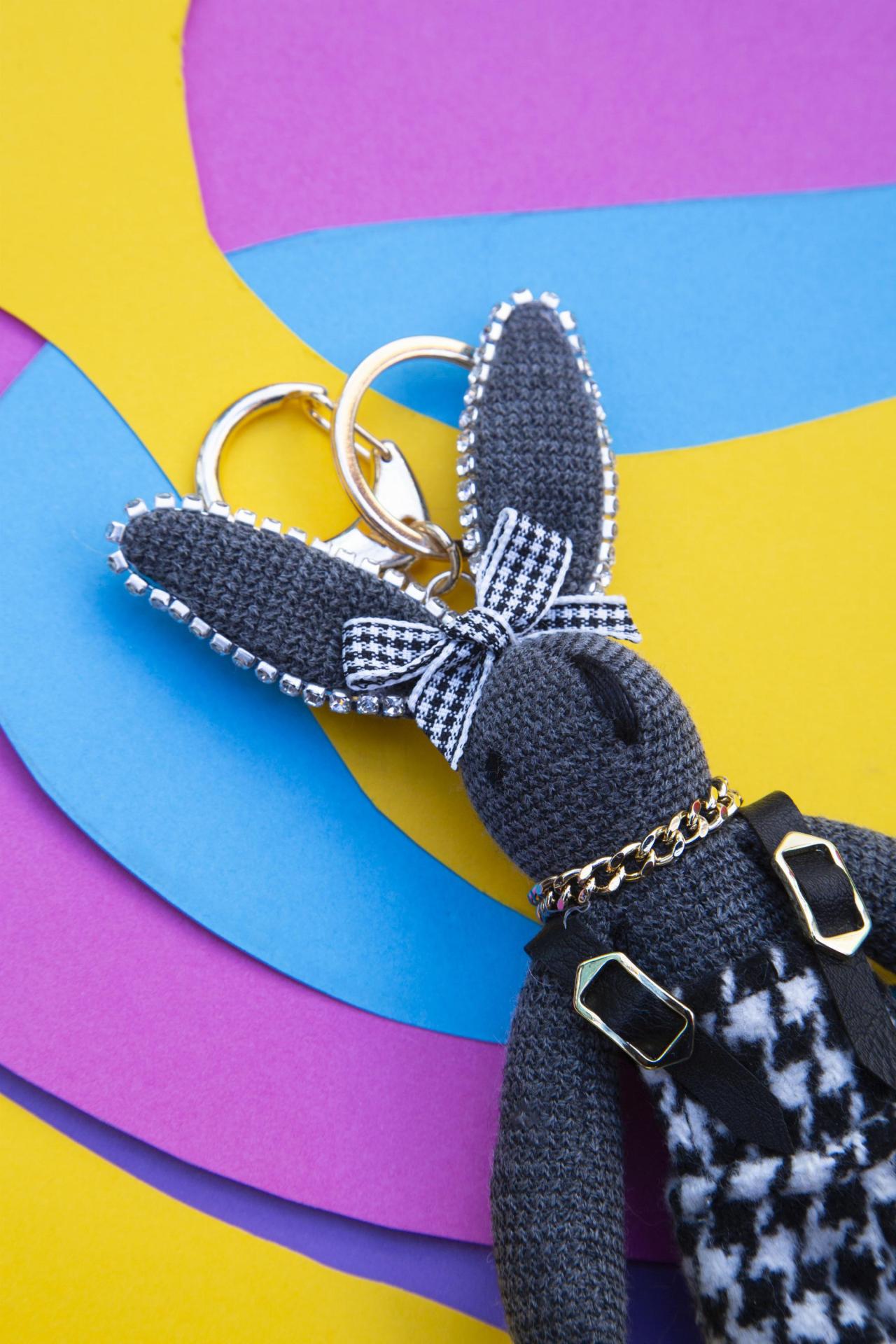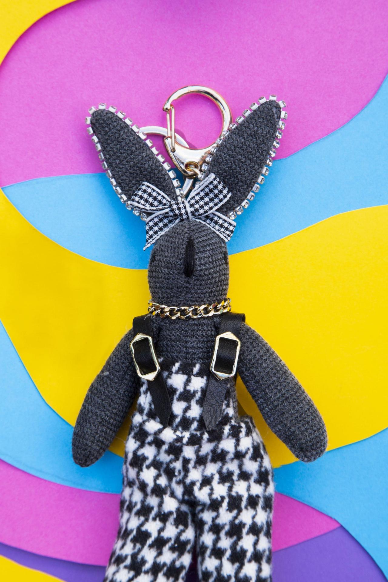 A chic grey bunny keychain dressed in houndstooth overalls with a gingham bow and gold chain details.