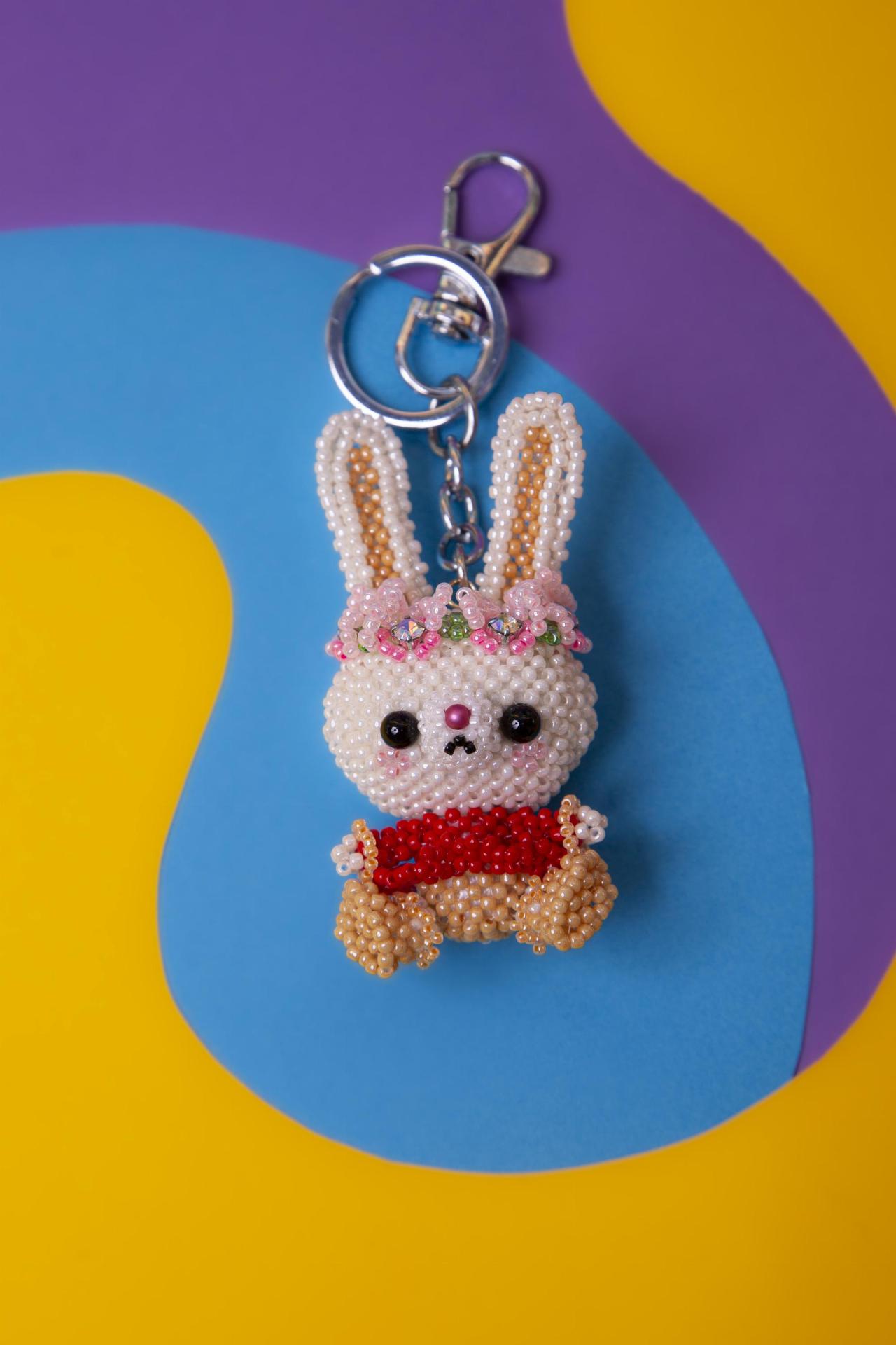 A hand-beaded rabbit keychain decorated with pastel pearls, a floral crown, and a tiny red bow.