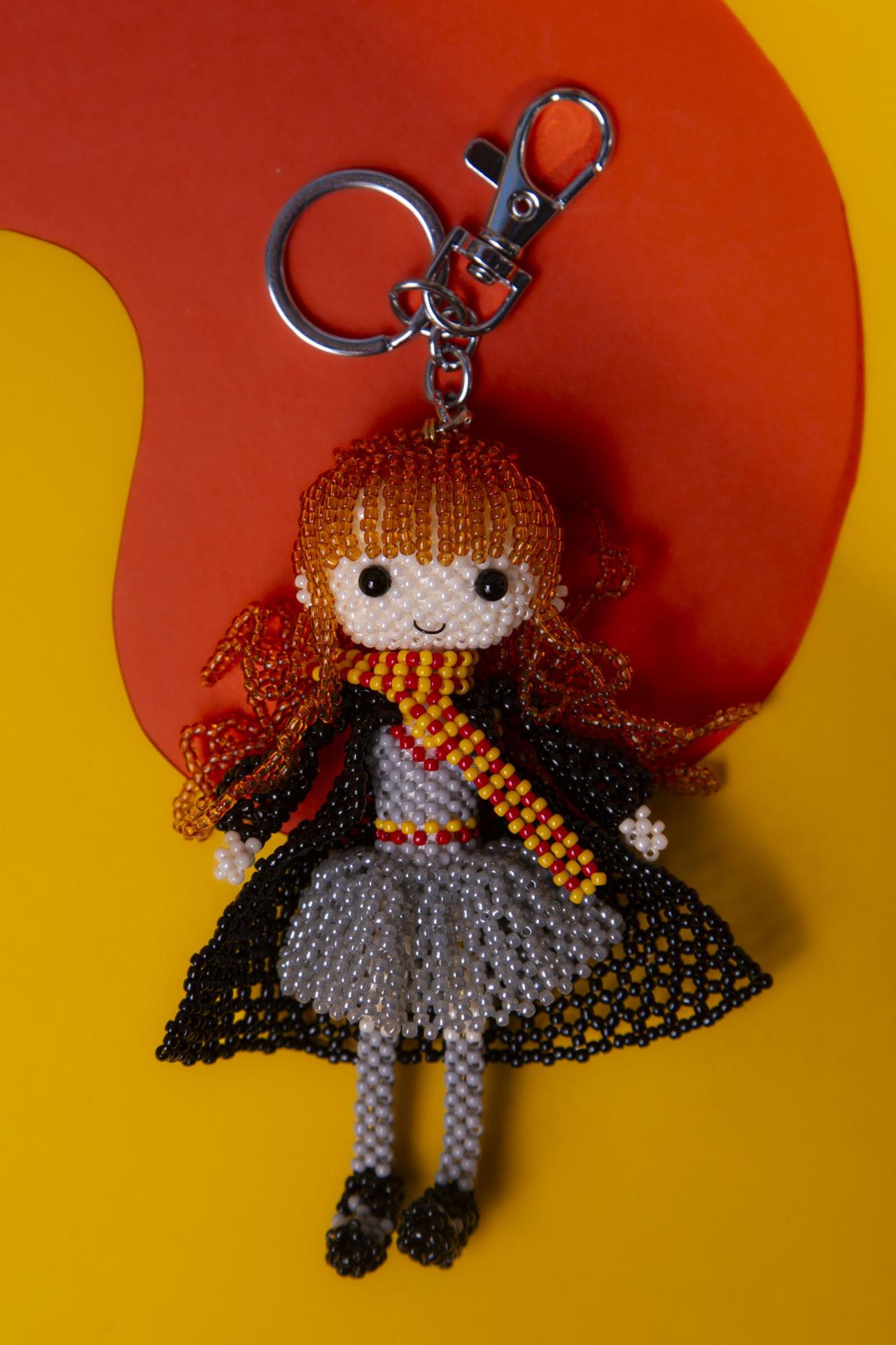 A hand-beaded wizard girl keychain with flowing ginger hair, a magic-school scarf, and a black cloak.