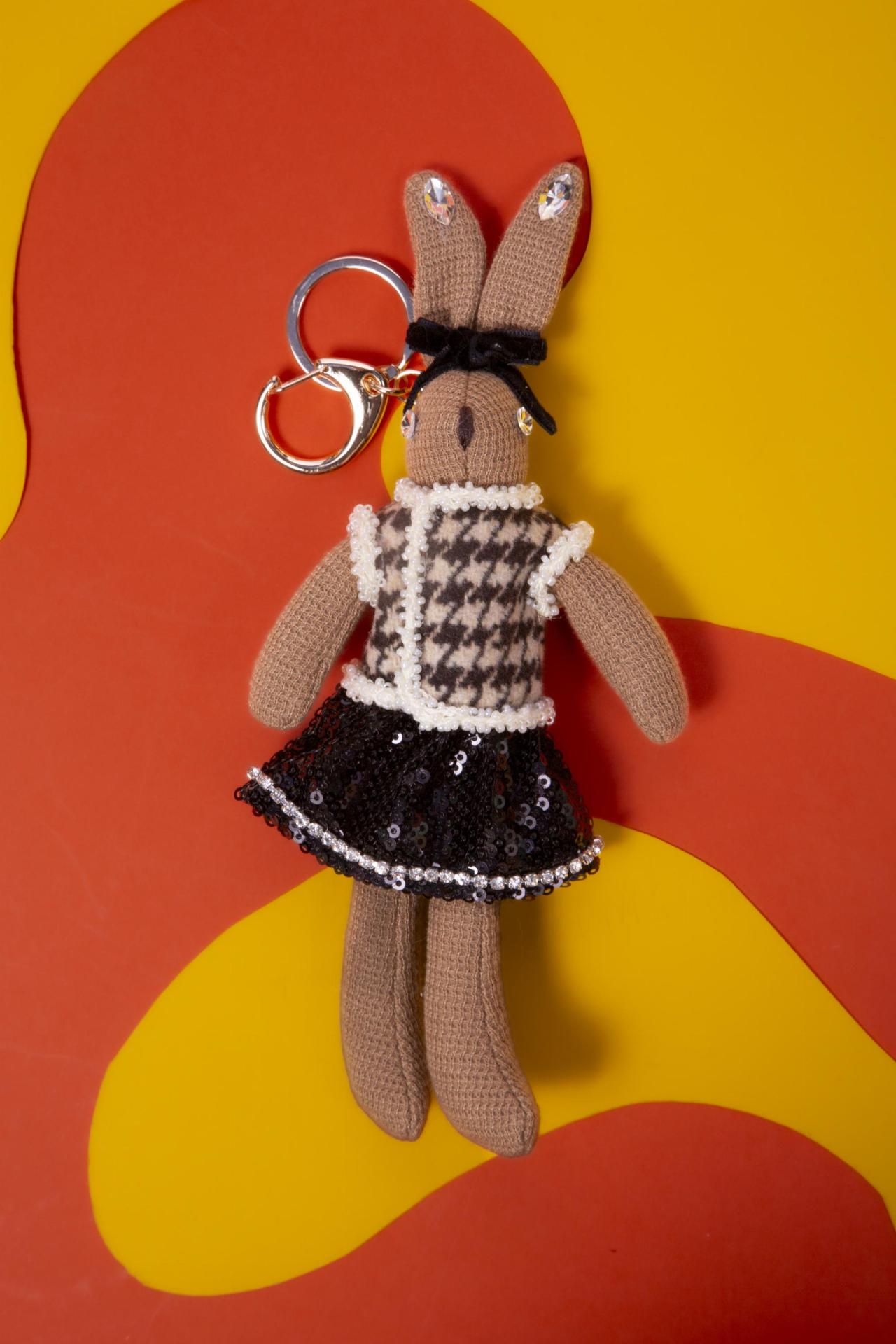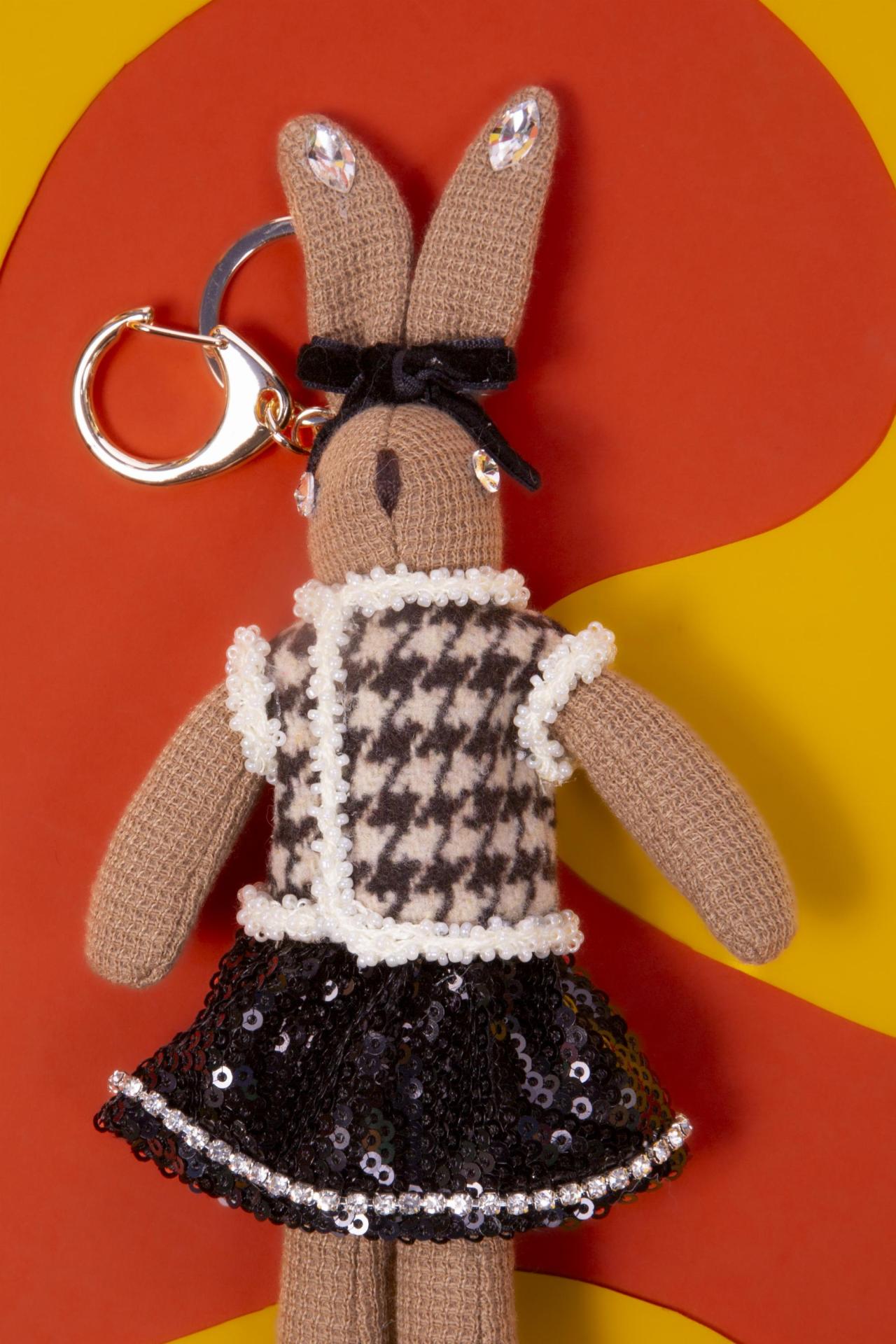 A chic beige bunny keychain dressed in a tweed vest and sequin skirt, finished with crystal ear details and a velvet bow.