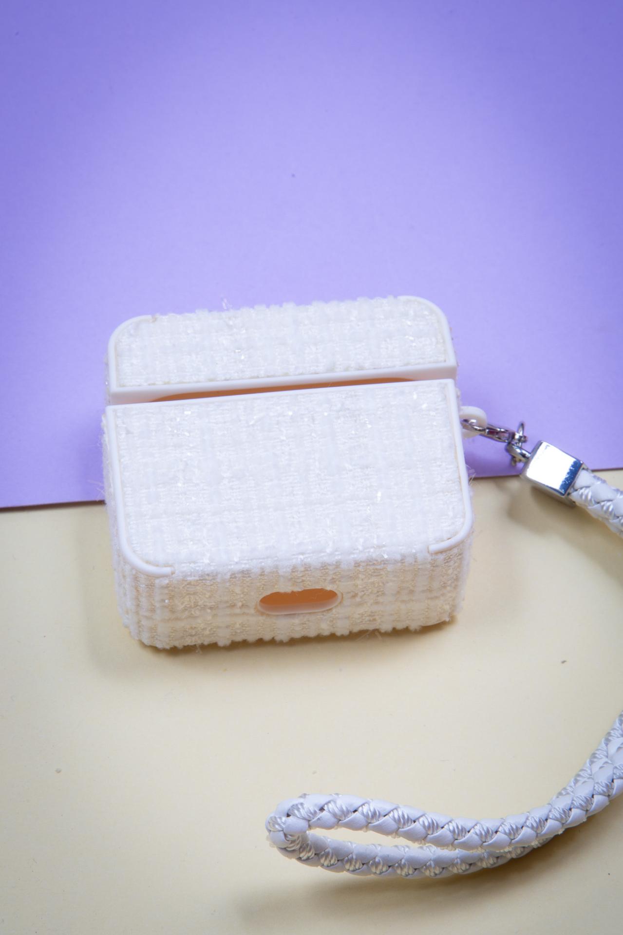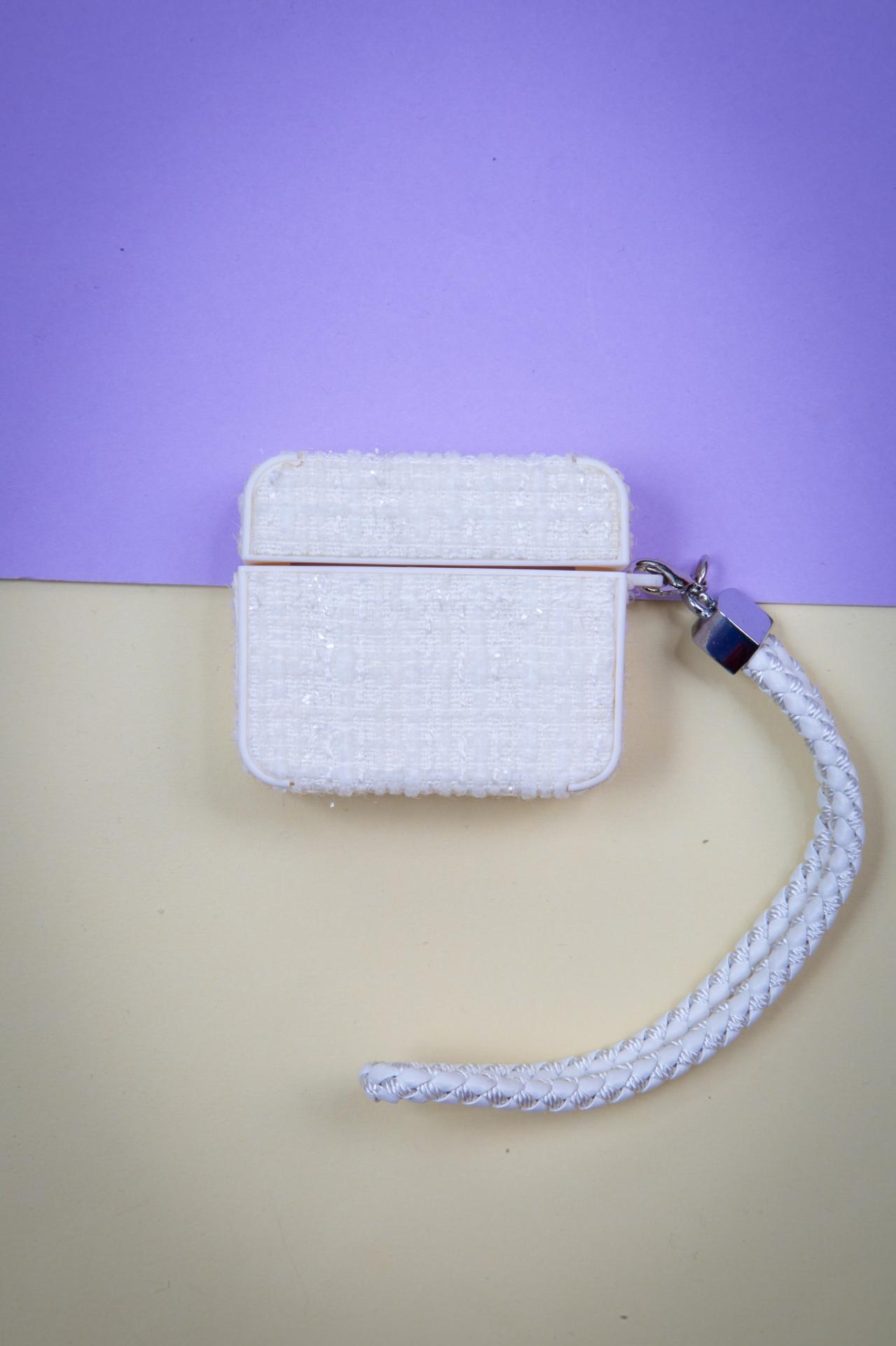 A white tweed AirPods case with a matching braided wrist strap for a soft elegant finish.