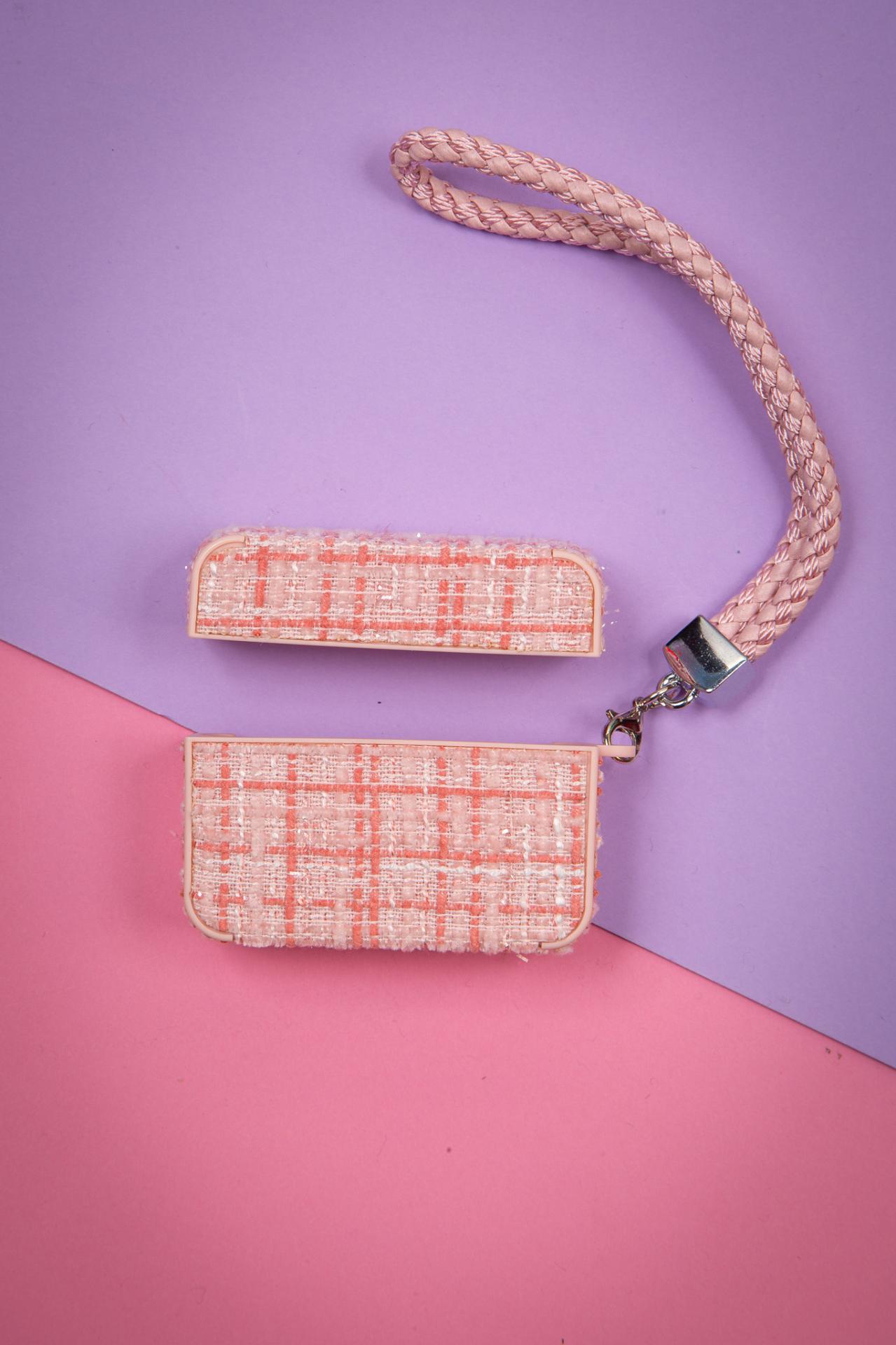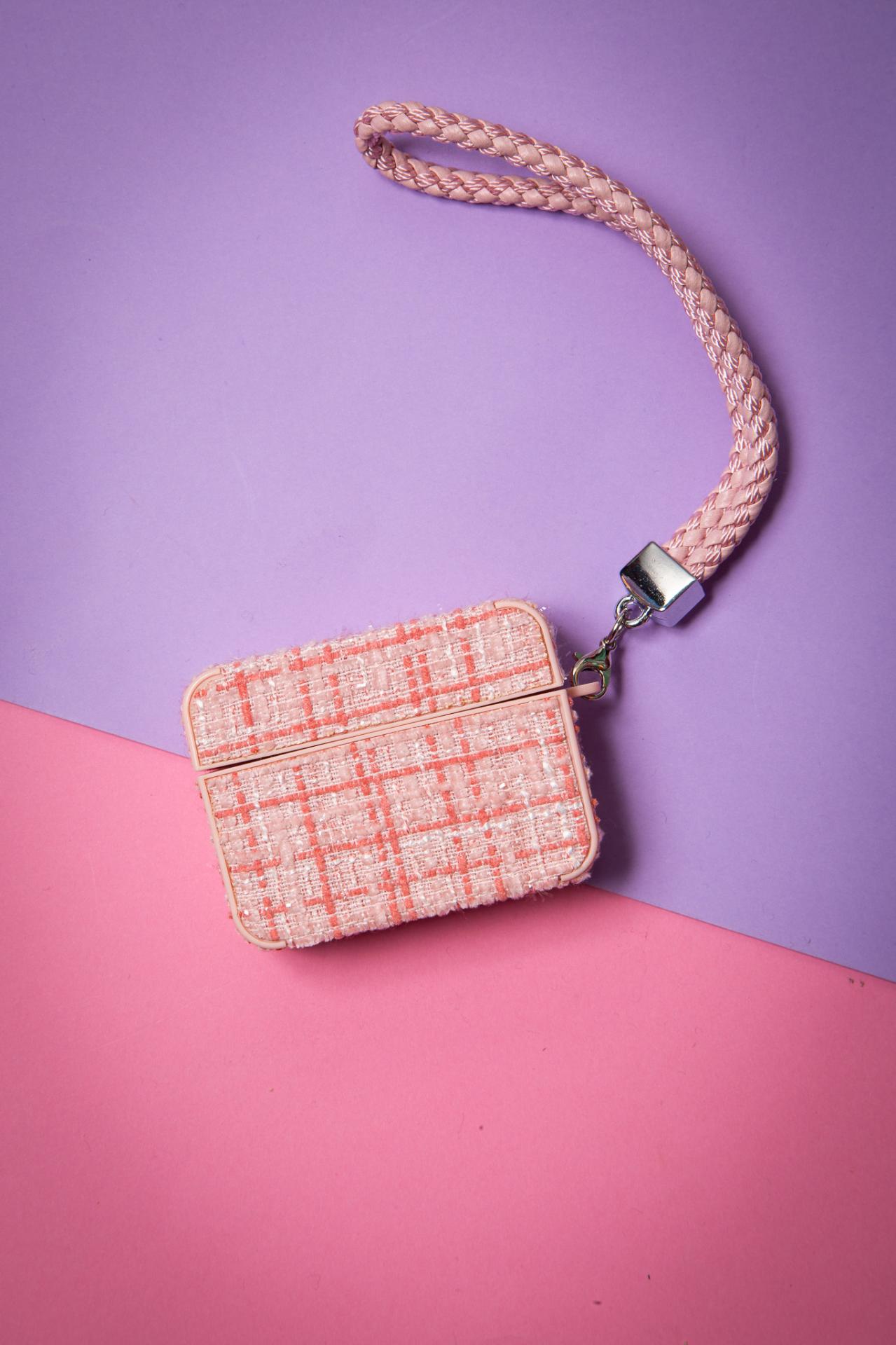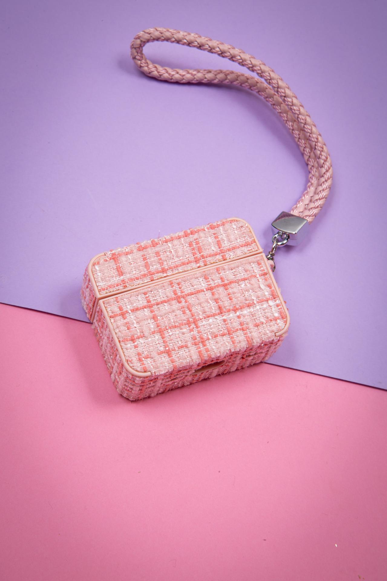A soft pink tweed AirPods case with a matching braided wrist strap for a cute and practical finish.