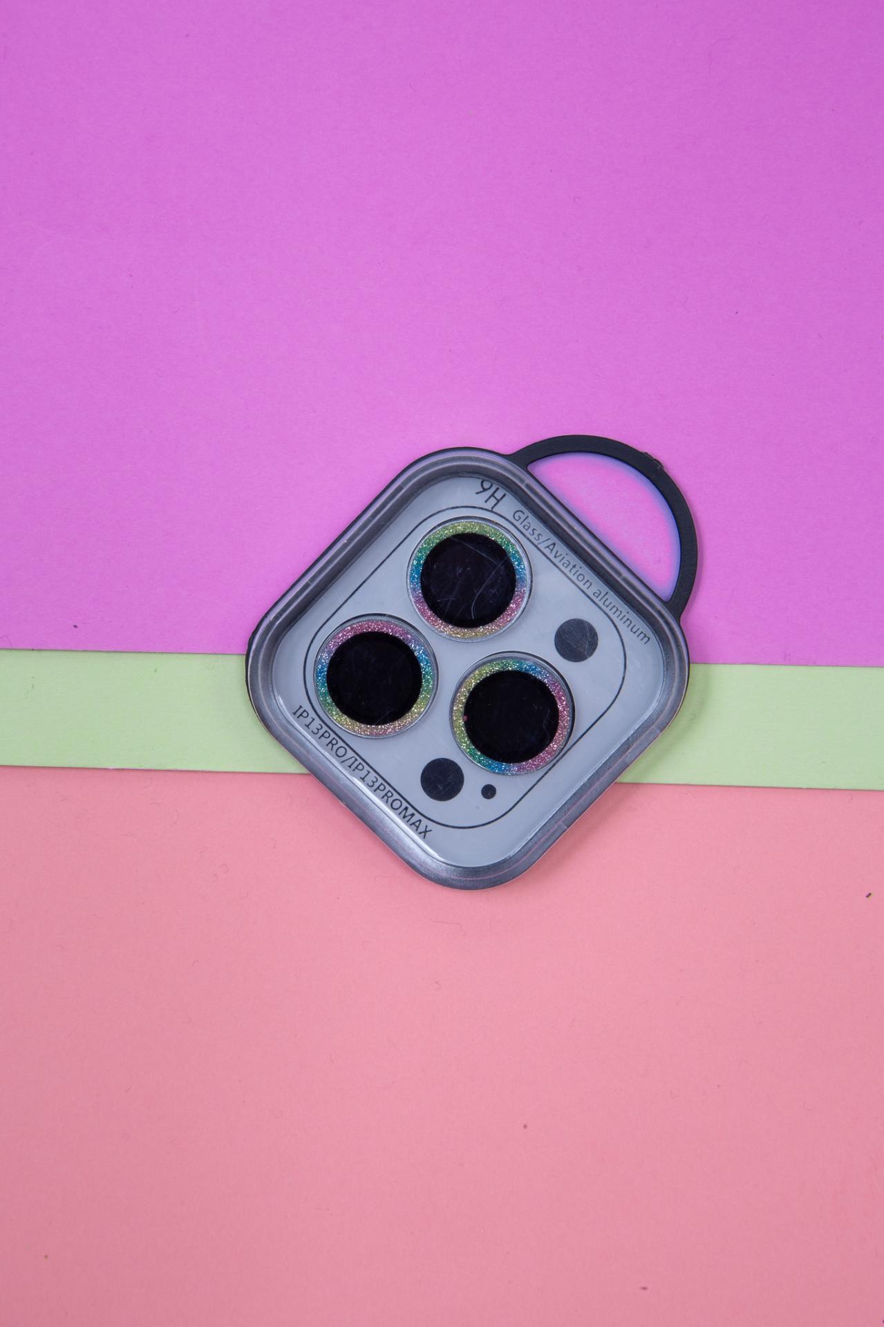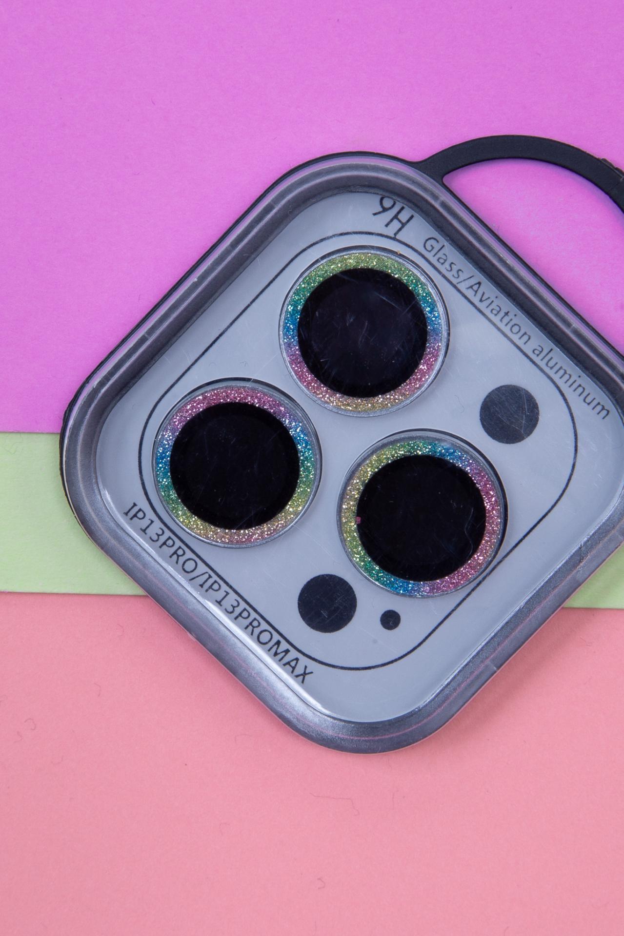 A set of colorful glitter camera lens protectors designed to fit iPhone 13 Pro and iPhone 13 Pro Max.