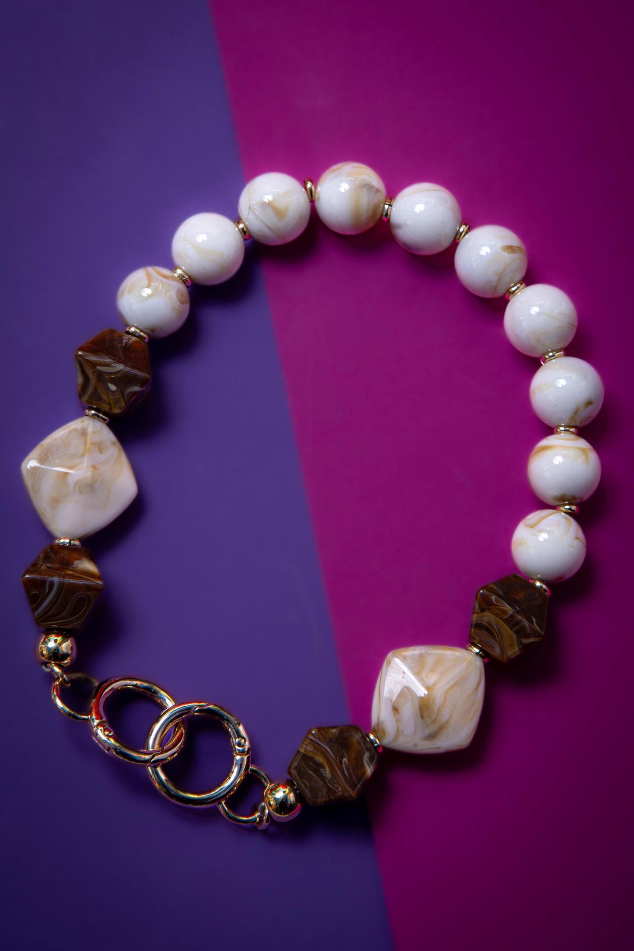 A cream and caramel marbled beaded phone chain with gold rings for a warm elegant finish.