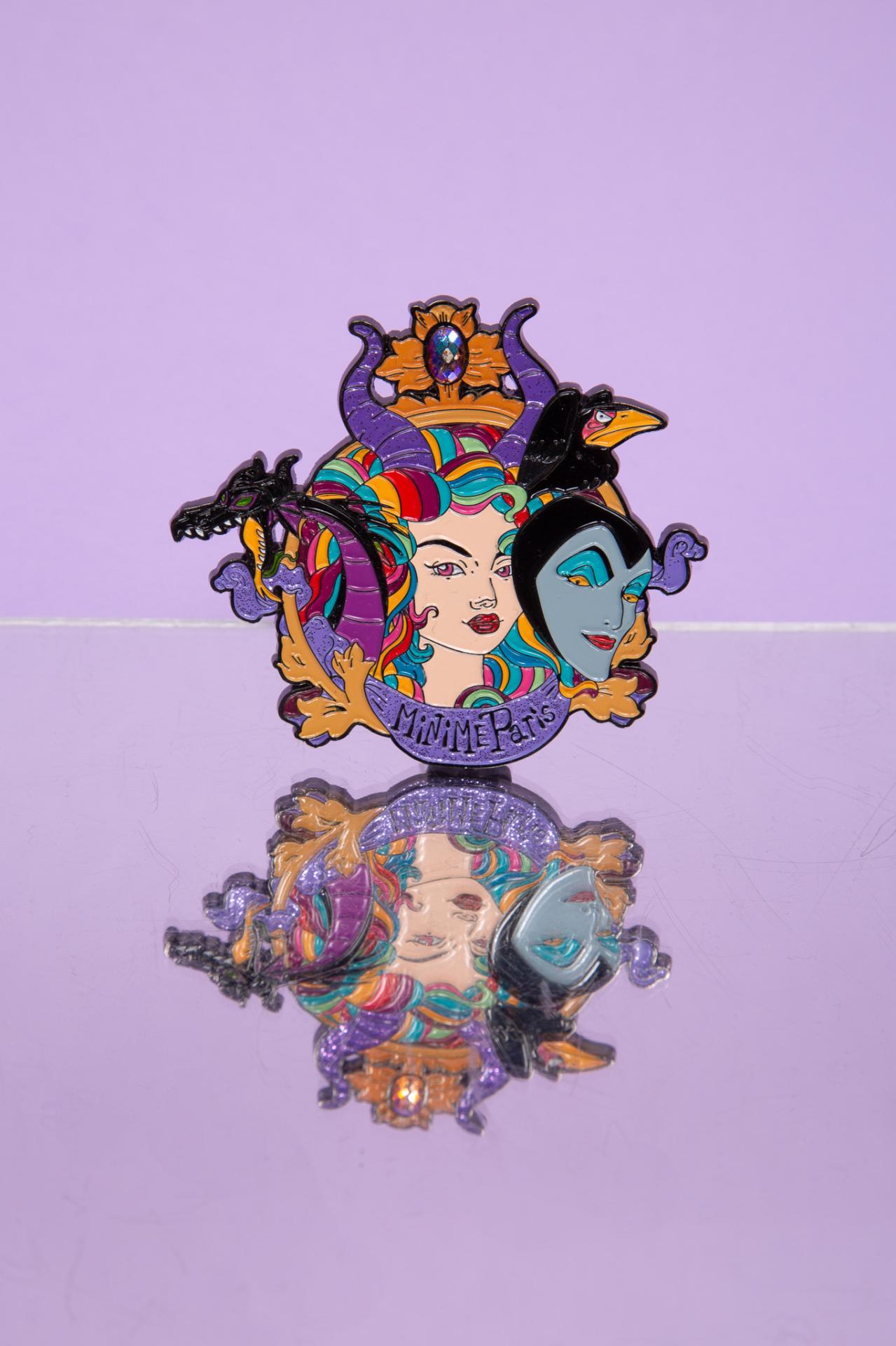 A colorful enamel pin featuring an enchanting dual faced figure with horns, a raven, and dramatic fantasy...