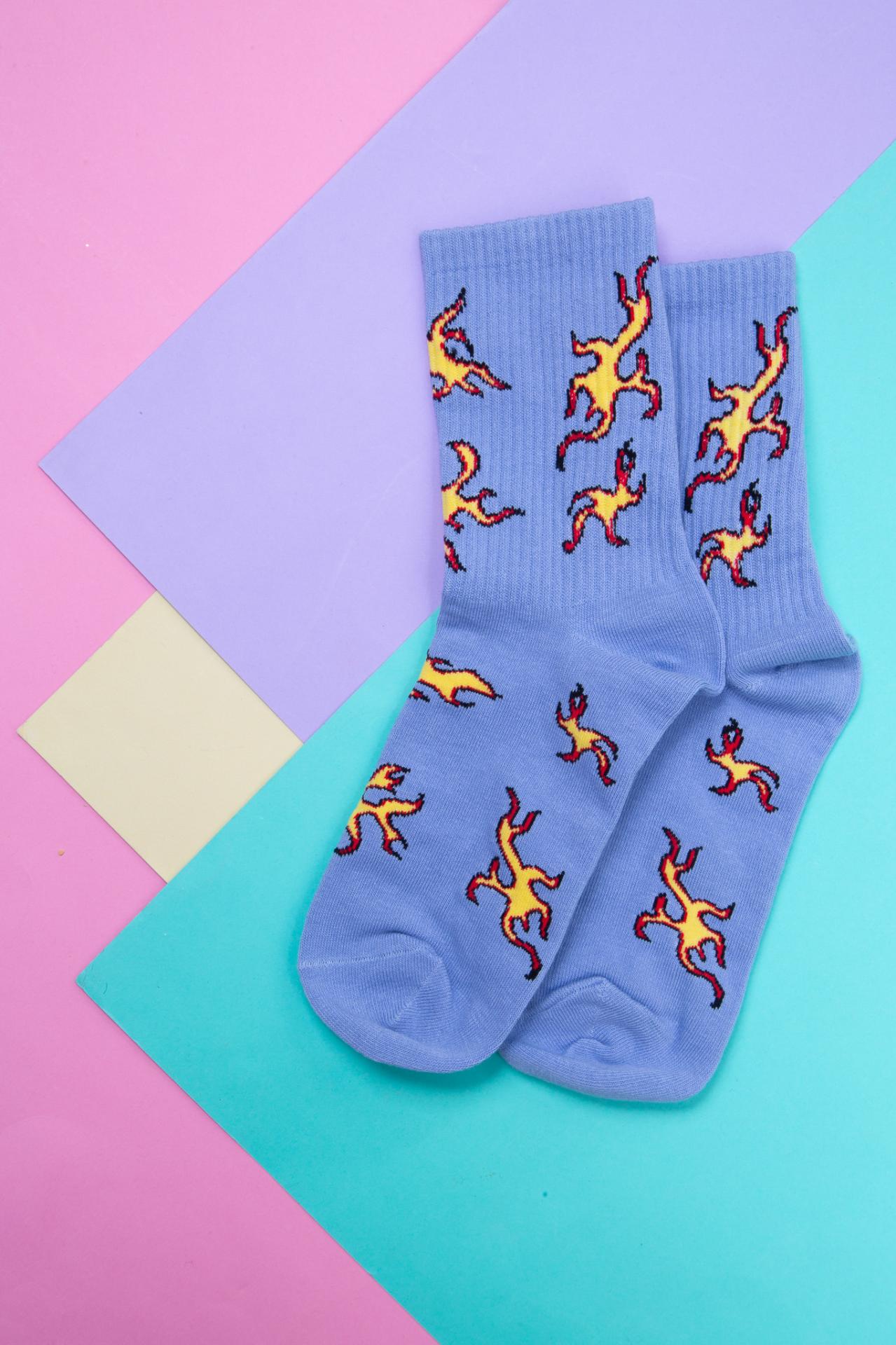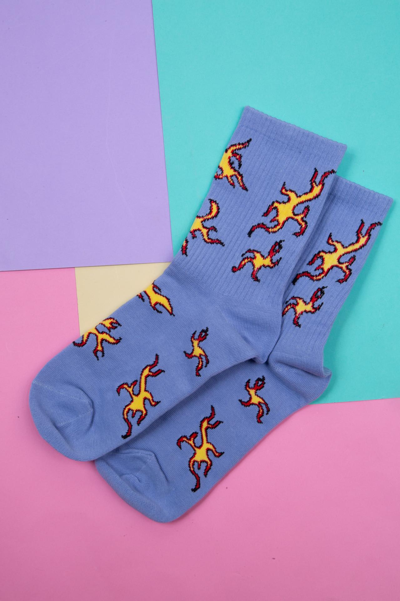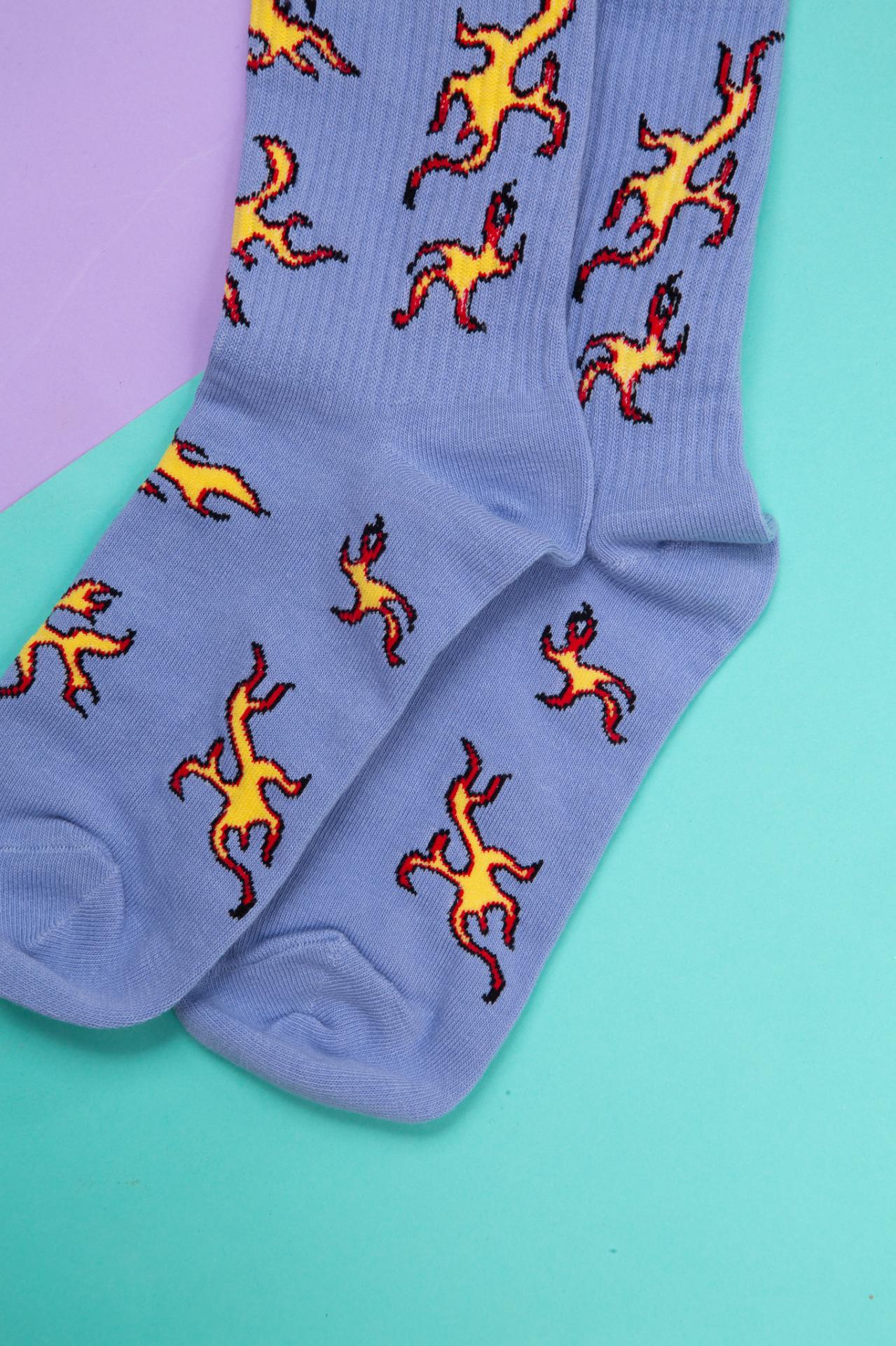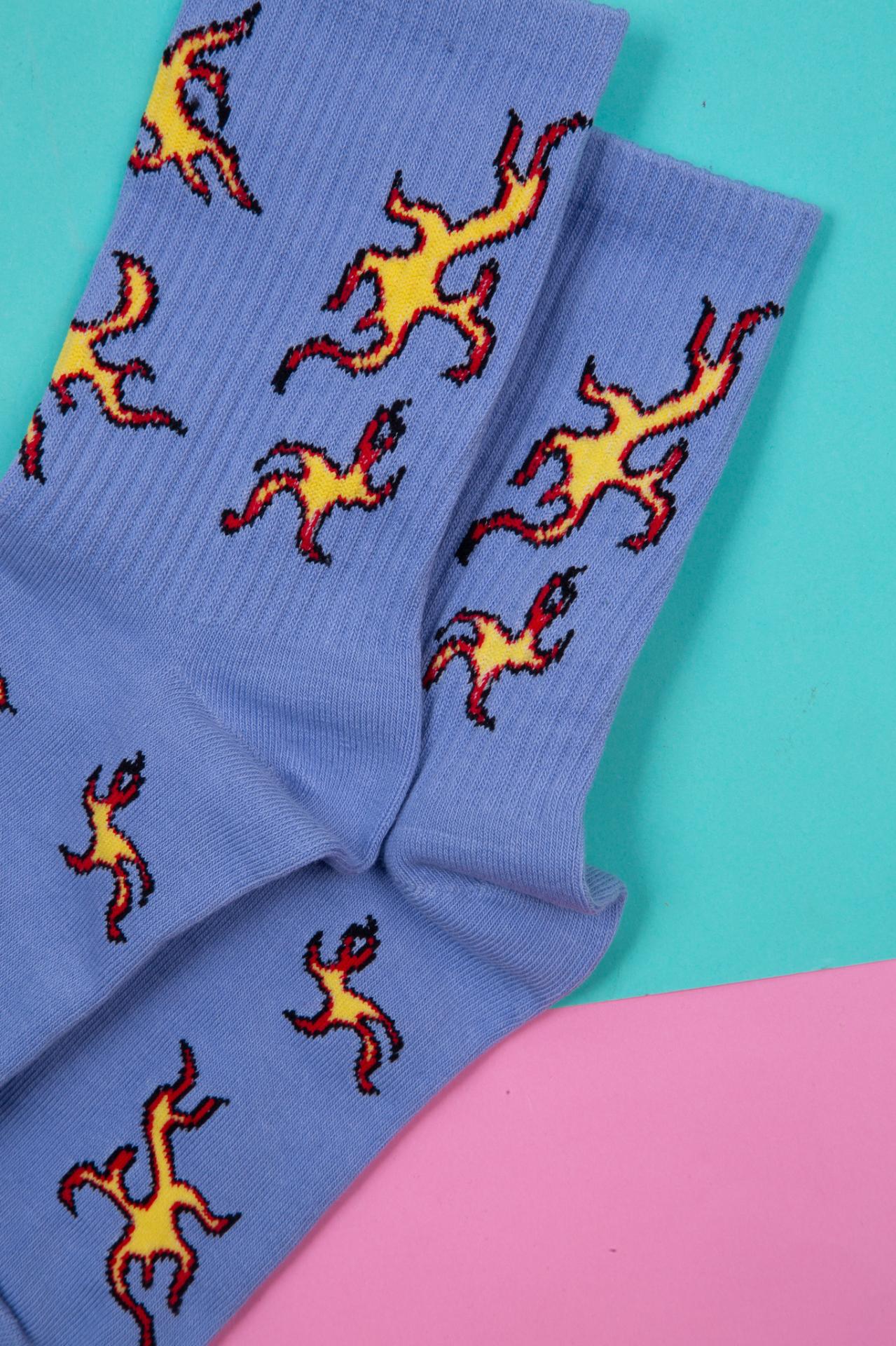 Blue socks with a fire pattern.