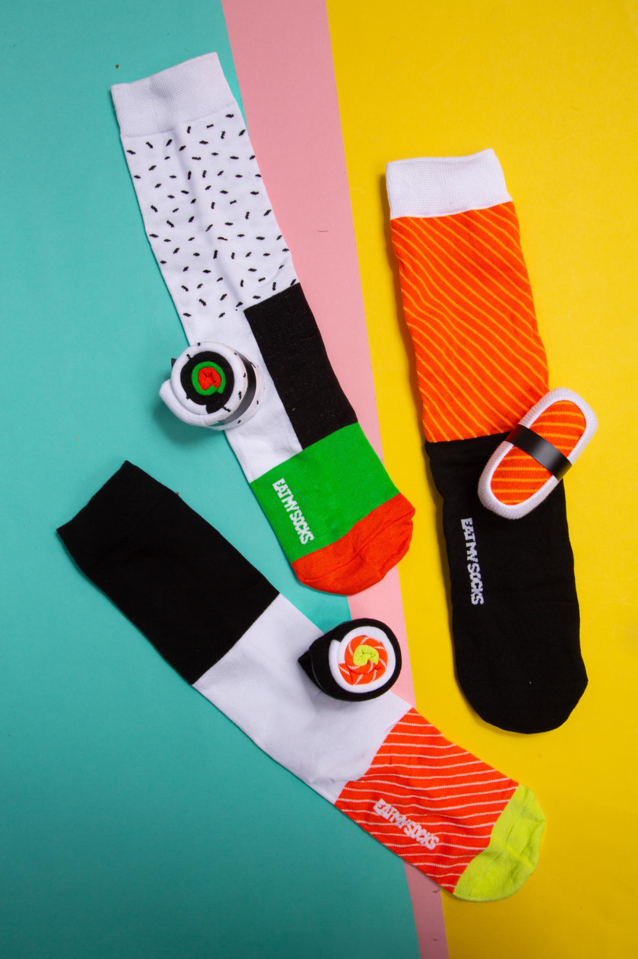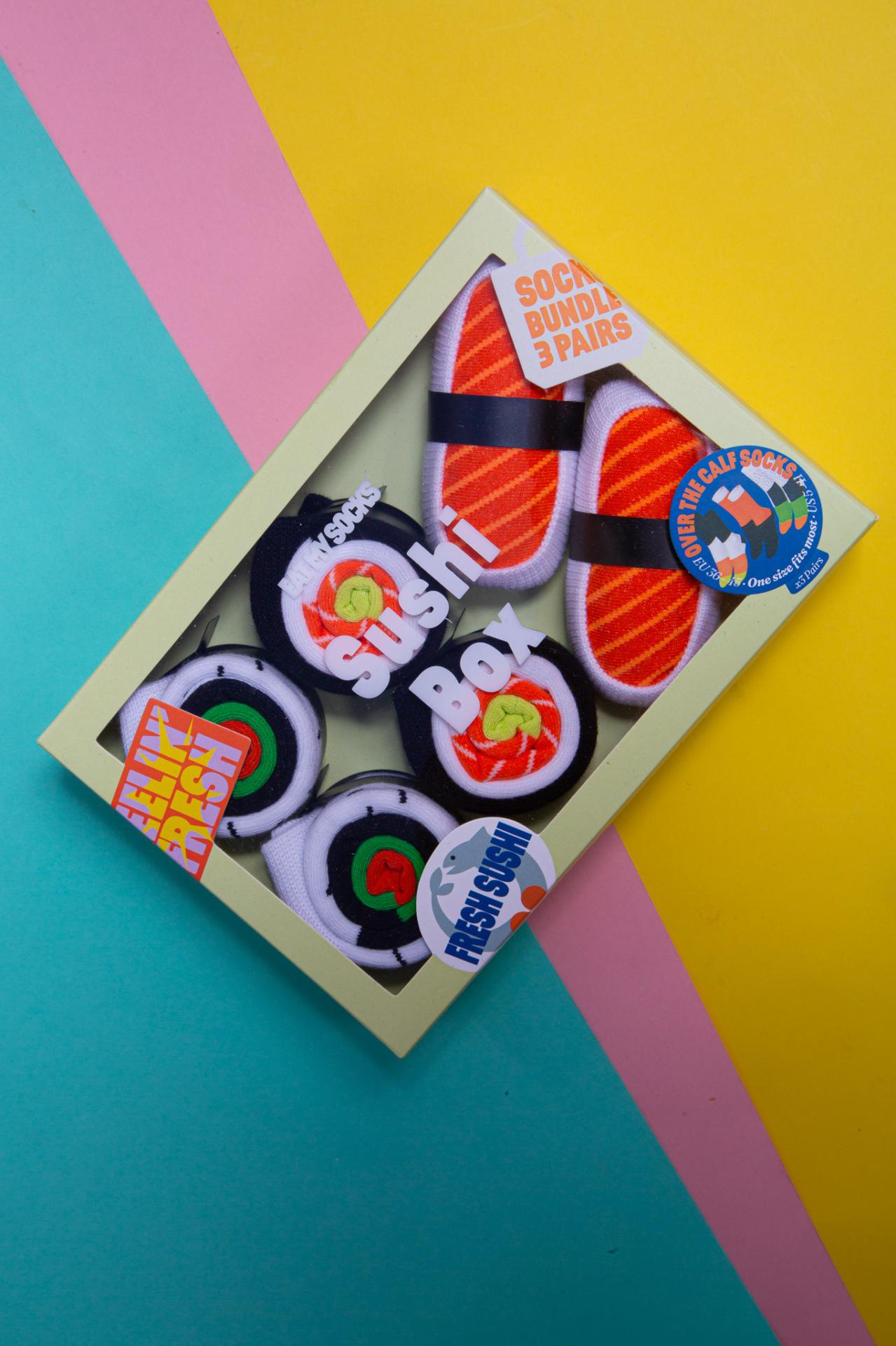 Three pairs of socks packaged like a sushi box from Eat My Socks.
