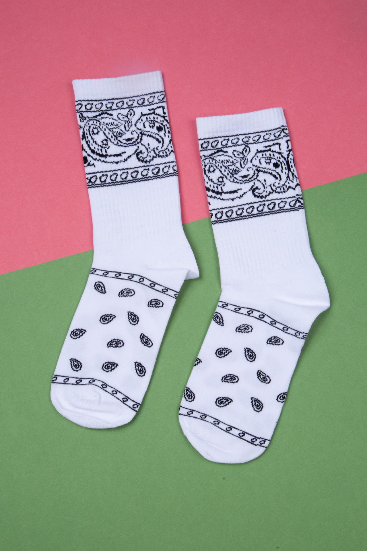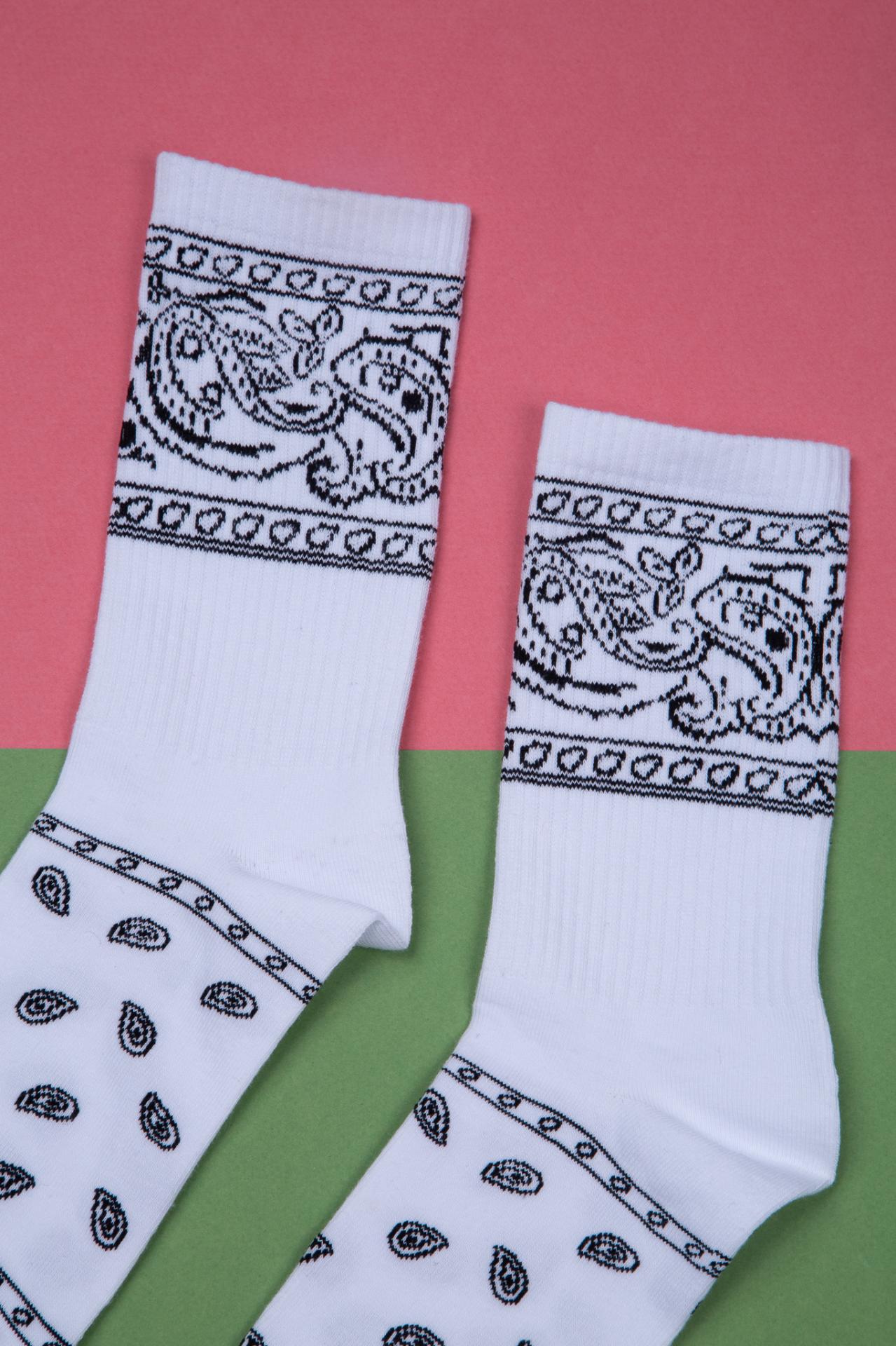 White socks with a black bandana pattern.