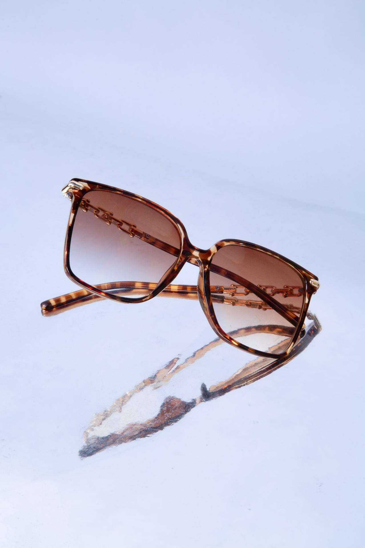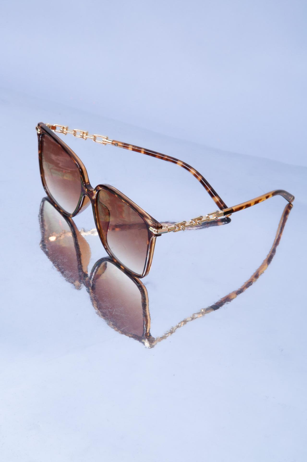 A pair of tortoiseshell square sunglasses with warm brown lenses and a subtle chain motif.