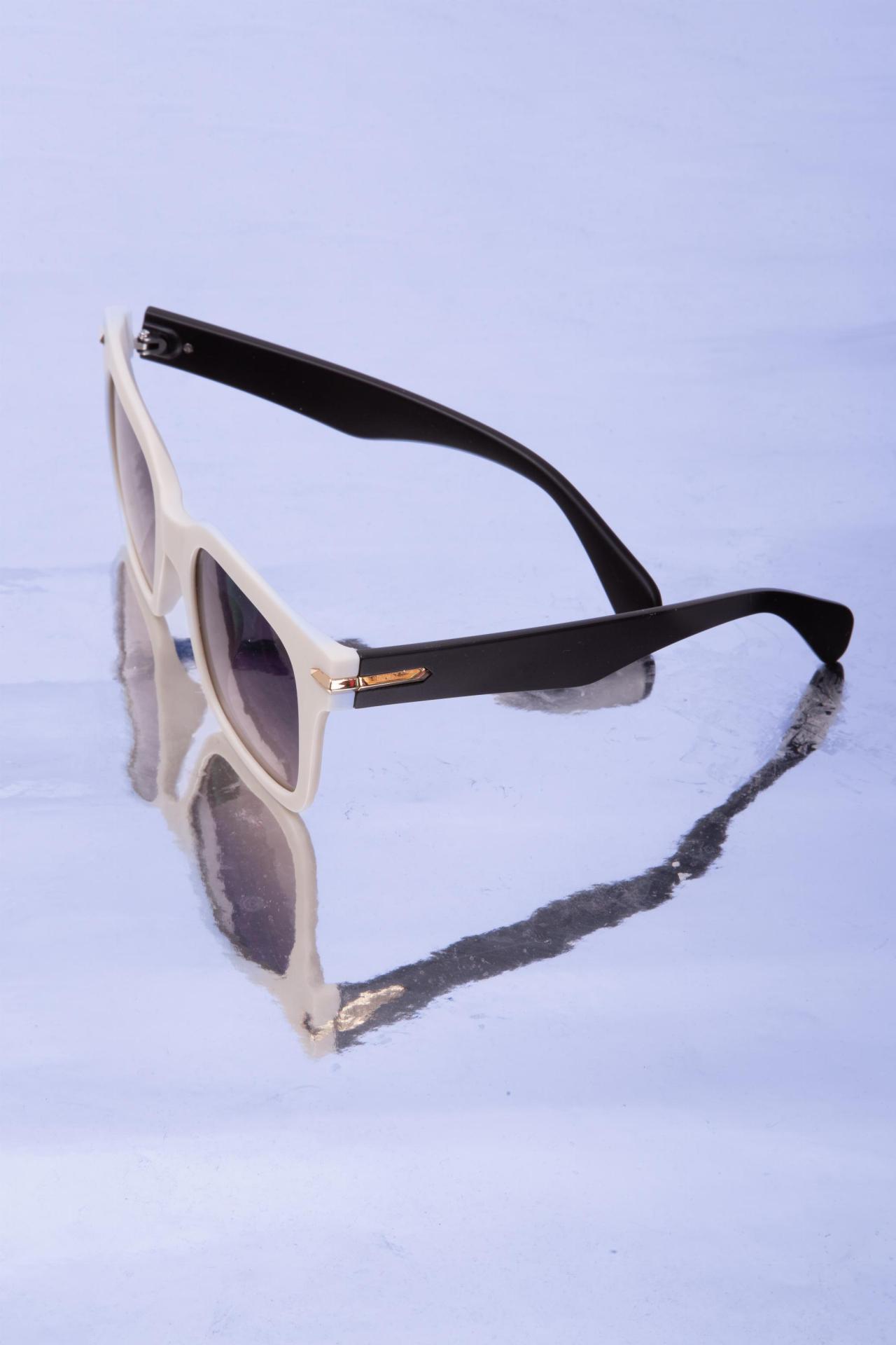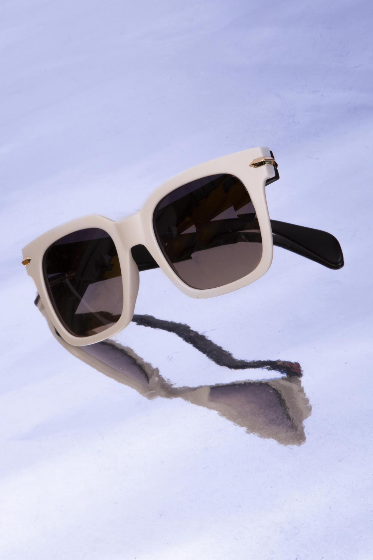 A pair of cream square sunglasses with dark lenses and subtle gold accents for a chic refined look.