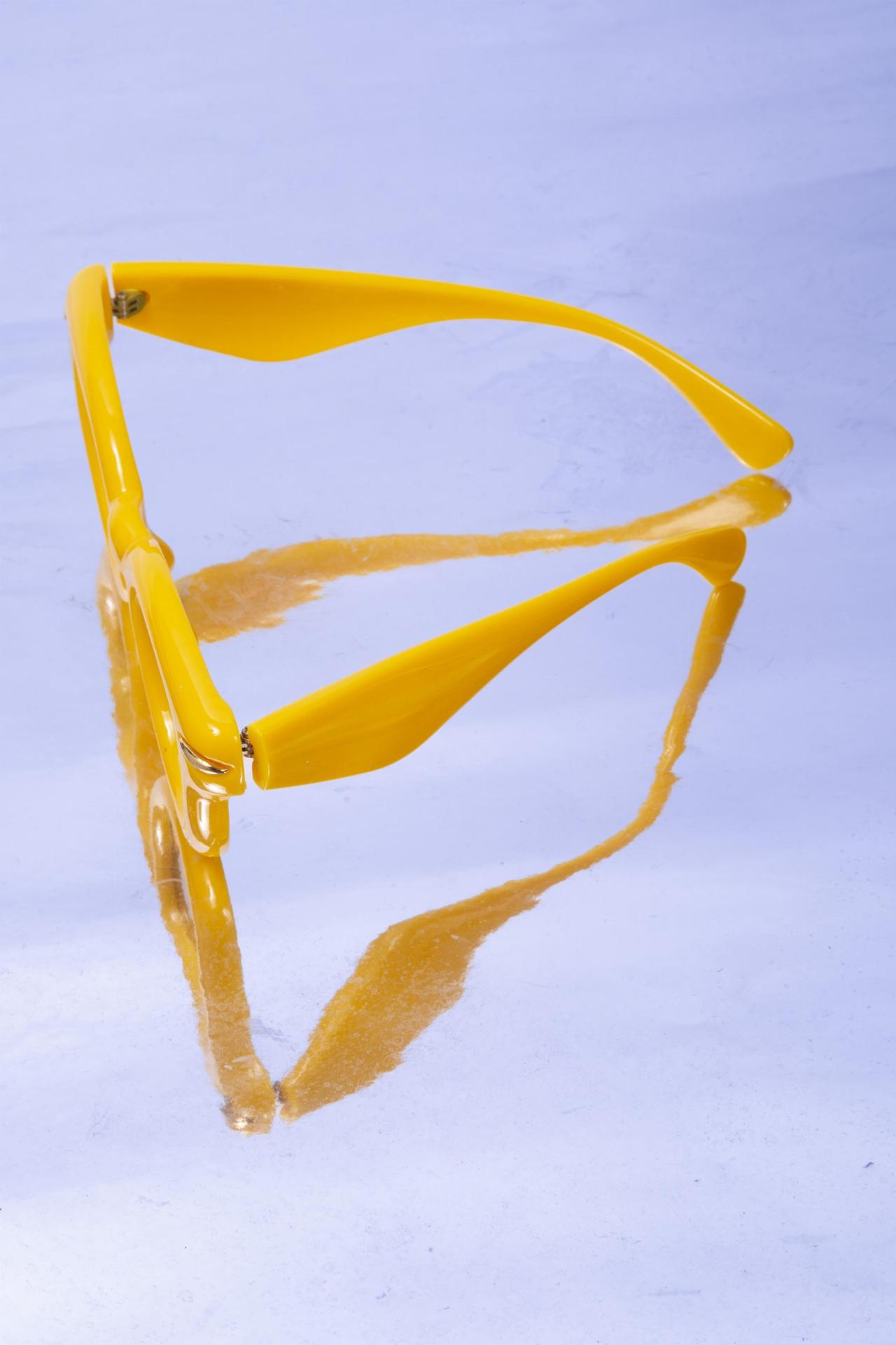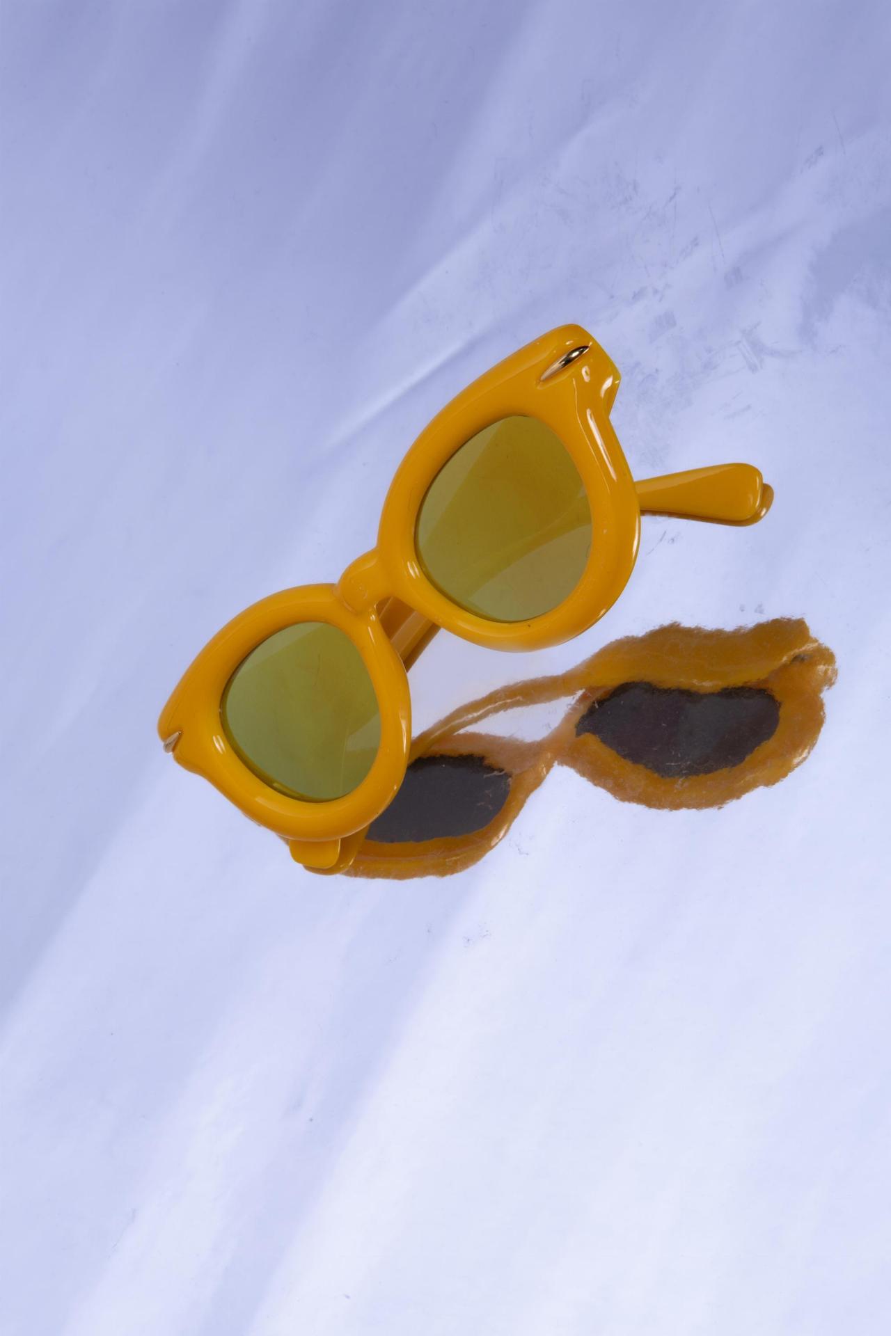 A pair of bright yellow oval sunglasses with tinted lenses for a fun stylish look.