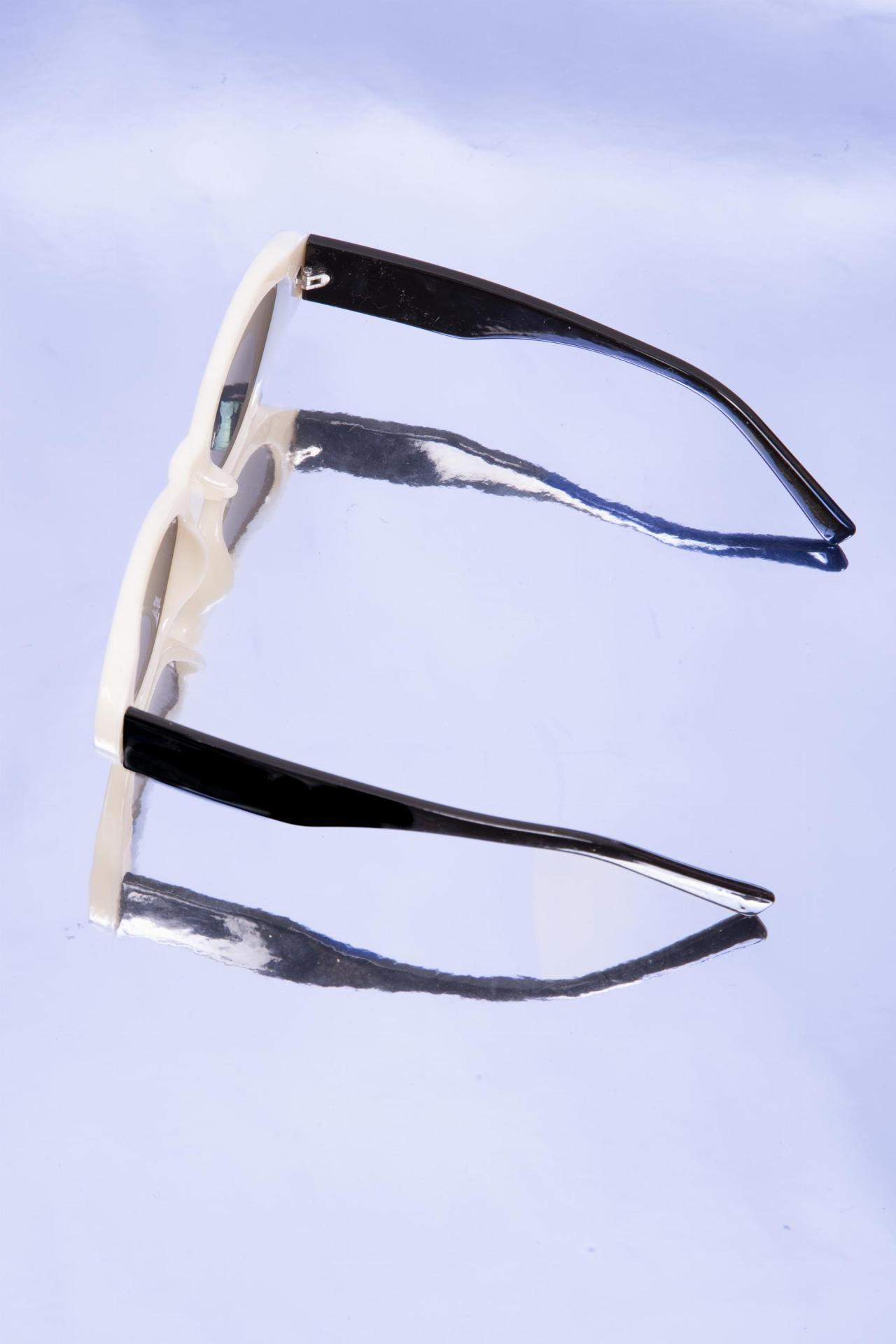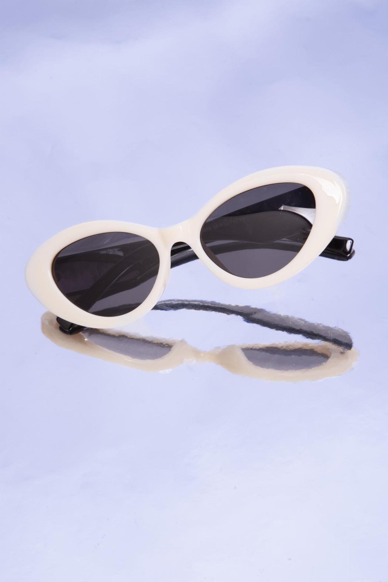 A pair of glossy white oval sunglasses with dark lenses for a sleek retro look.