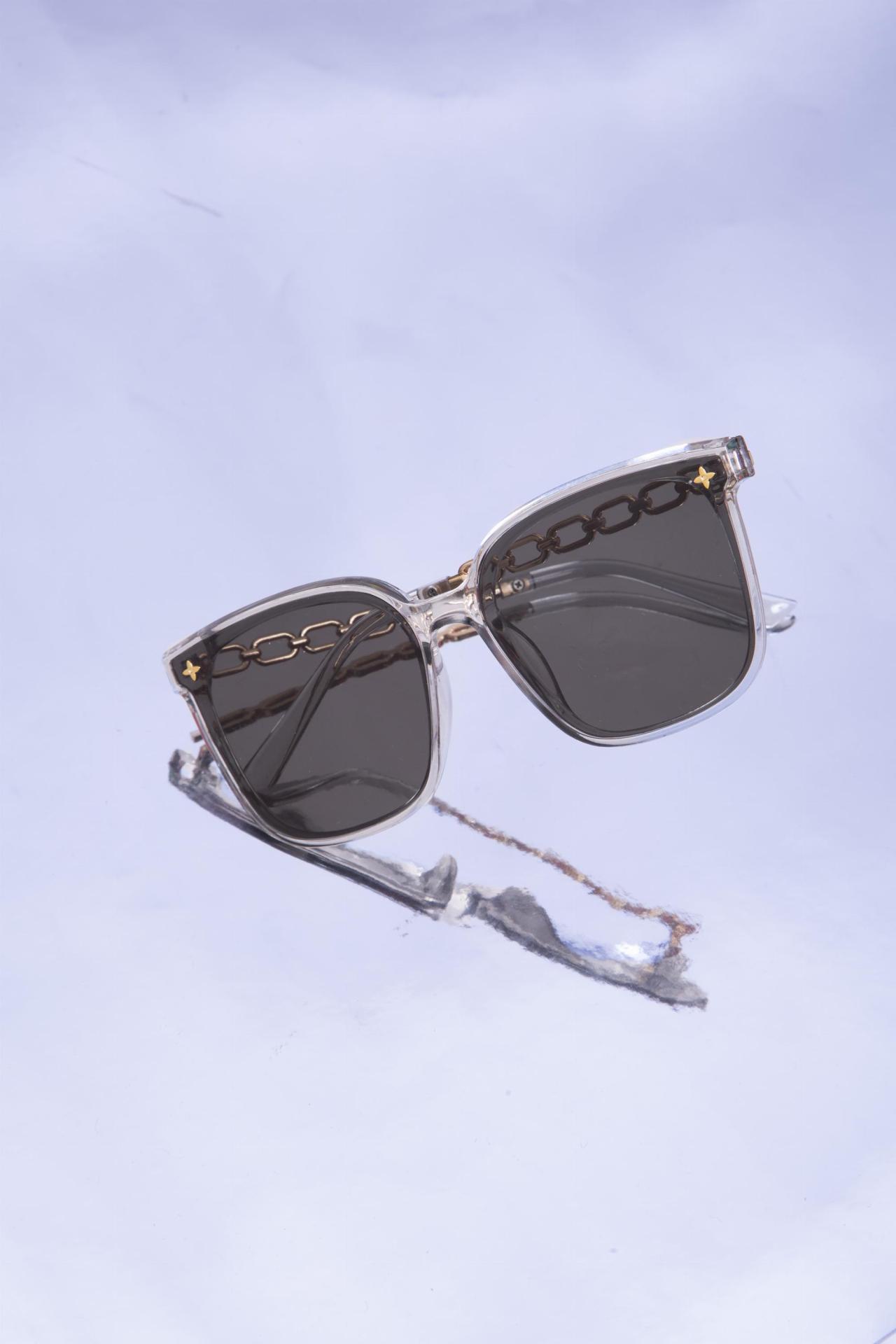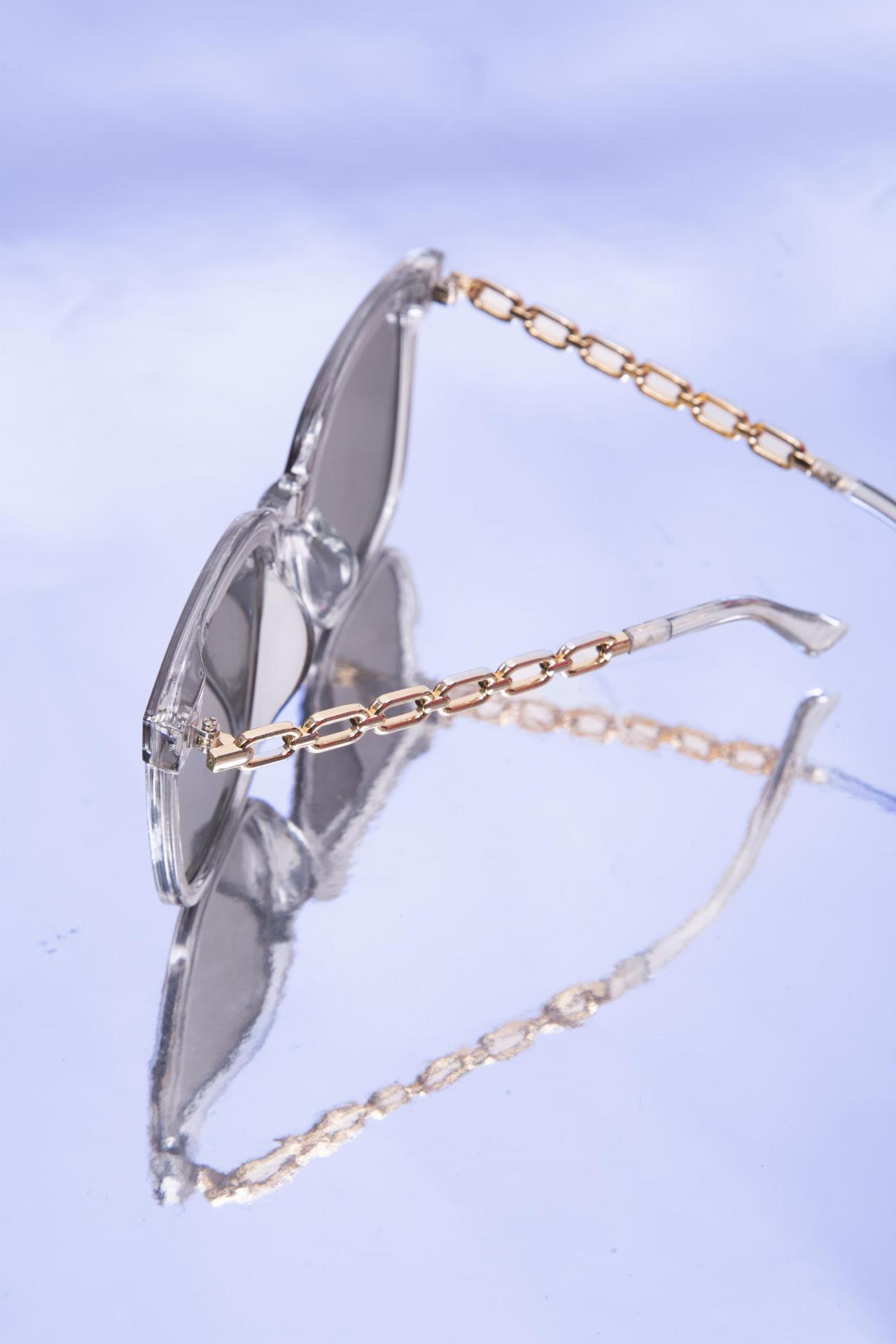 A pair of clear square sunglasses with dark lenses and a subtle chain-effect detail for a modern chic look.
