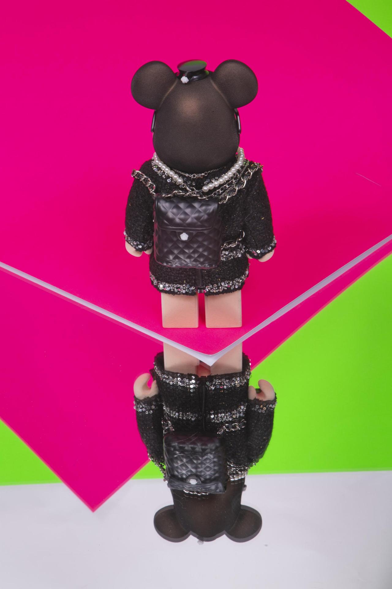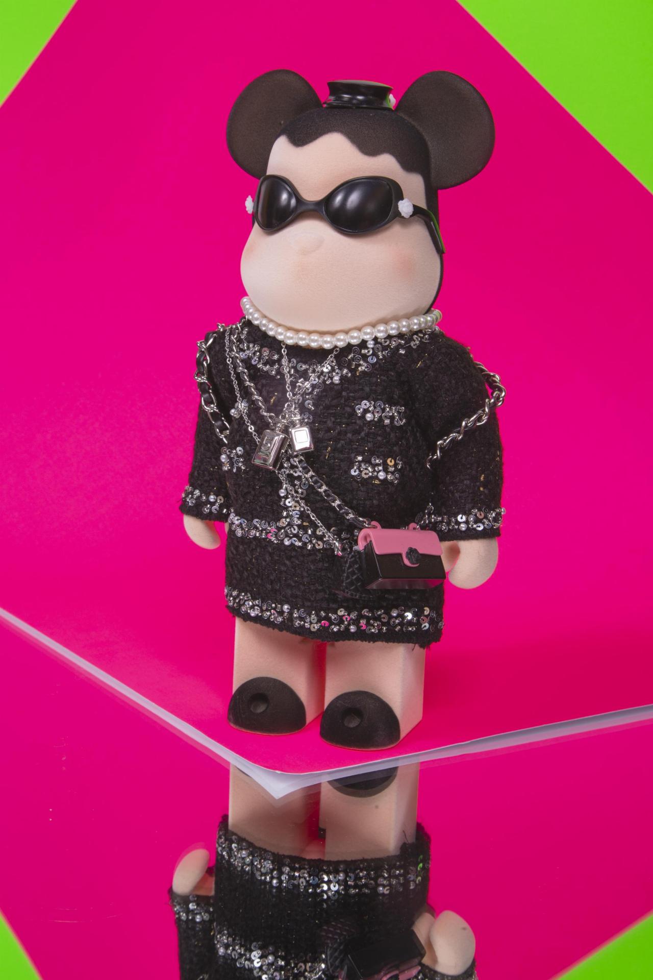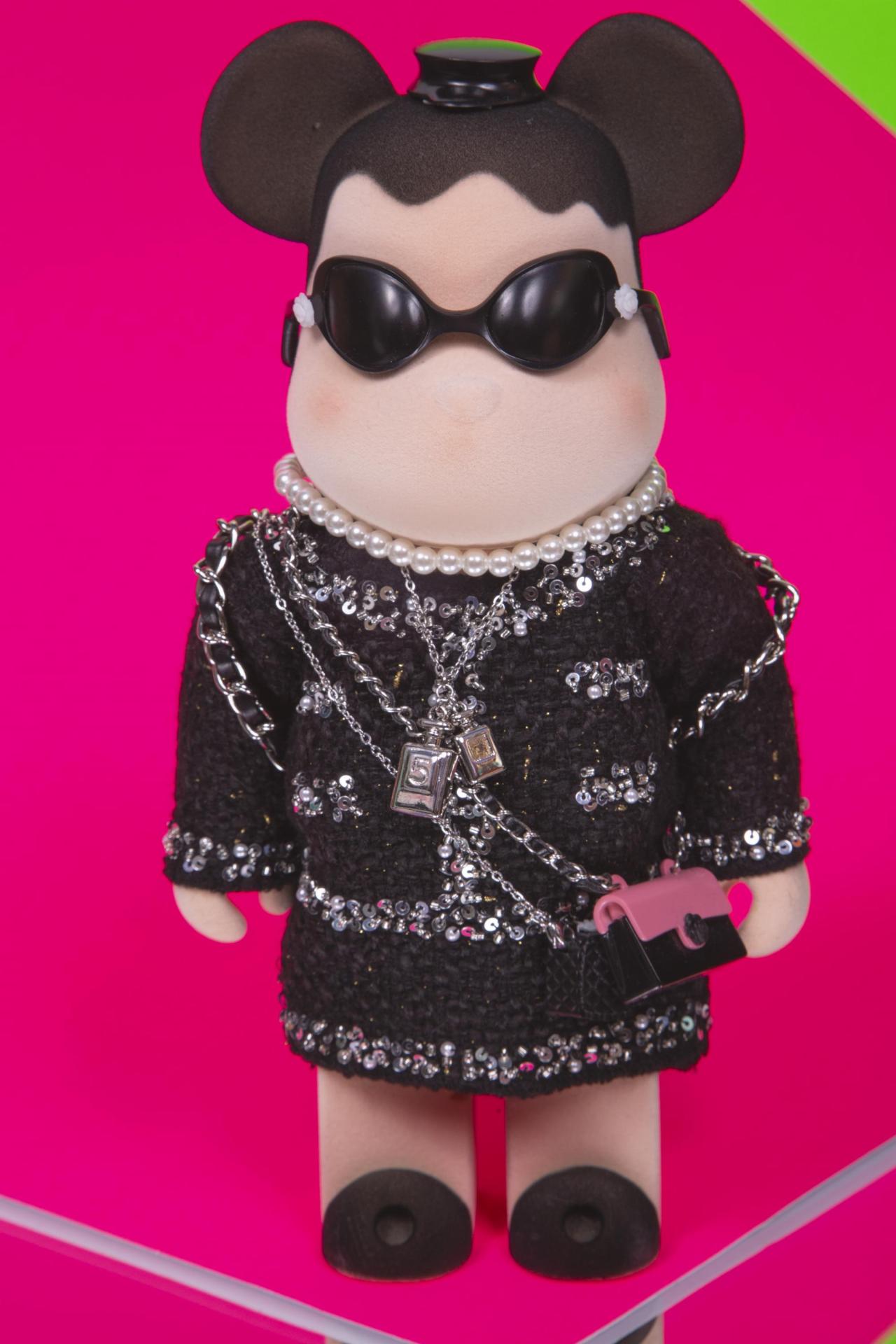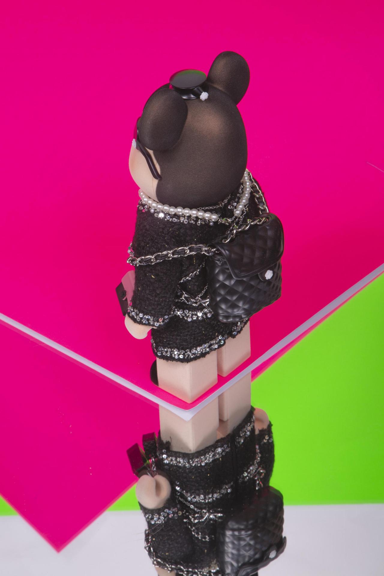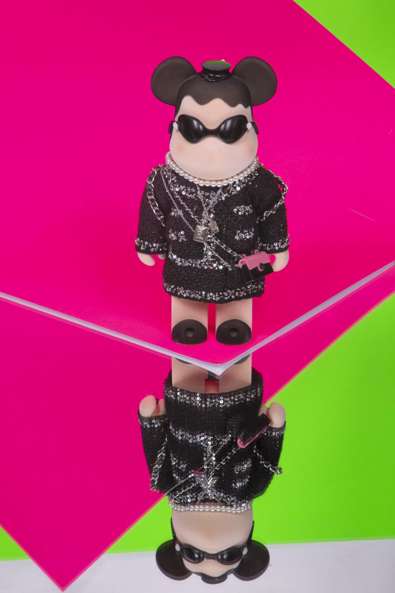 A fashionable collectible art figure dressed in a sparkling black outfit with pearls, chains, and statement sunglasses.