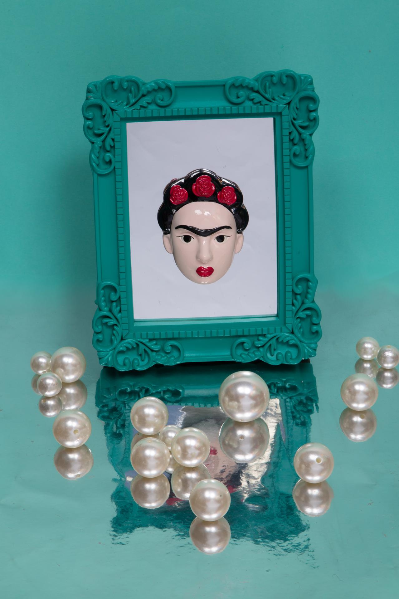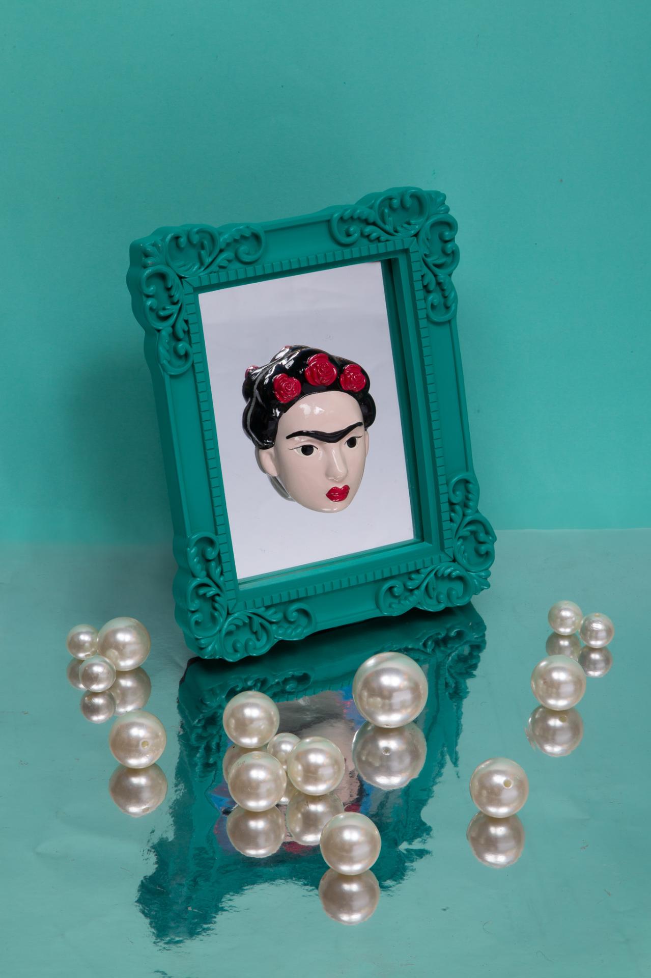 A decorative frame mirror featuring a sculpted artistic face with floral hair details.