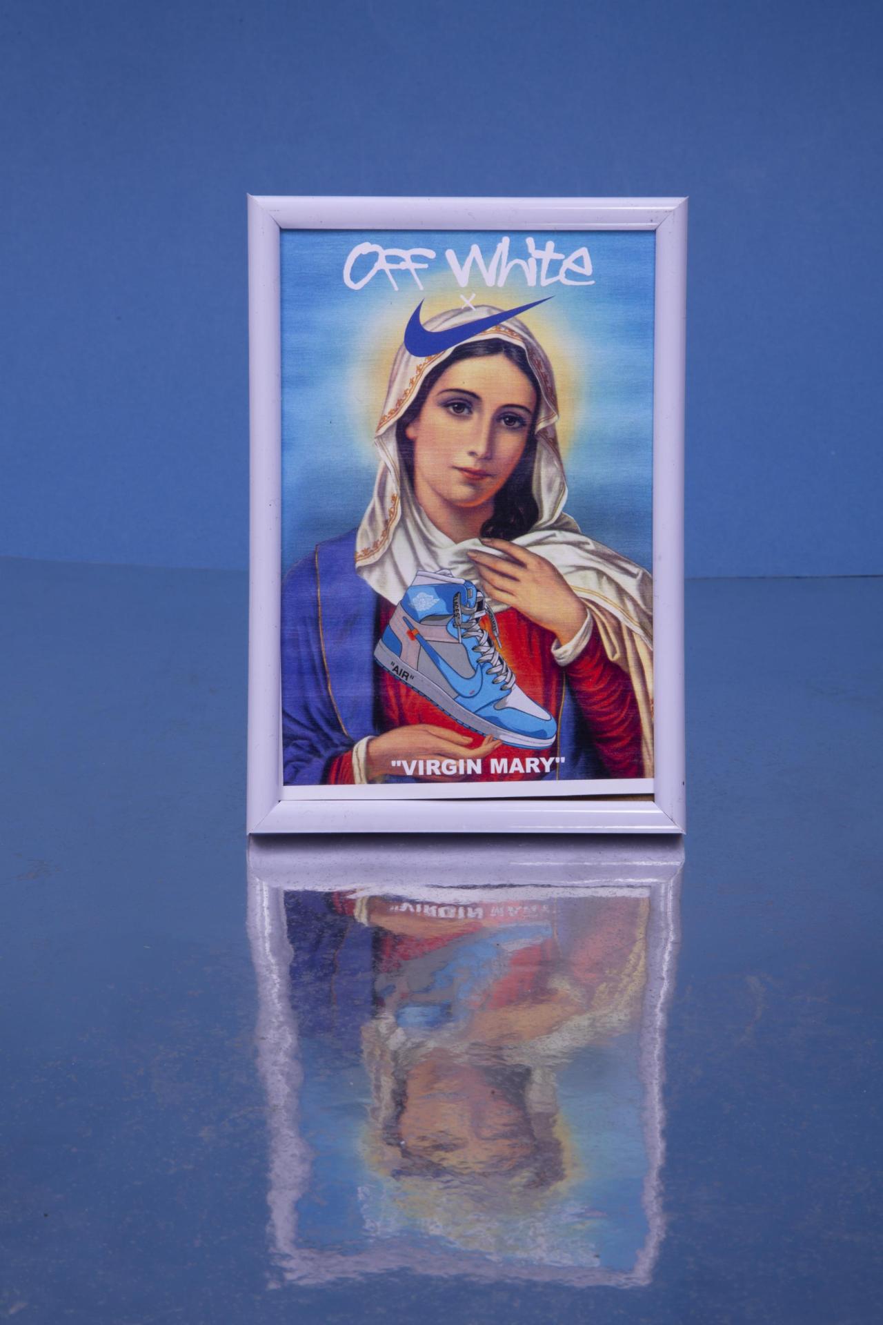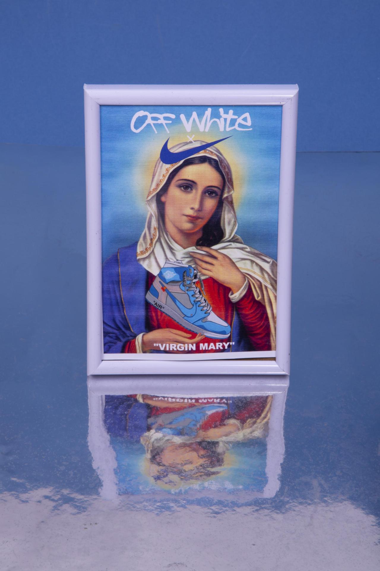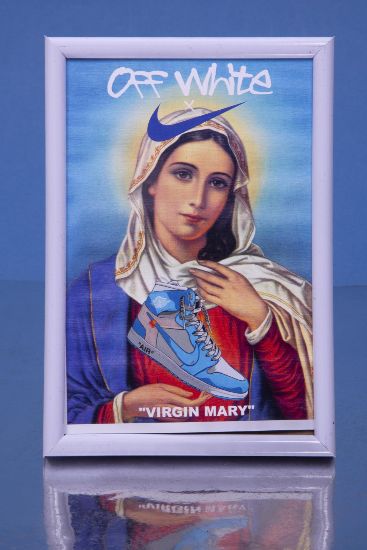A bold framed print mixing a classical portrait style with vibrant street art inspired graphics.