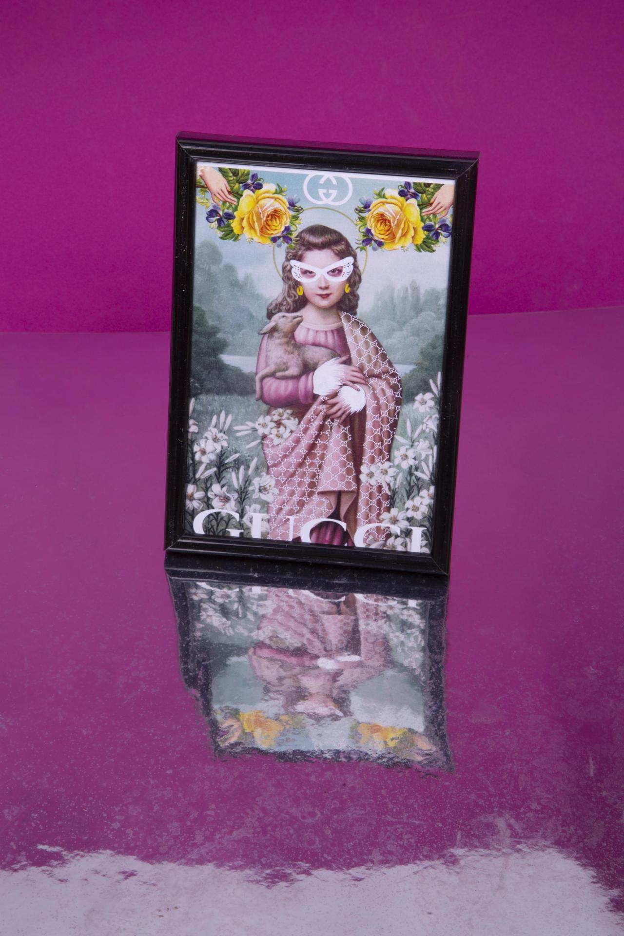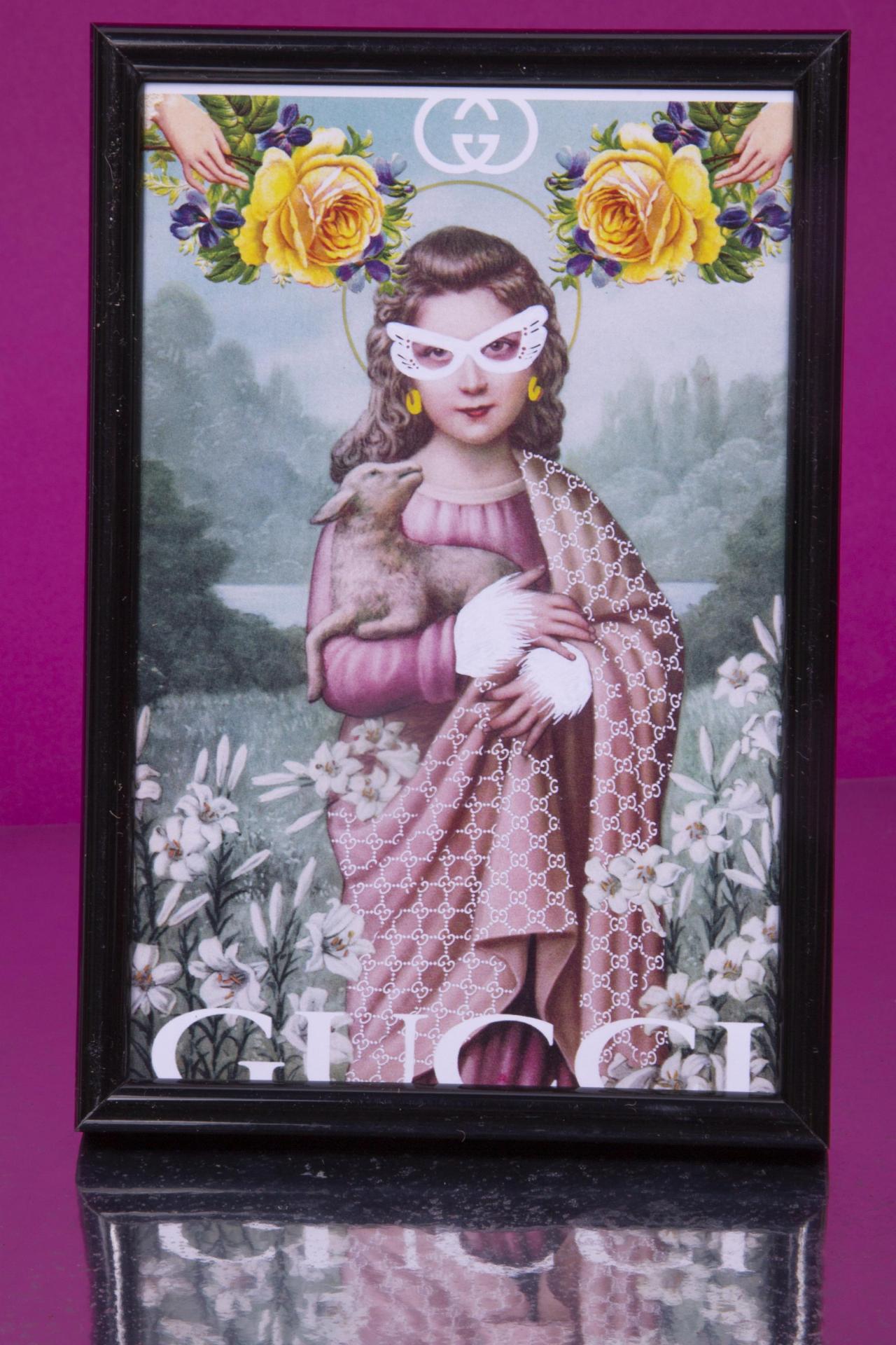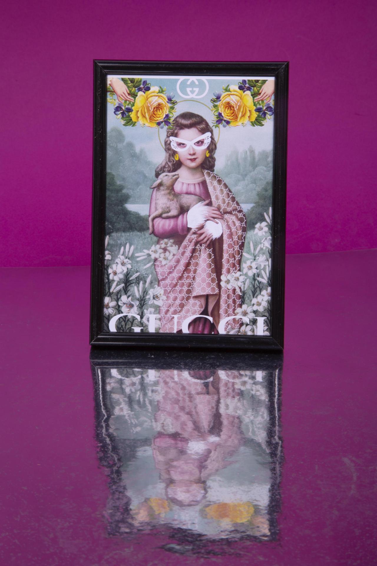 A whimsical framed print mixing a classic portrait style with playful floral and modern graphic elements.