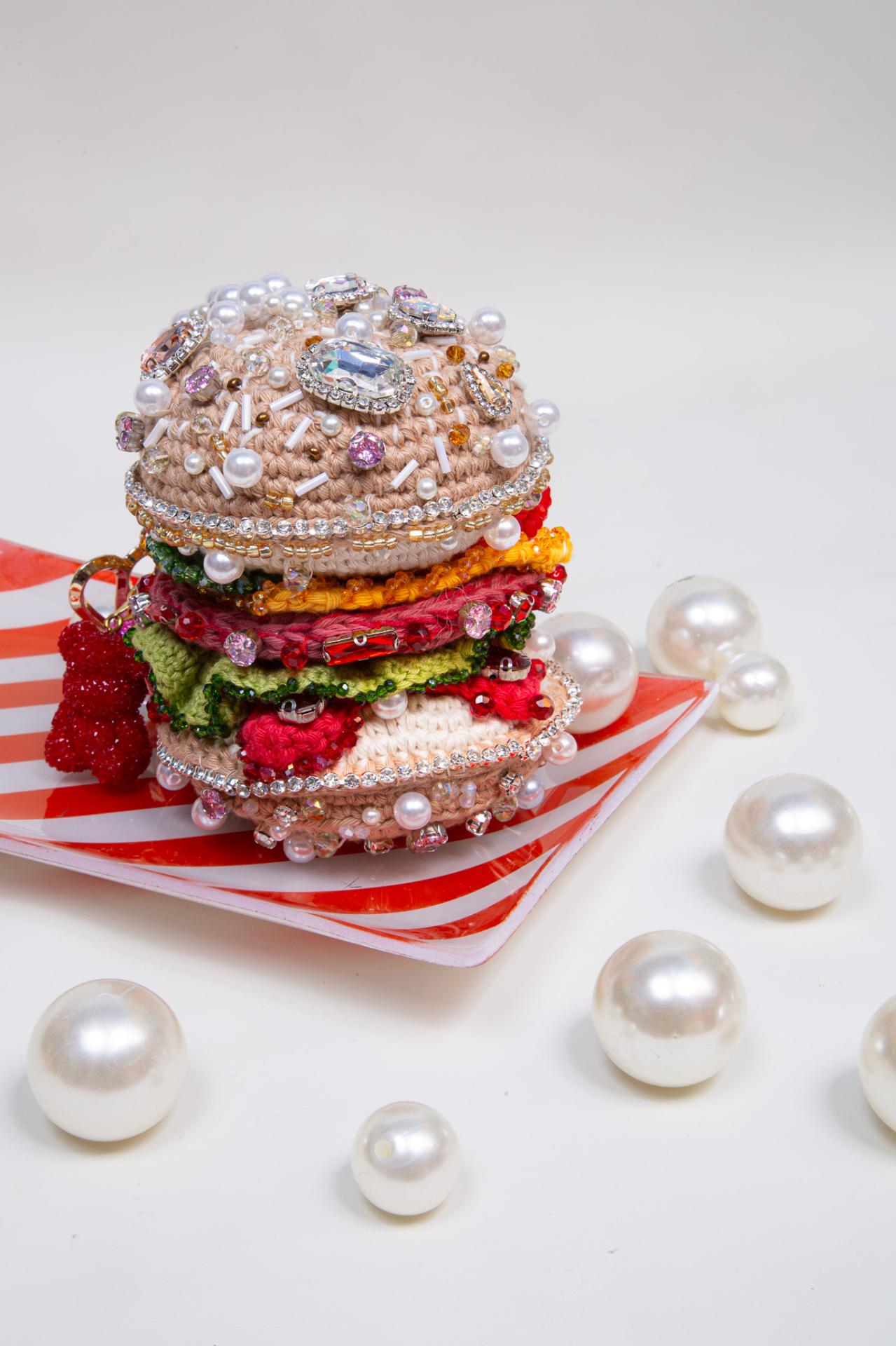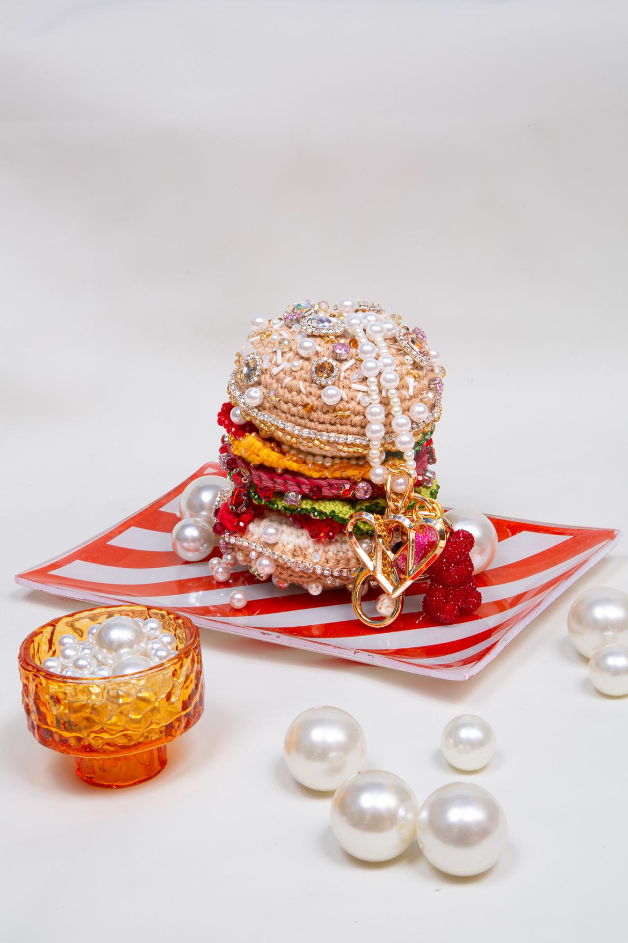 A one-of-a-kind crocheted burger stacked with glitter, pearls, and handmade sass—Burger Bling is fast food reimagined.