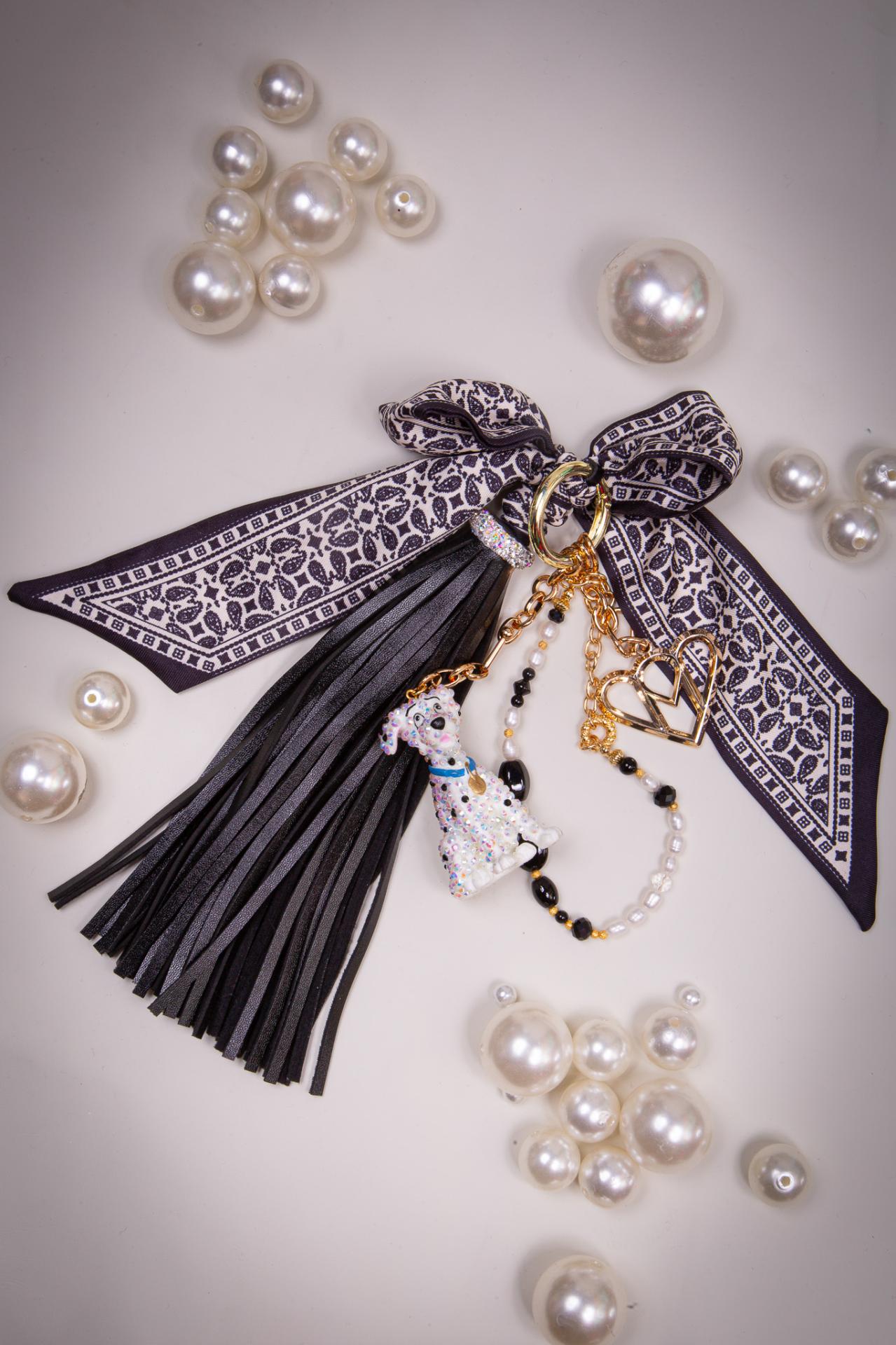 A one-of-a-kind charm with a black tassel, crystal bow, and printed satin ribbon, Noir Darling is chic with a wink.