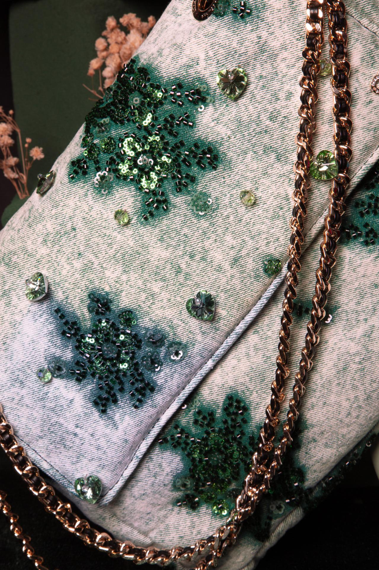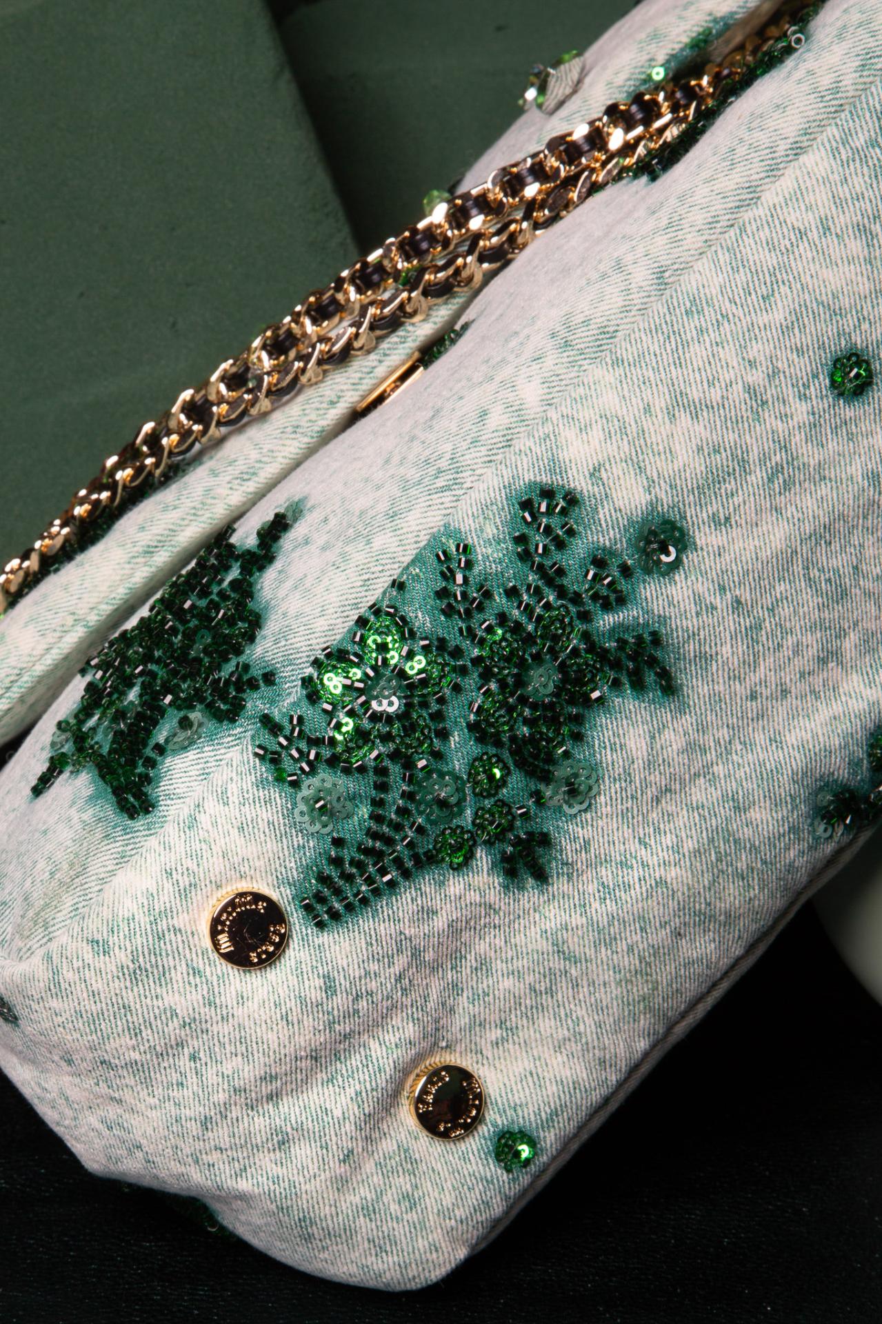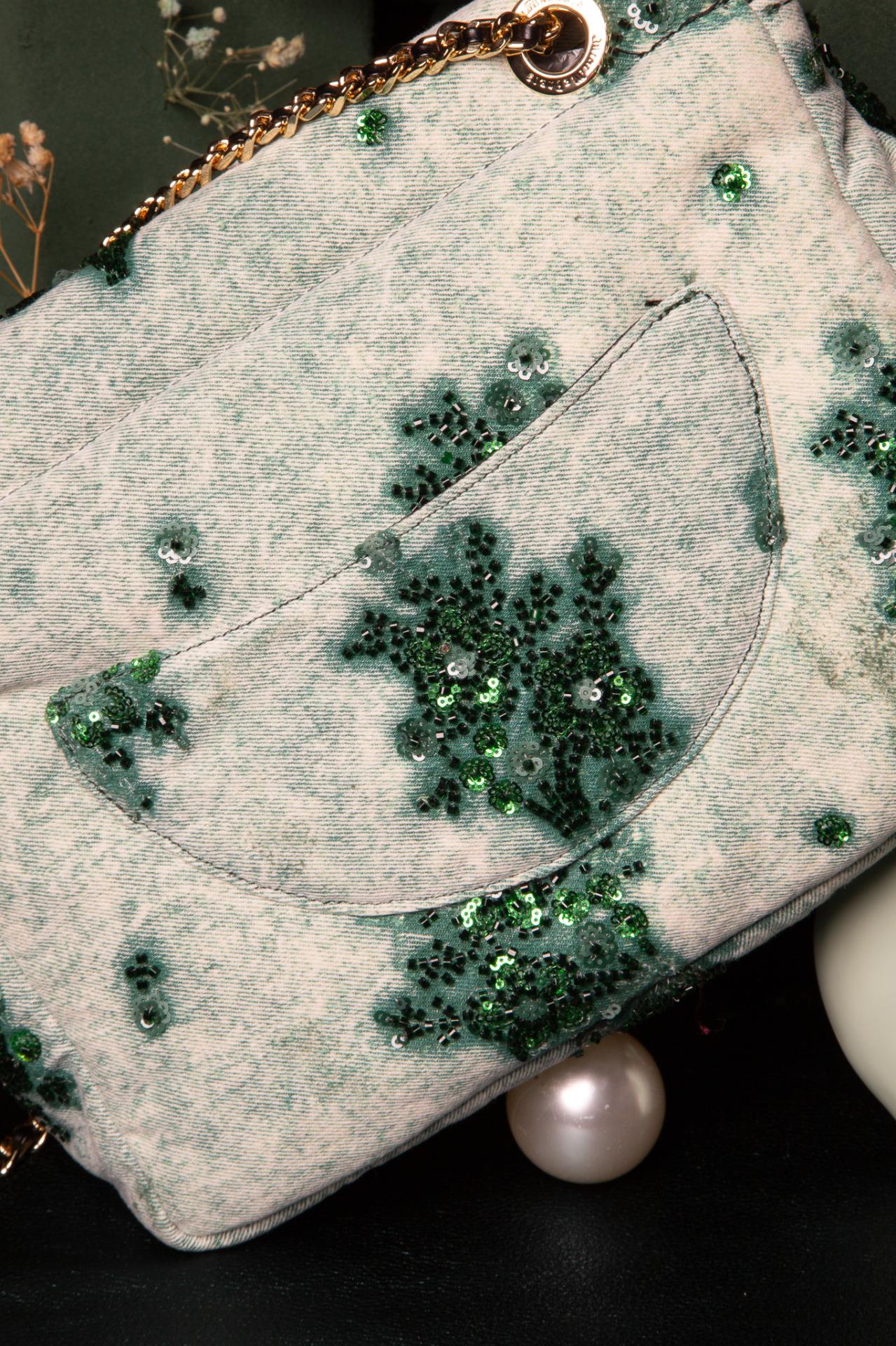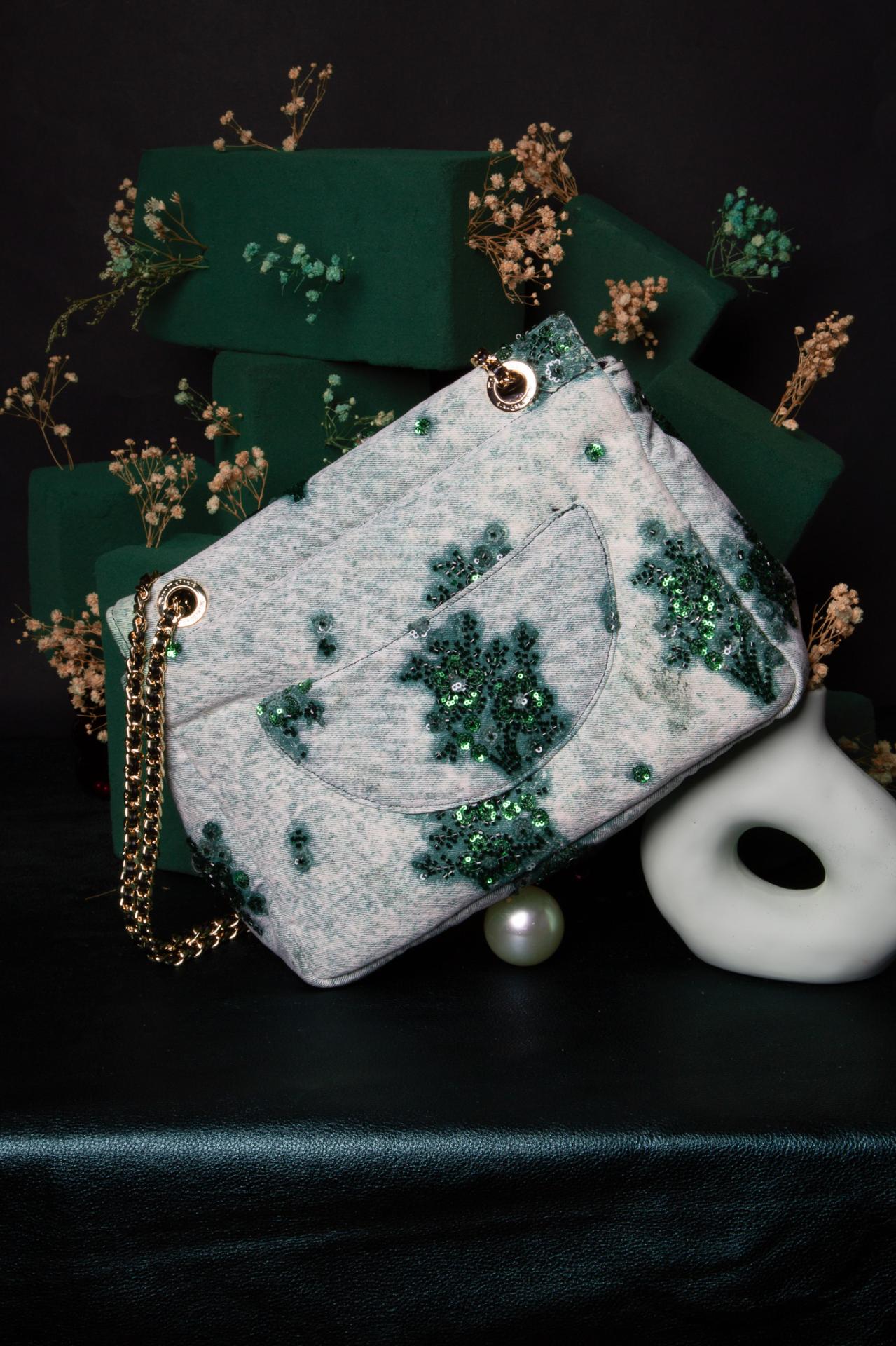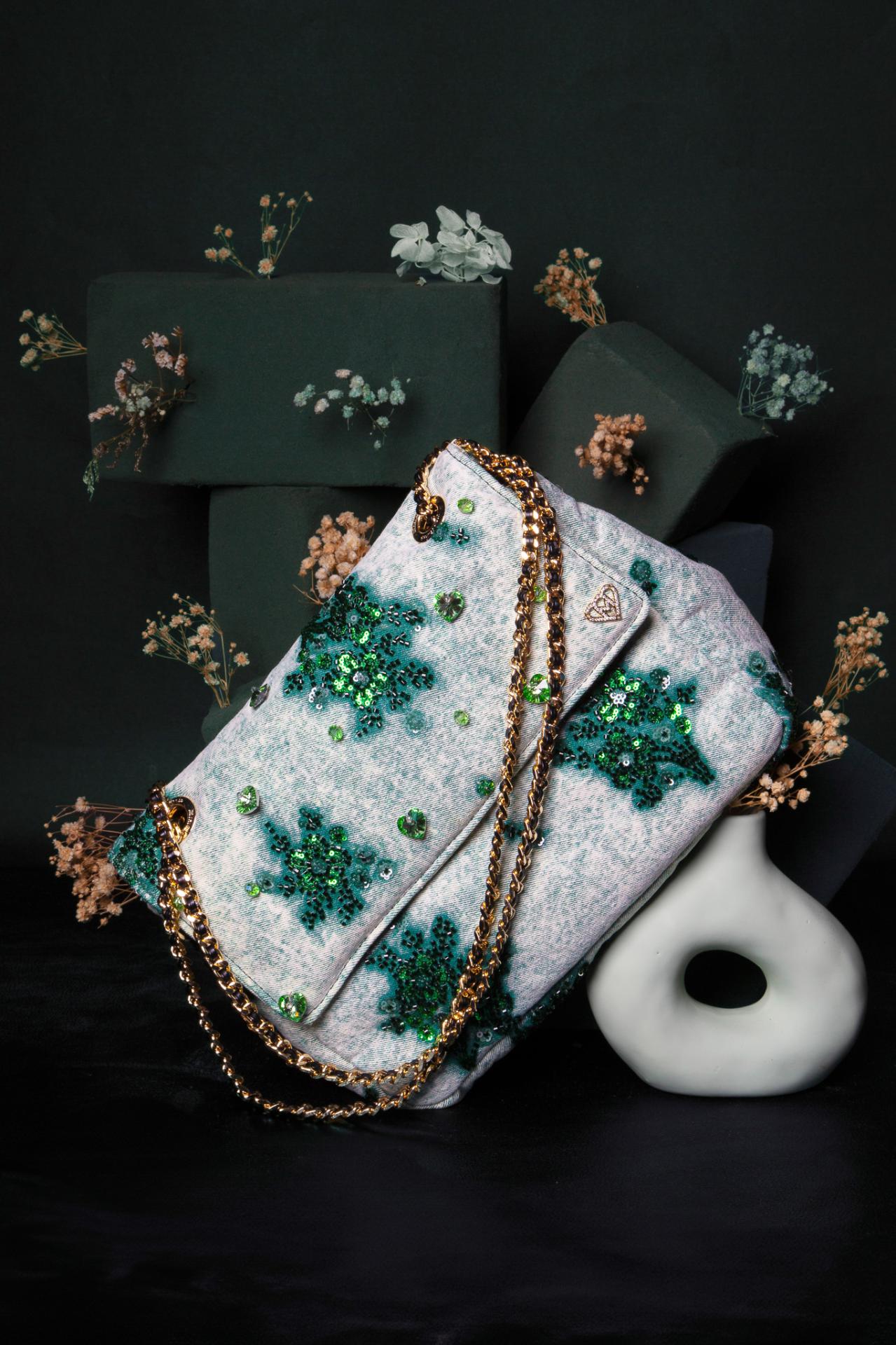 A silver sequin medium soft bag blooming with emerald florals—frosty, elegant, and enchantingly bold.