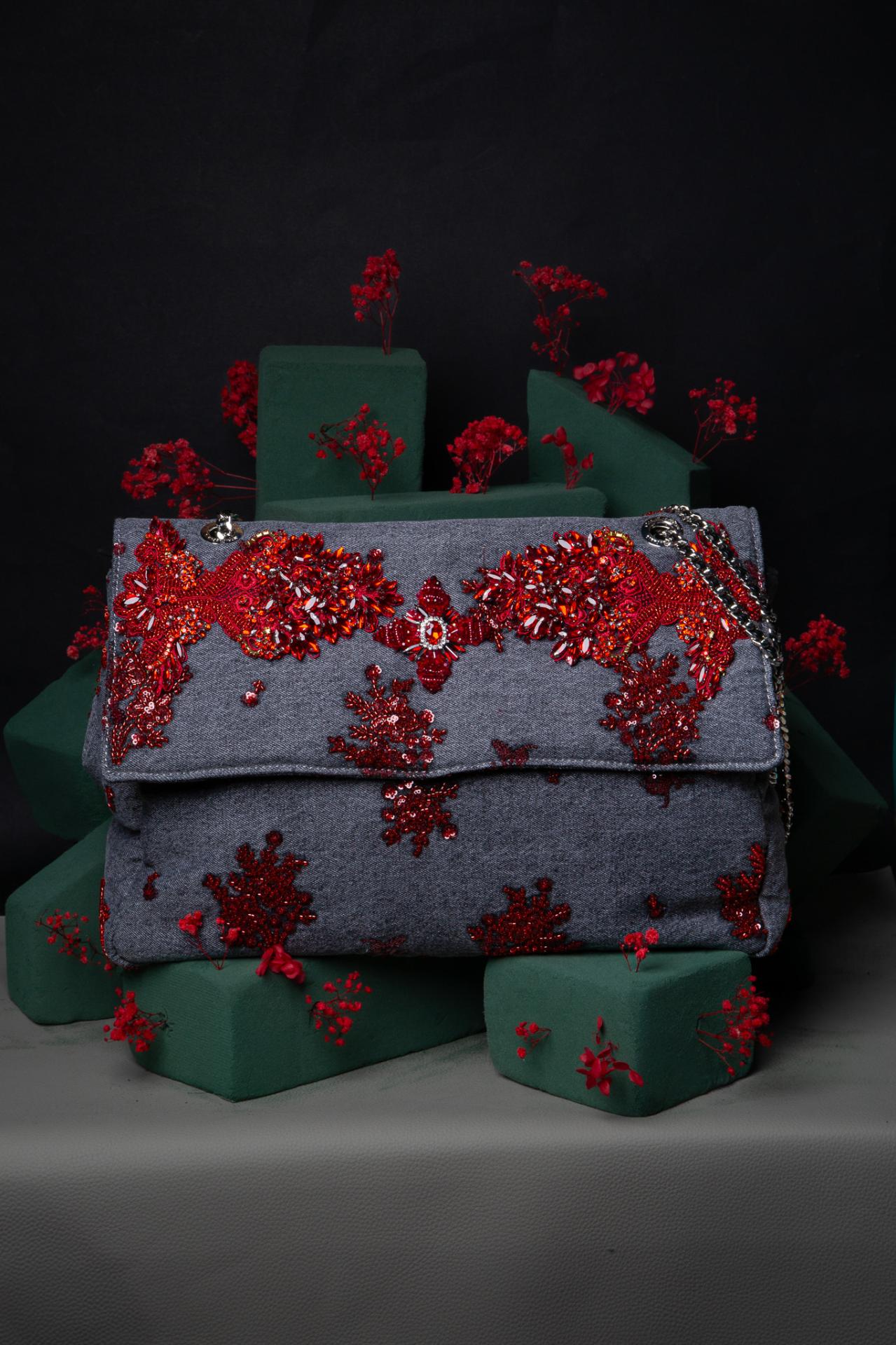 A grey fabric soft large bag blooming with crimson beadwork—romantic, artistic, and couture to the core.