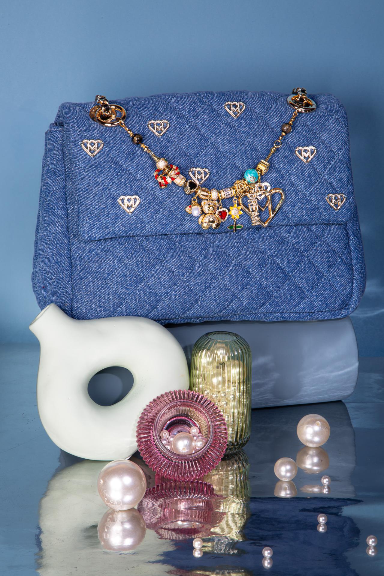 A soft blue quilted medium soft bag with gold monogram details and a playful charm chain—elevated, effortless, and uniquely MiniMe.