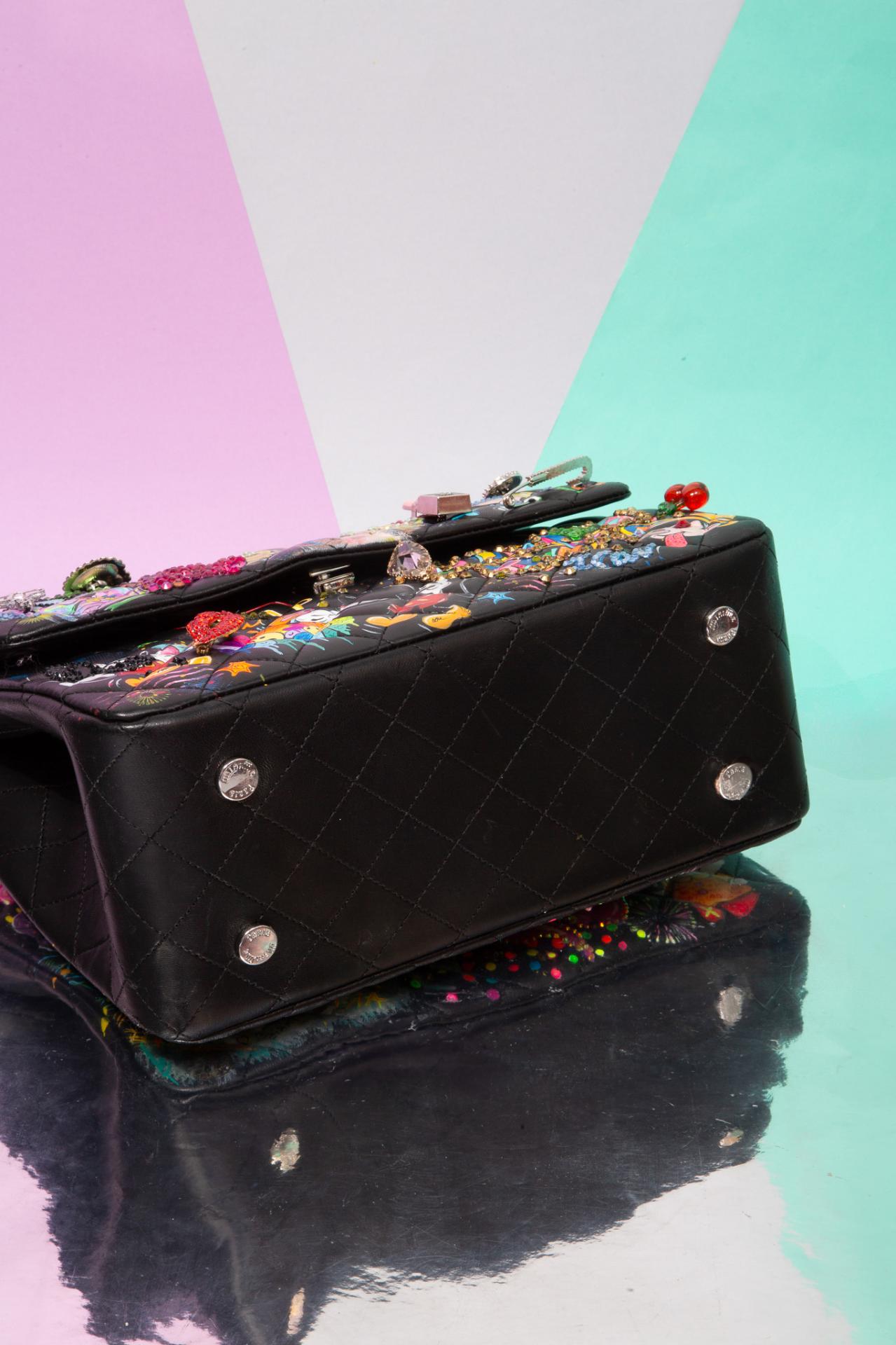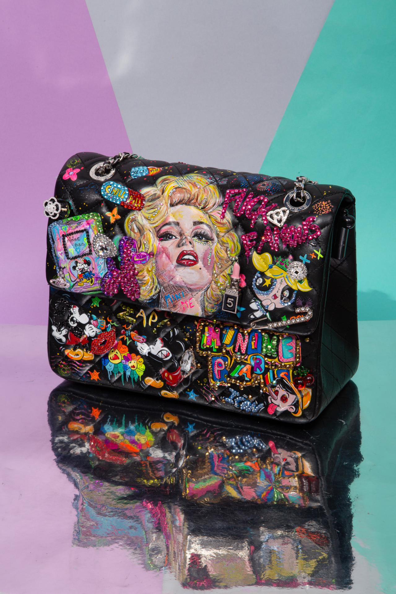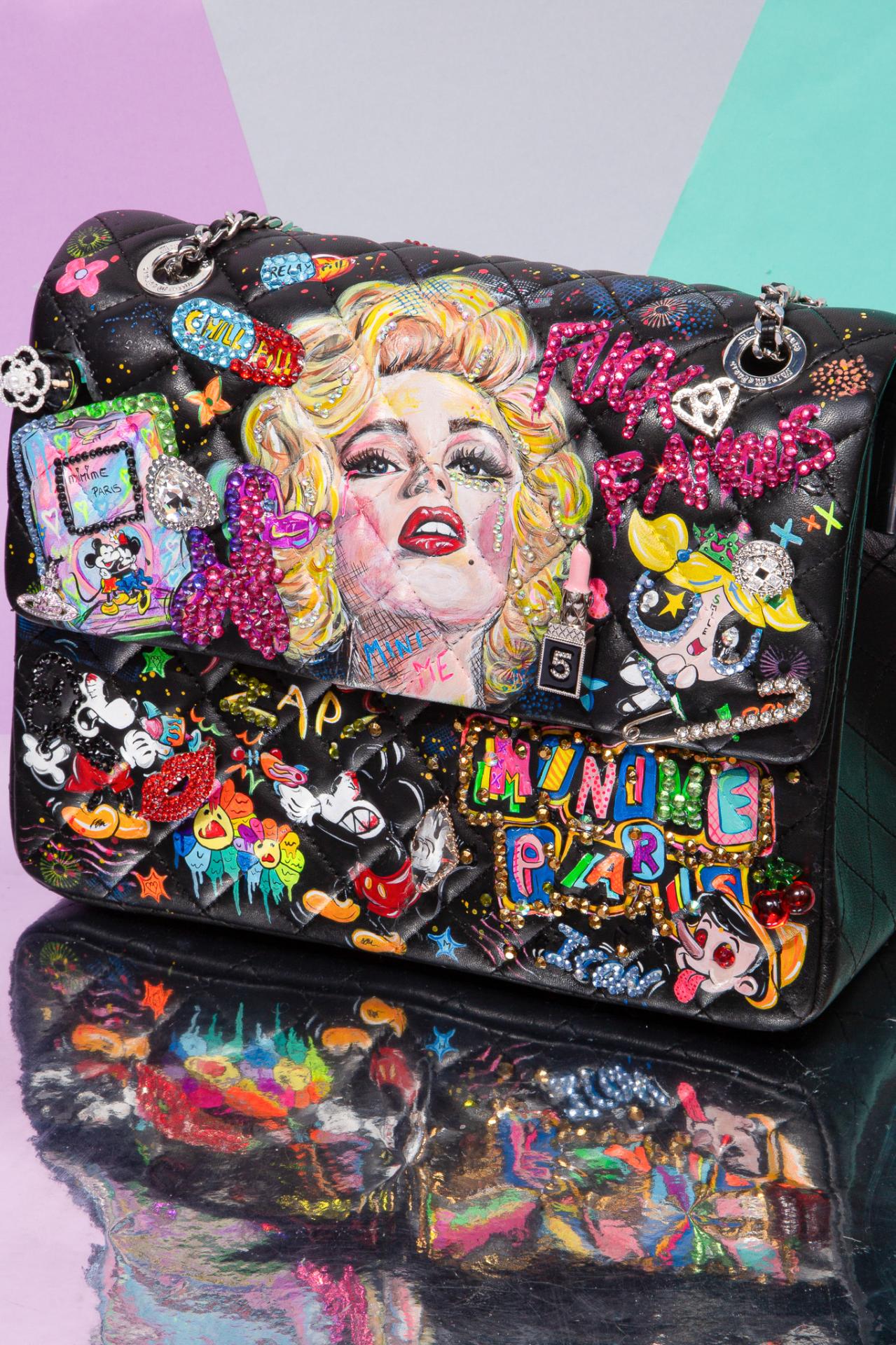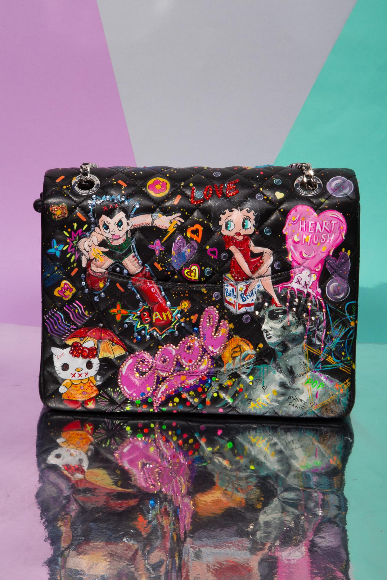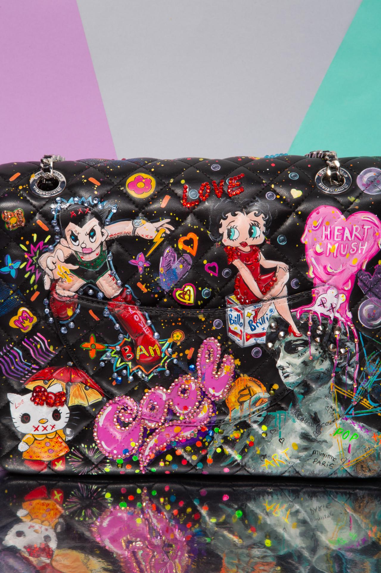 A black graffiti bag covered in glam diva art, cartoon mayhem, and pop-punk sparkle made to turn heads and start conversations.