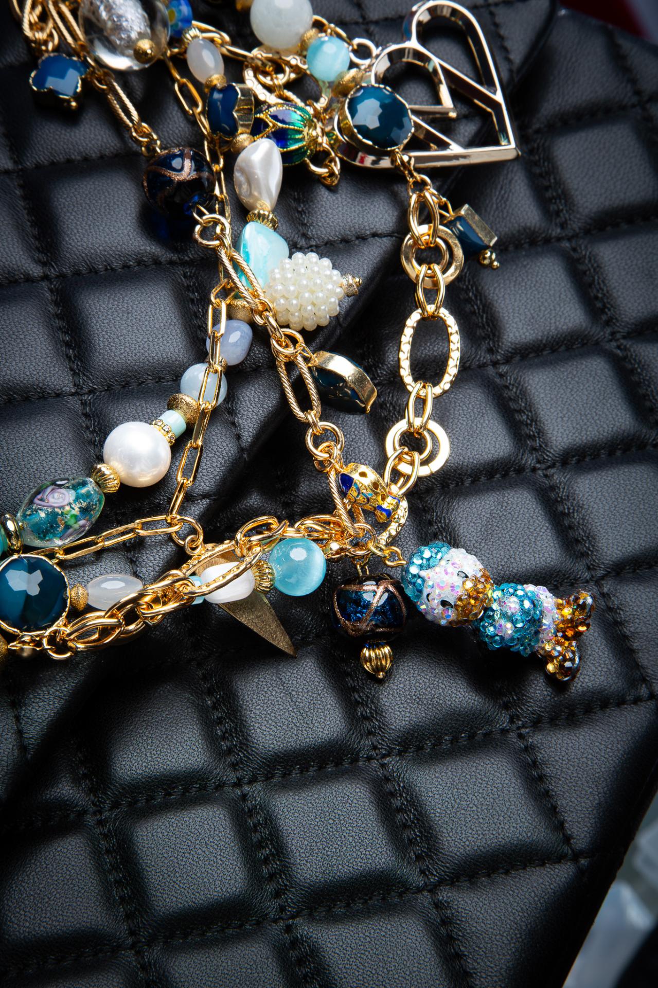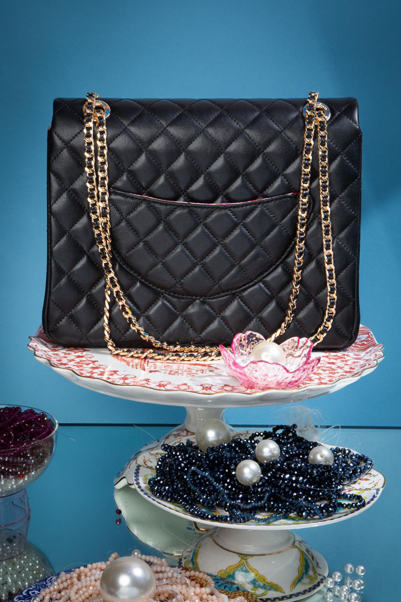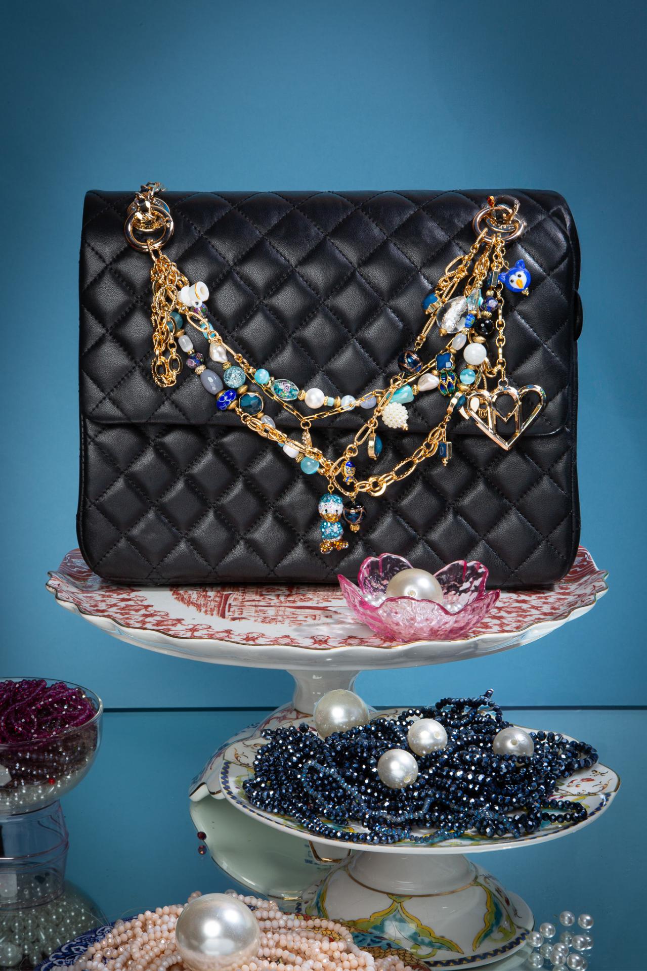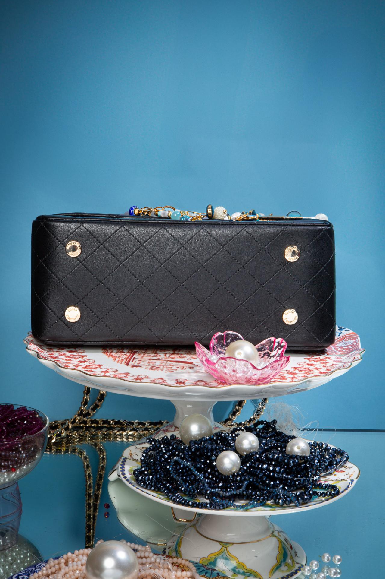 A black quilted medium hard bag with layered pearl & starry charm chains cosmic, elegant, and full of midnight magic.