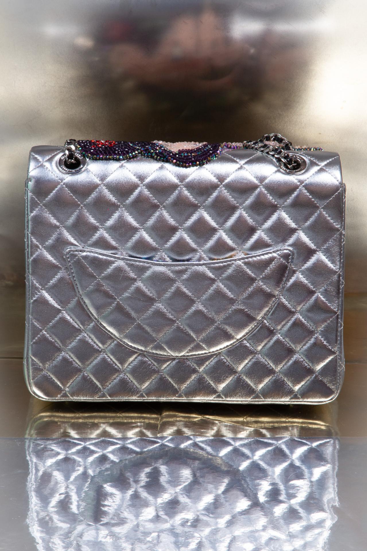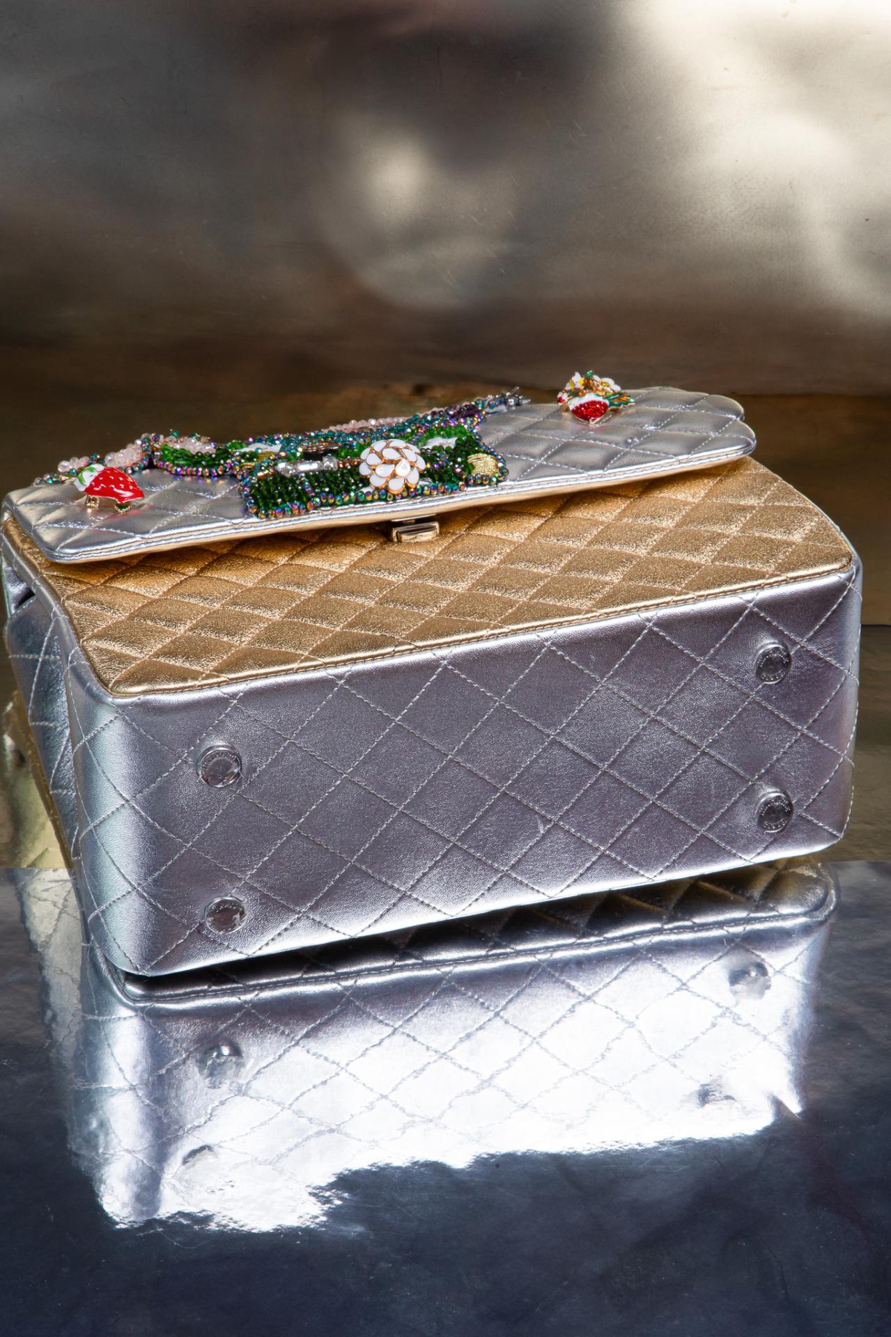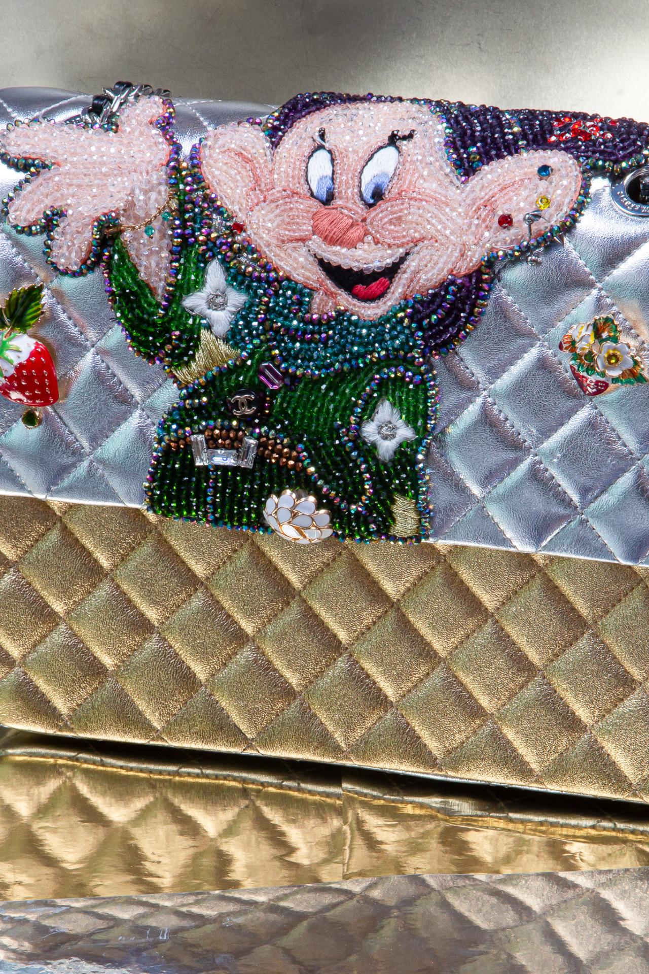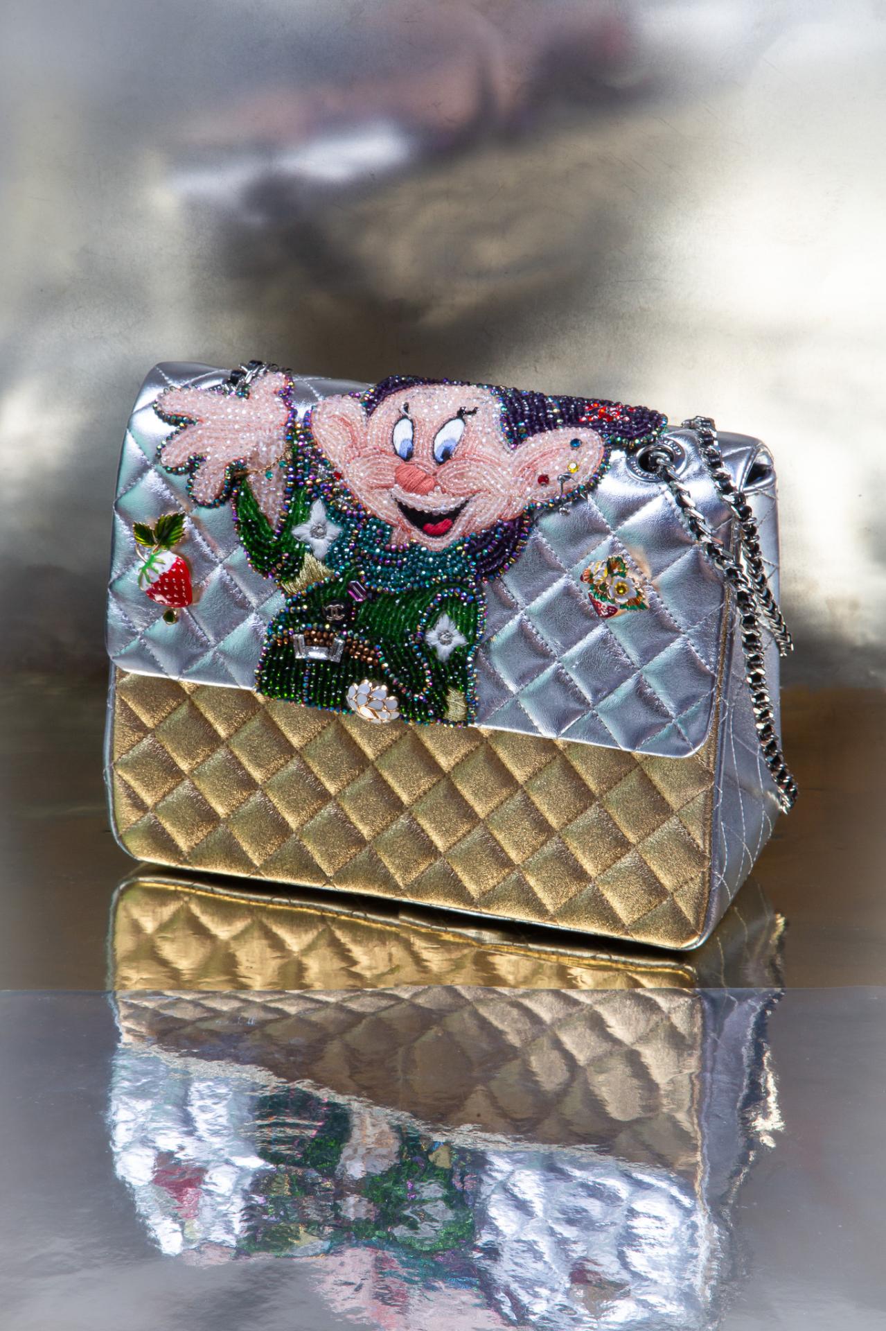 A silver-and-gold quilted bag medium hard, with a beaded Dopey patch and playful charms storybook sparkle meets fashion fantasy.