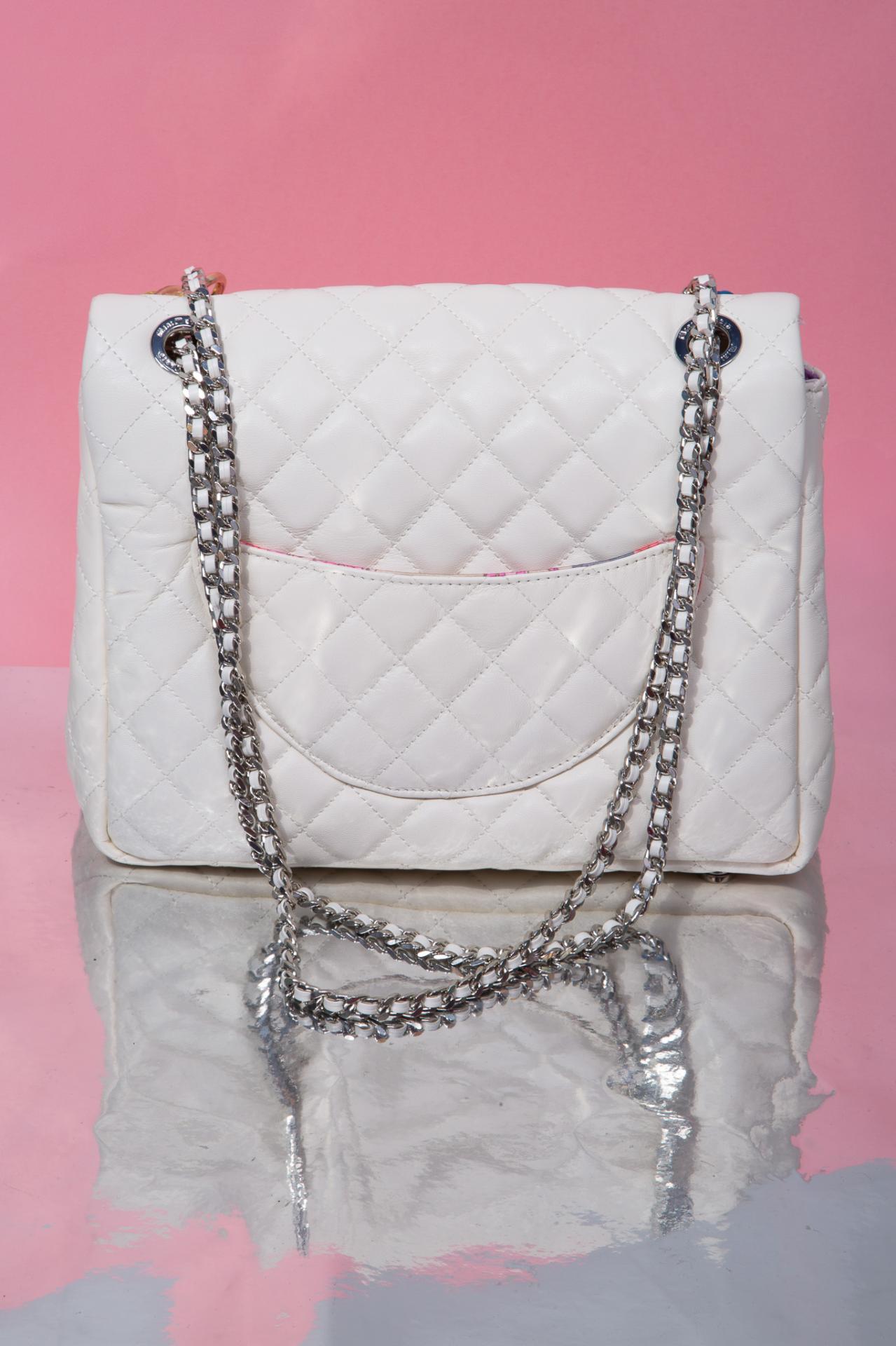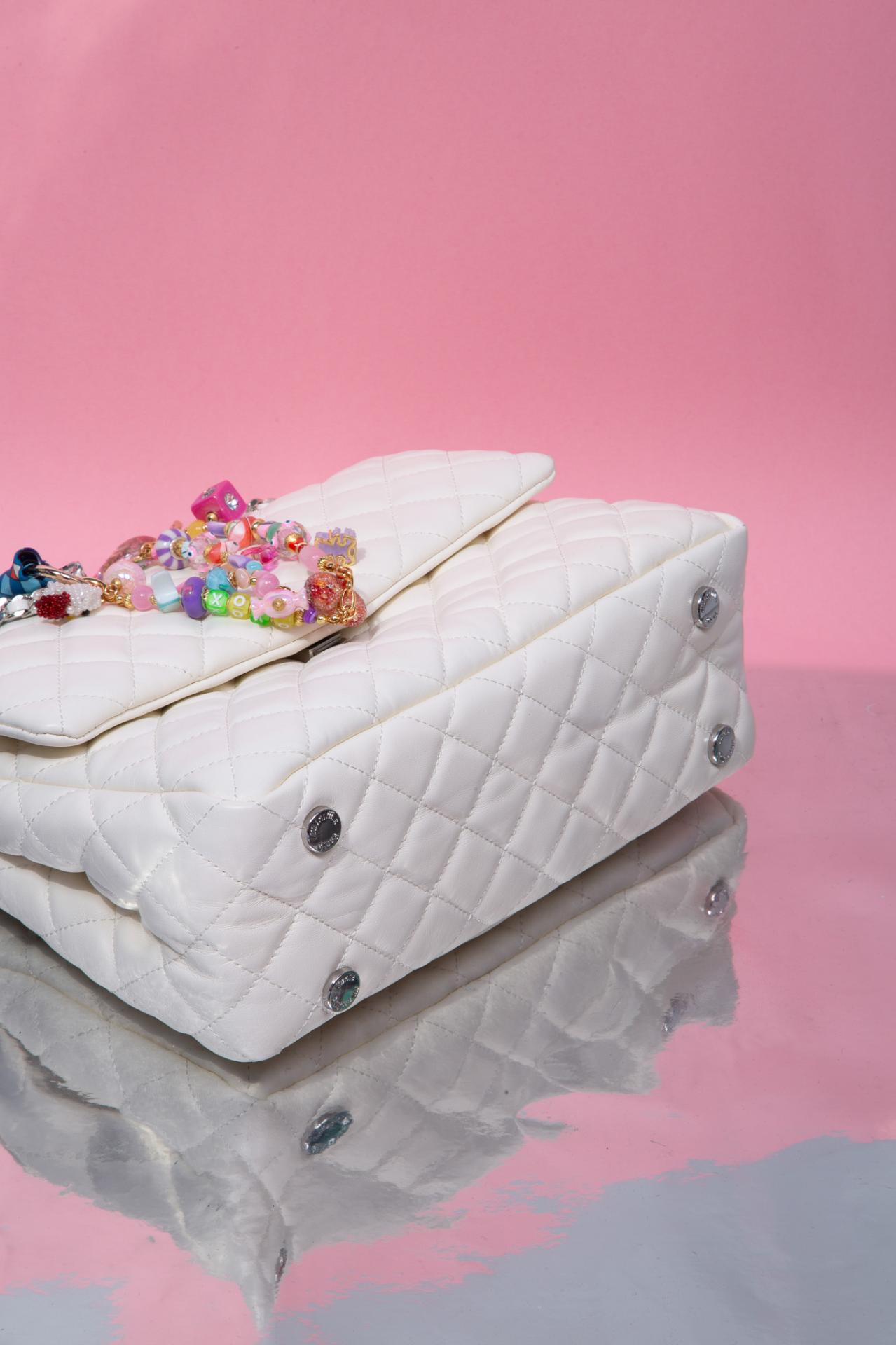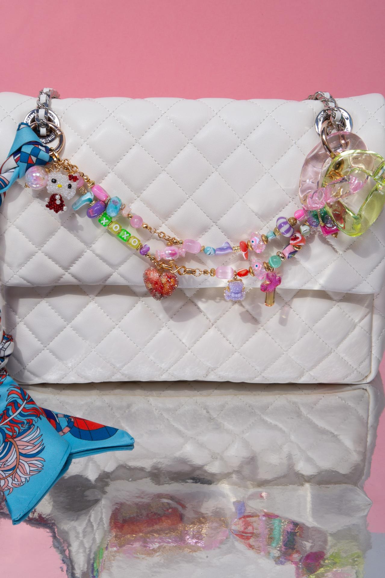 A glossy medium hard white quilted bag with pastel charm chains and a printed twilly sweet, colorful, and full of MiniMe magic.