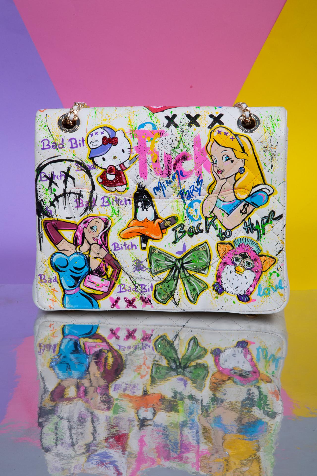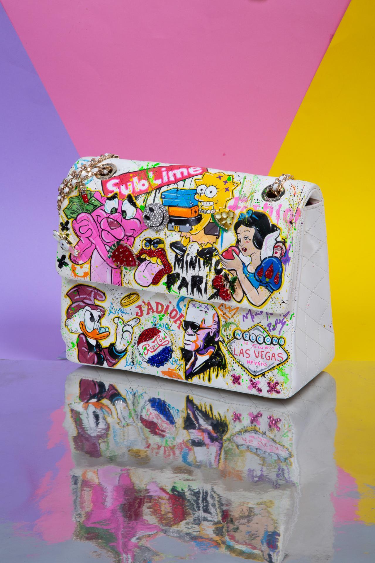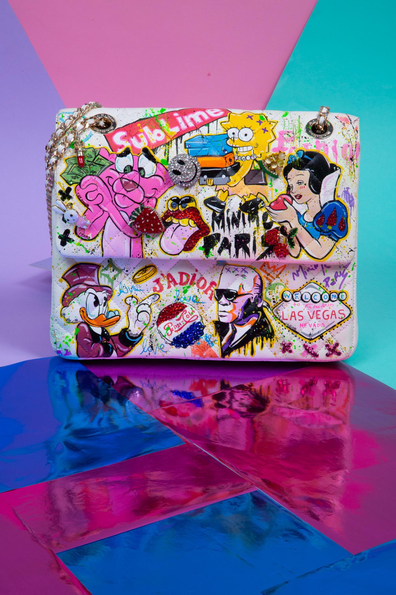 A wild pop art medium hard, collage bag bursting with Paint, sass, and nostalgia made to be seen.