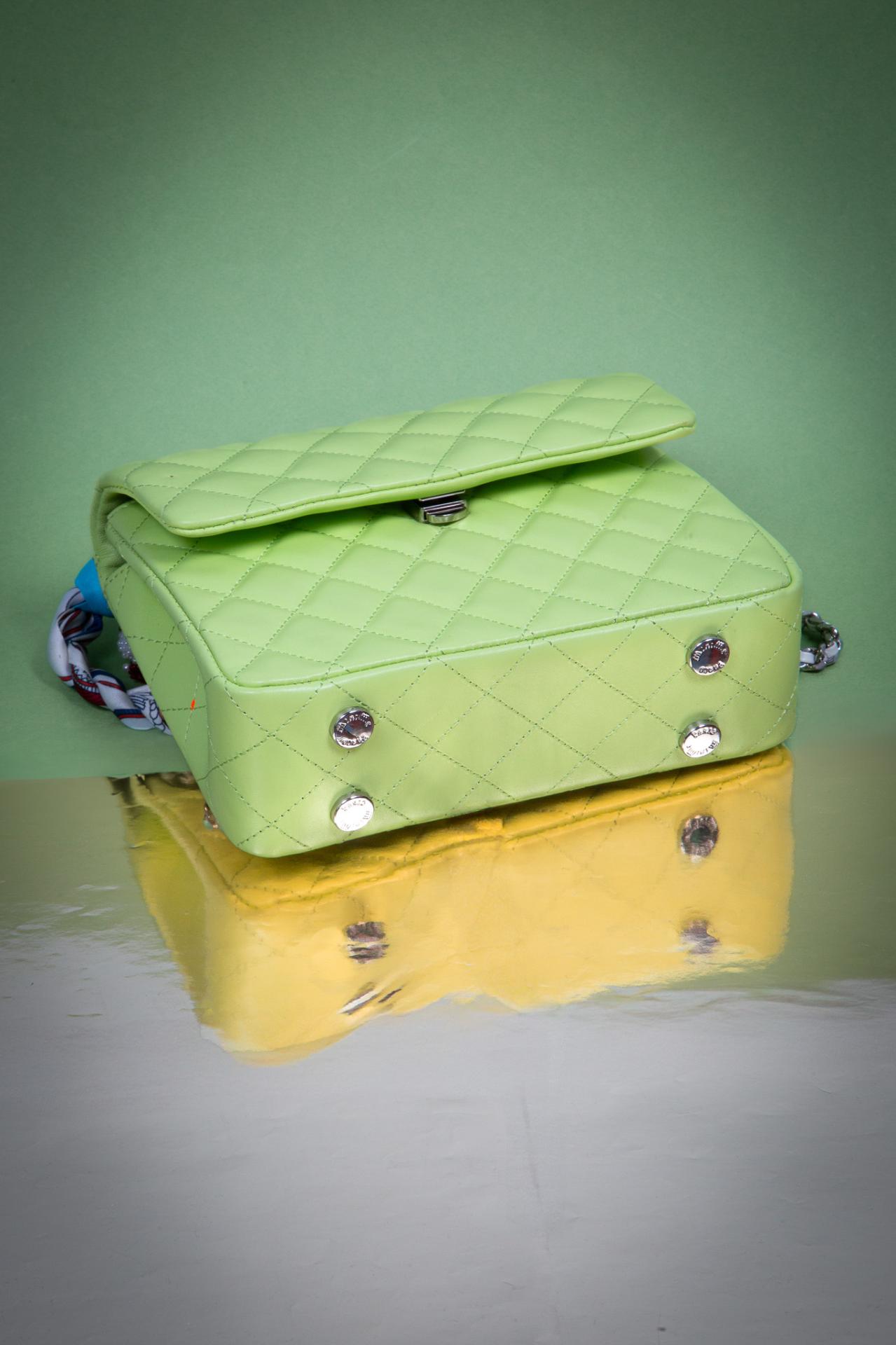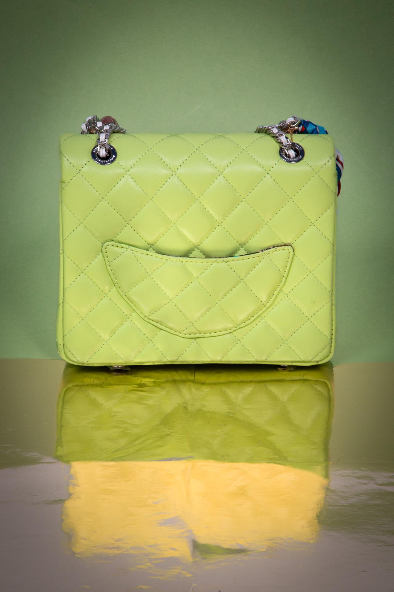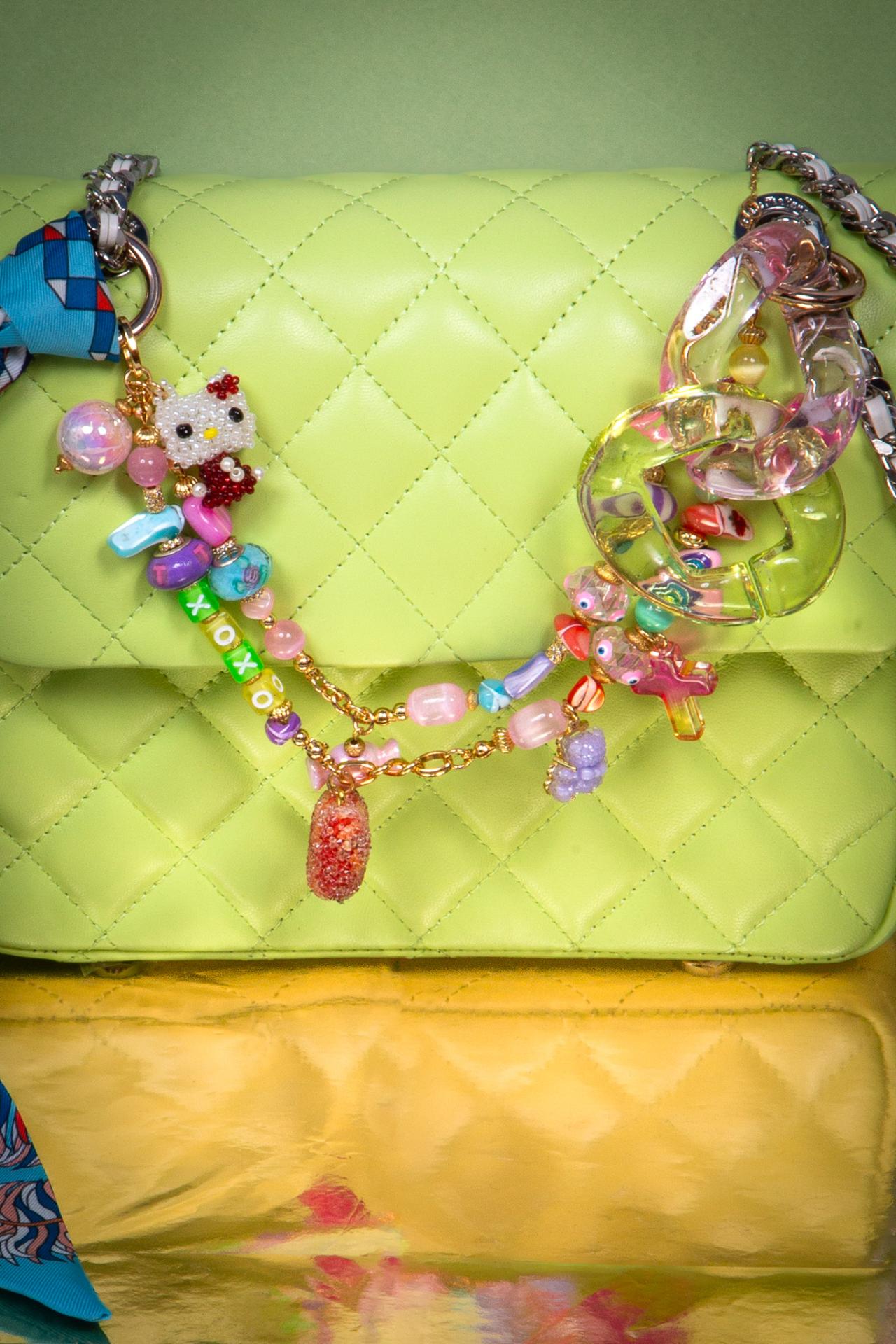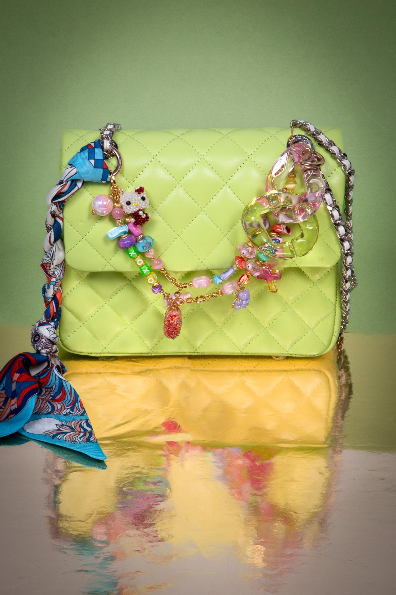 A small rigid, lime green quilted bag with candy-bright charms, resin links & twilly scarf cute, custom, and full of joy.