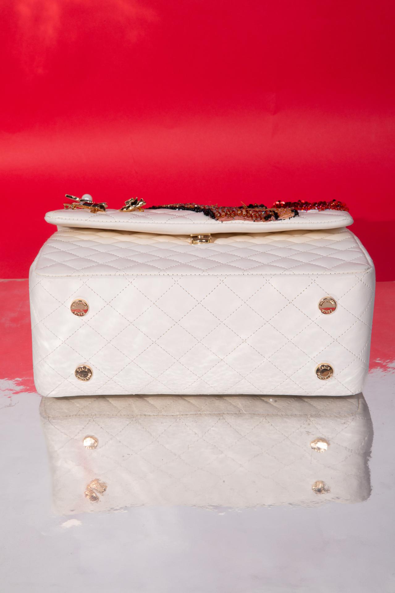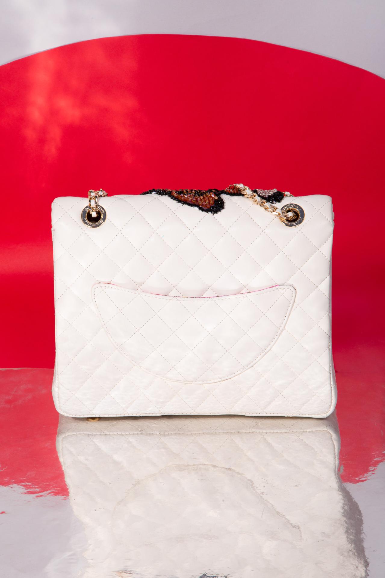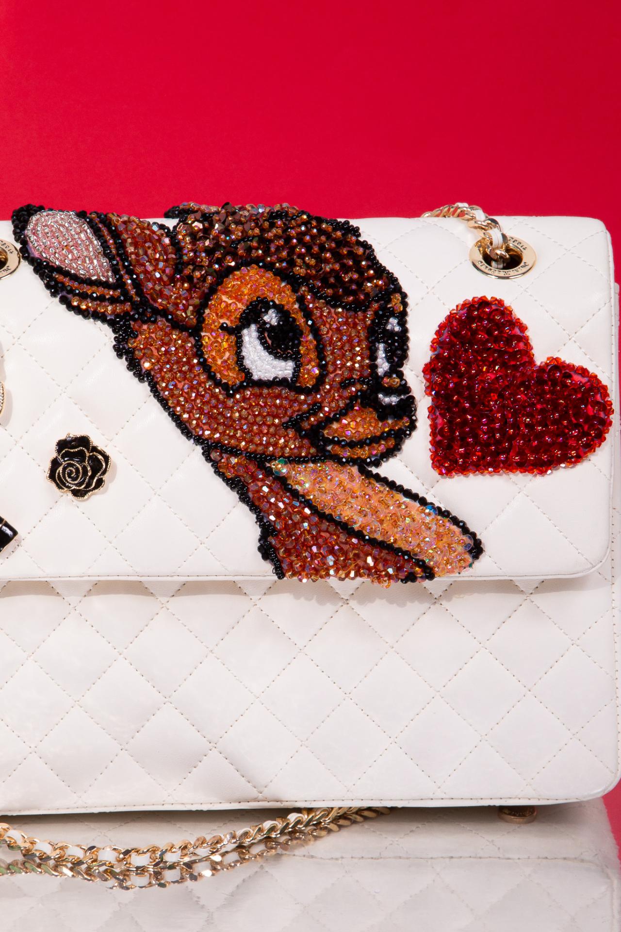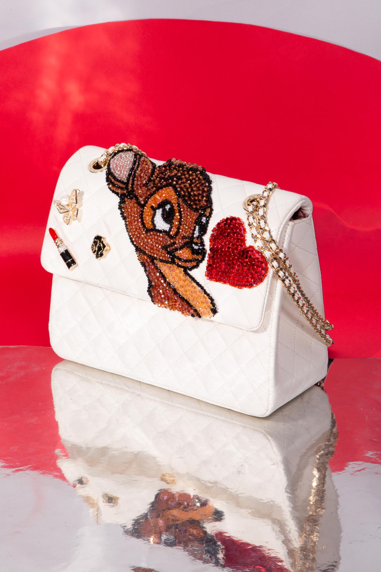 A custom white quilted bag medium hard, with rhinestone cartoon art, gold pins, and chain strap. Cute, collectible, and glam.