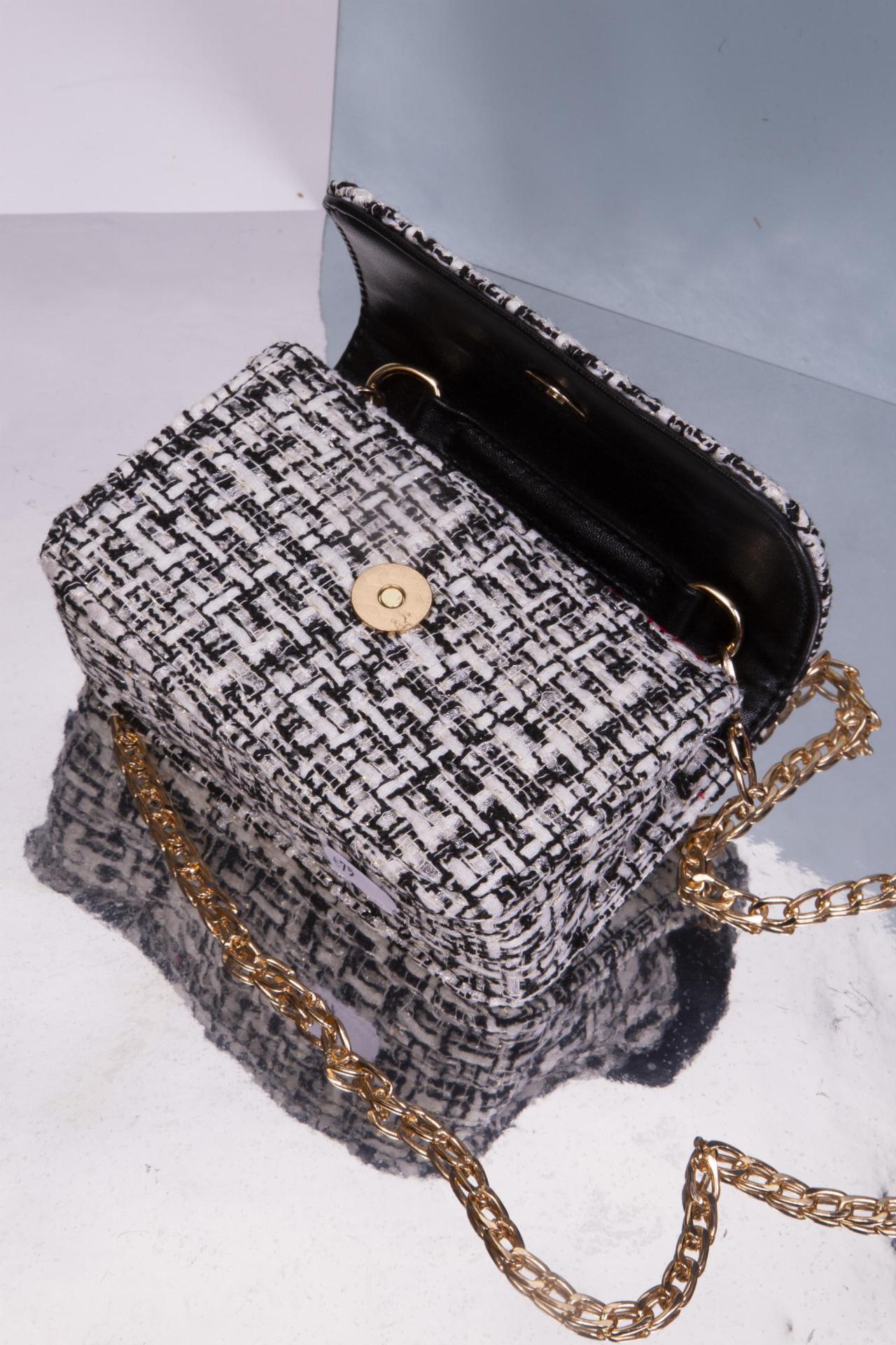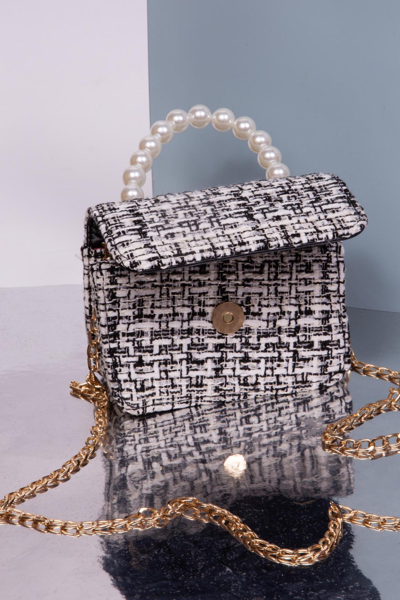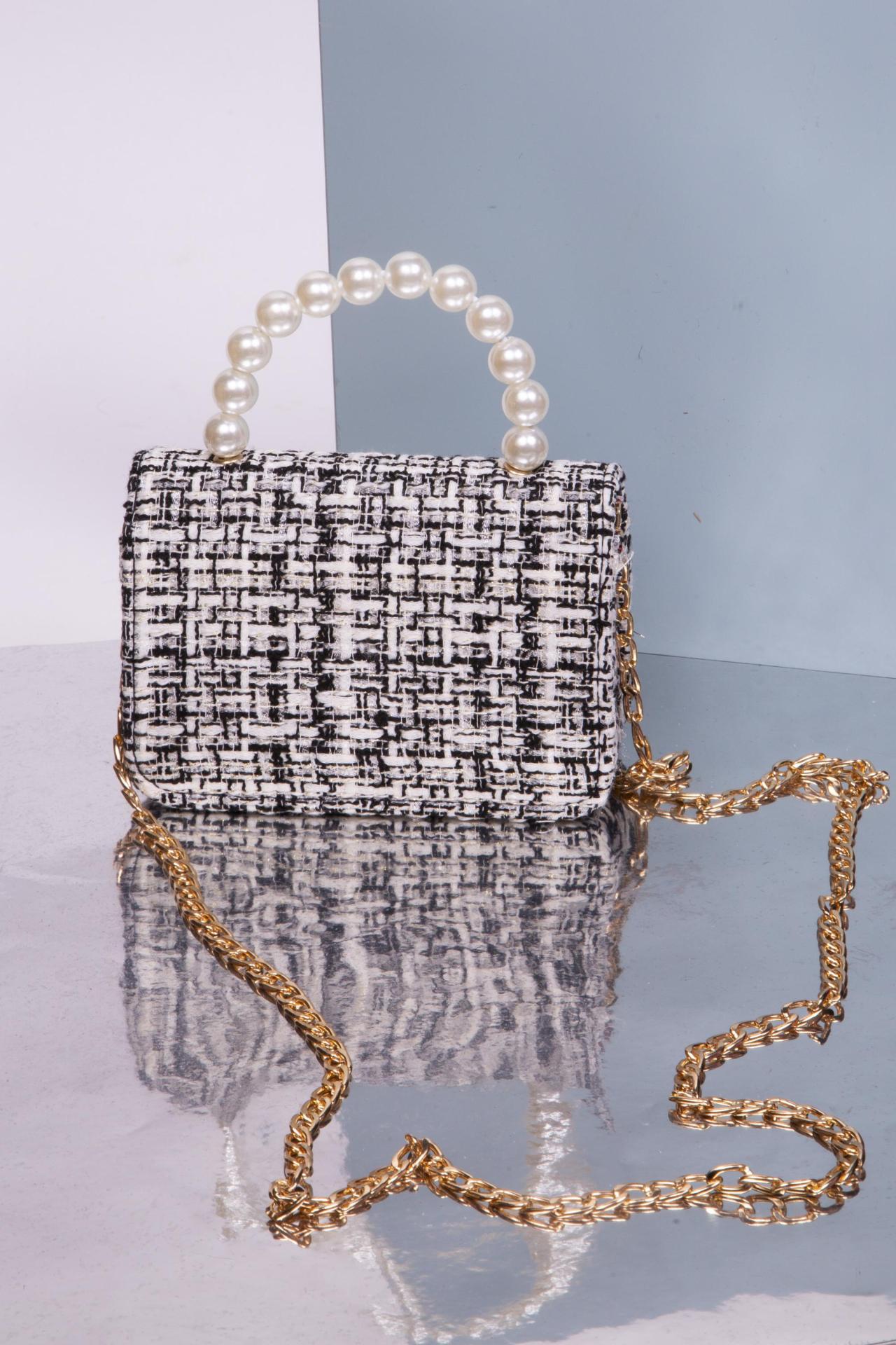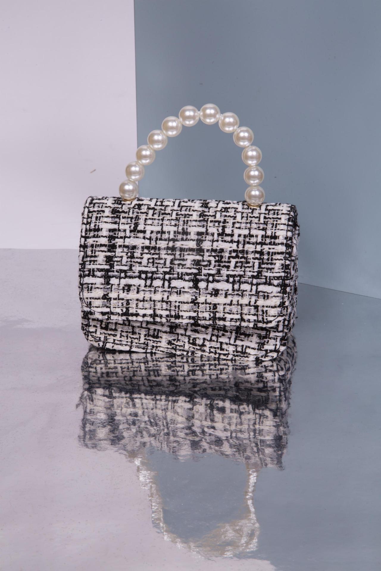 Pearly Eclipse Tweed Purse—black-and-white tweed with a pearl handle that shines like the moon. Mini bag, major statement.