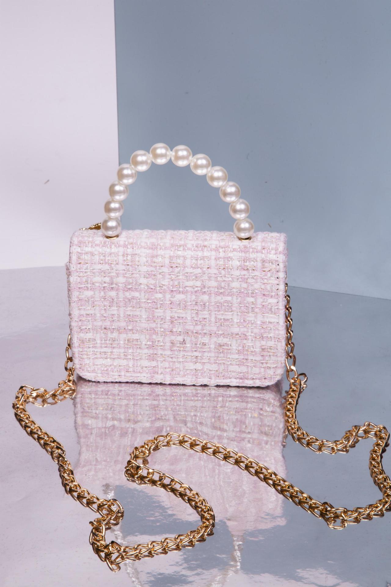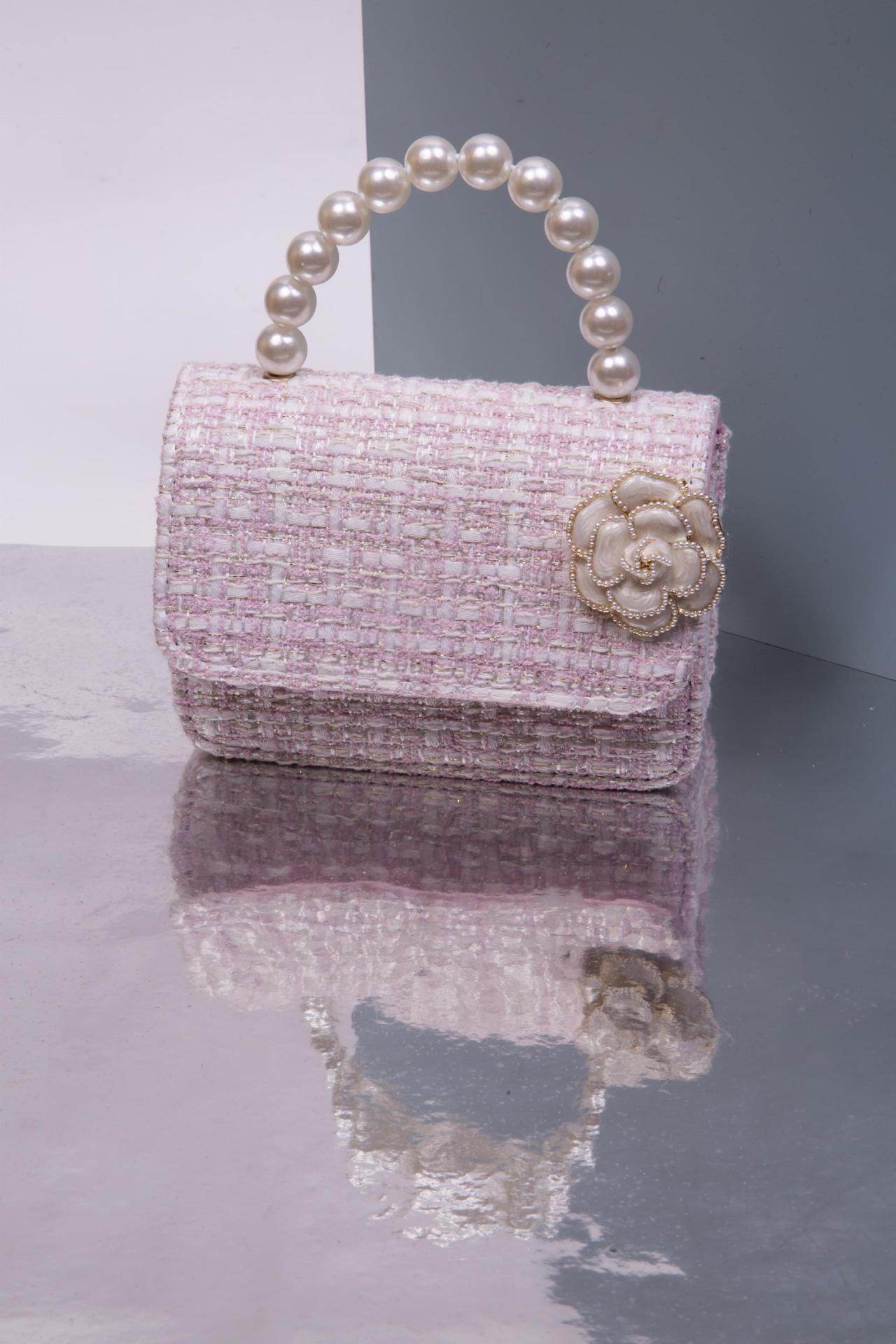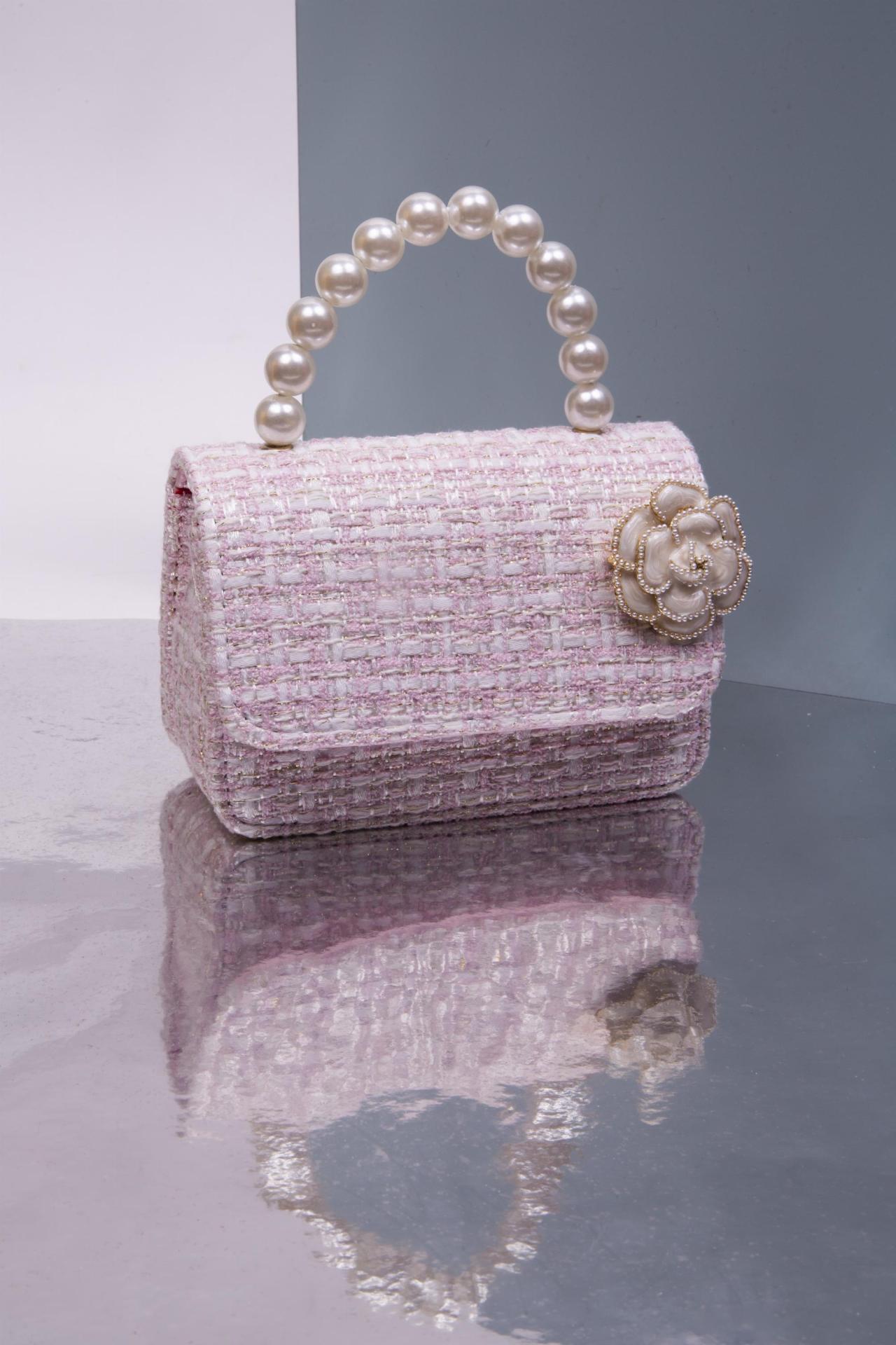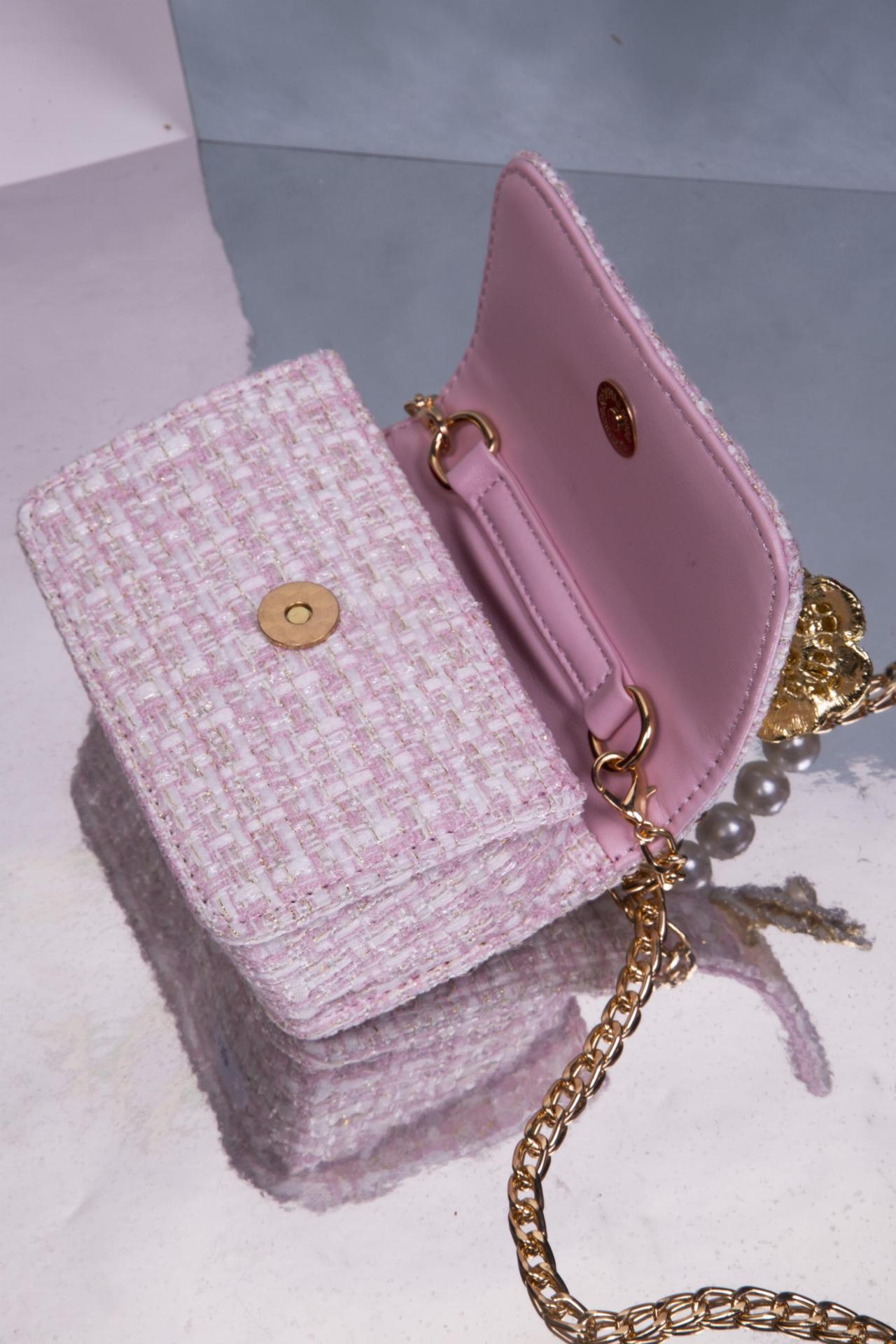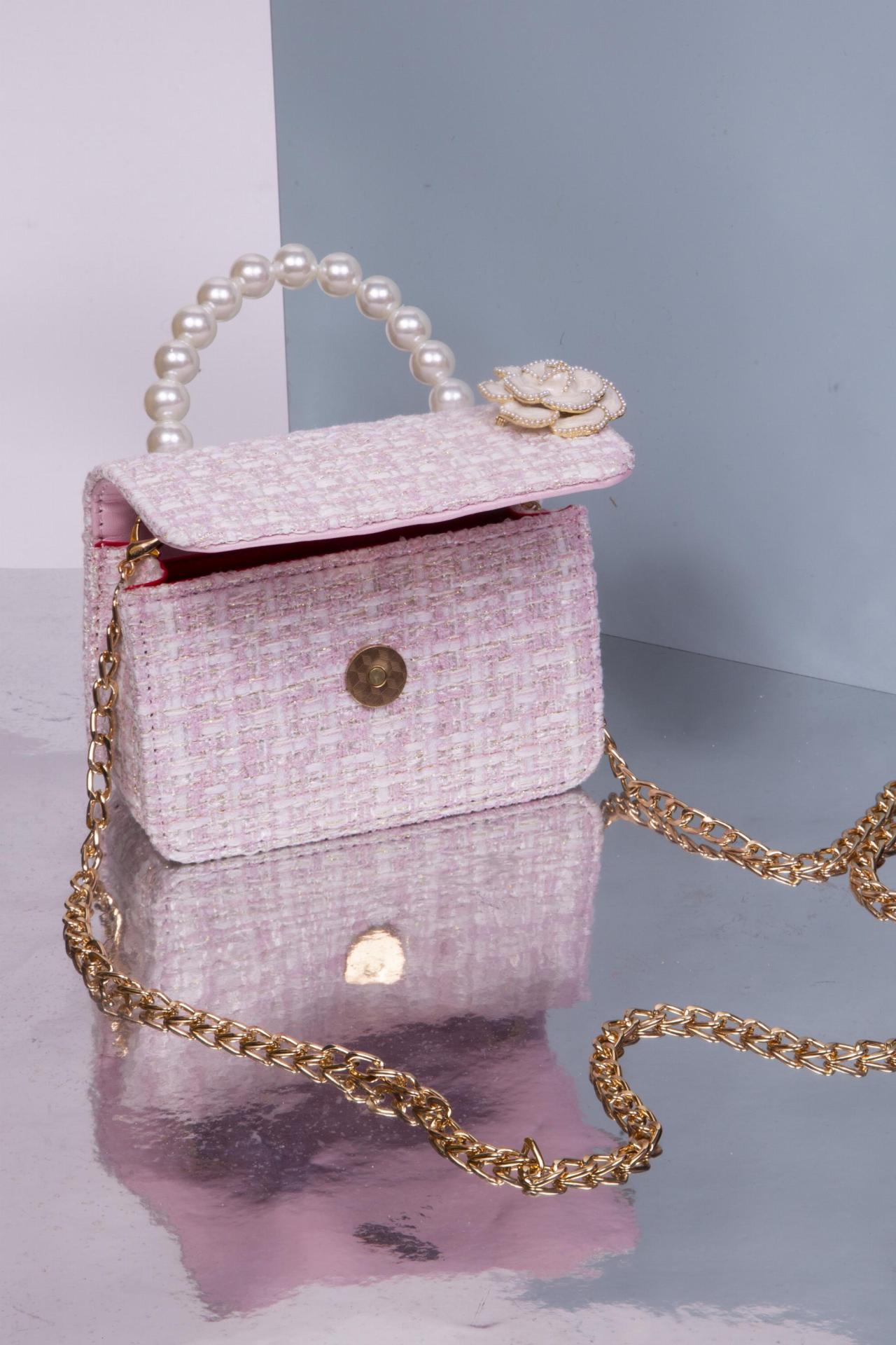 MiniMe Pink Pearly Tweed Purse—a candy-colored dream in mini form, finished with pearls and polished charm. Très chic, très you.