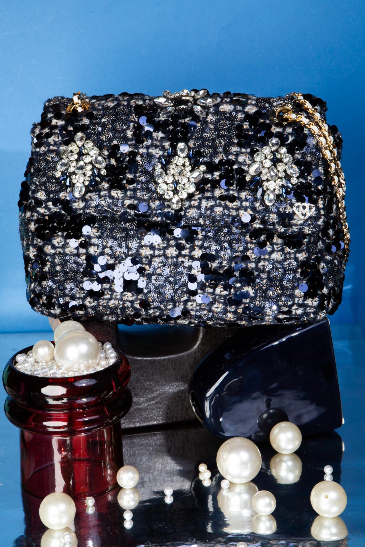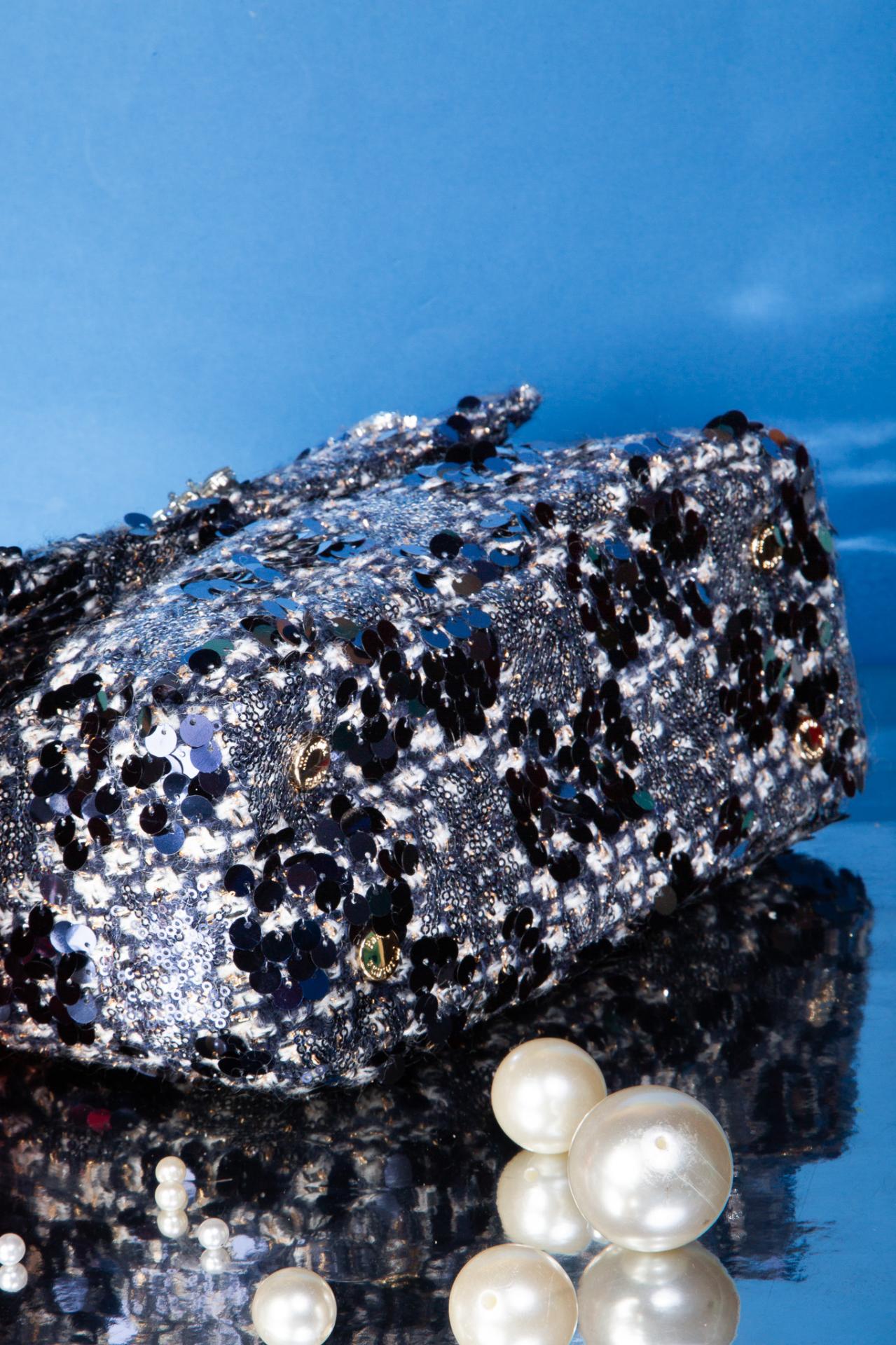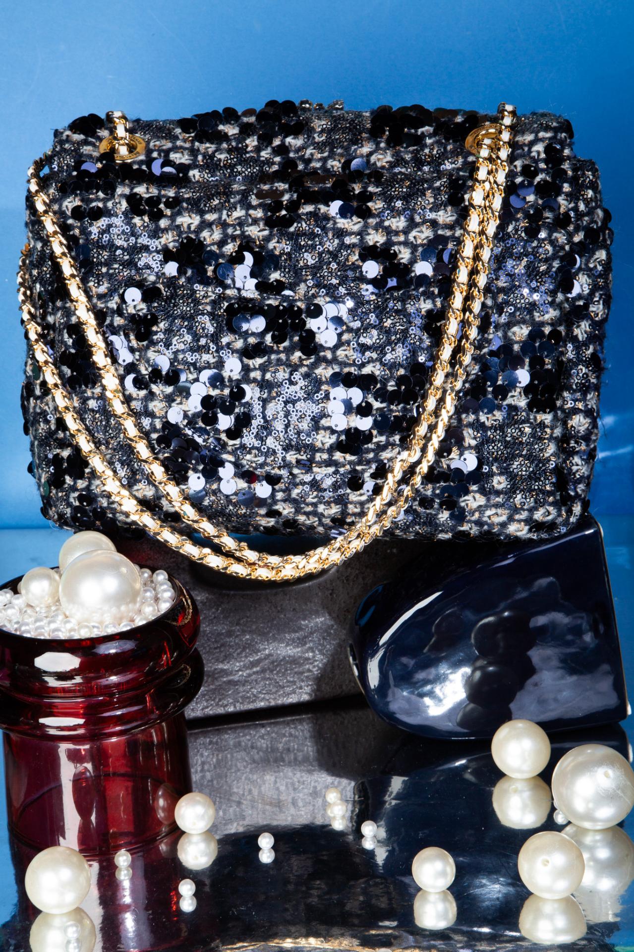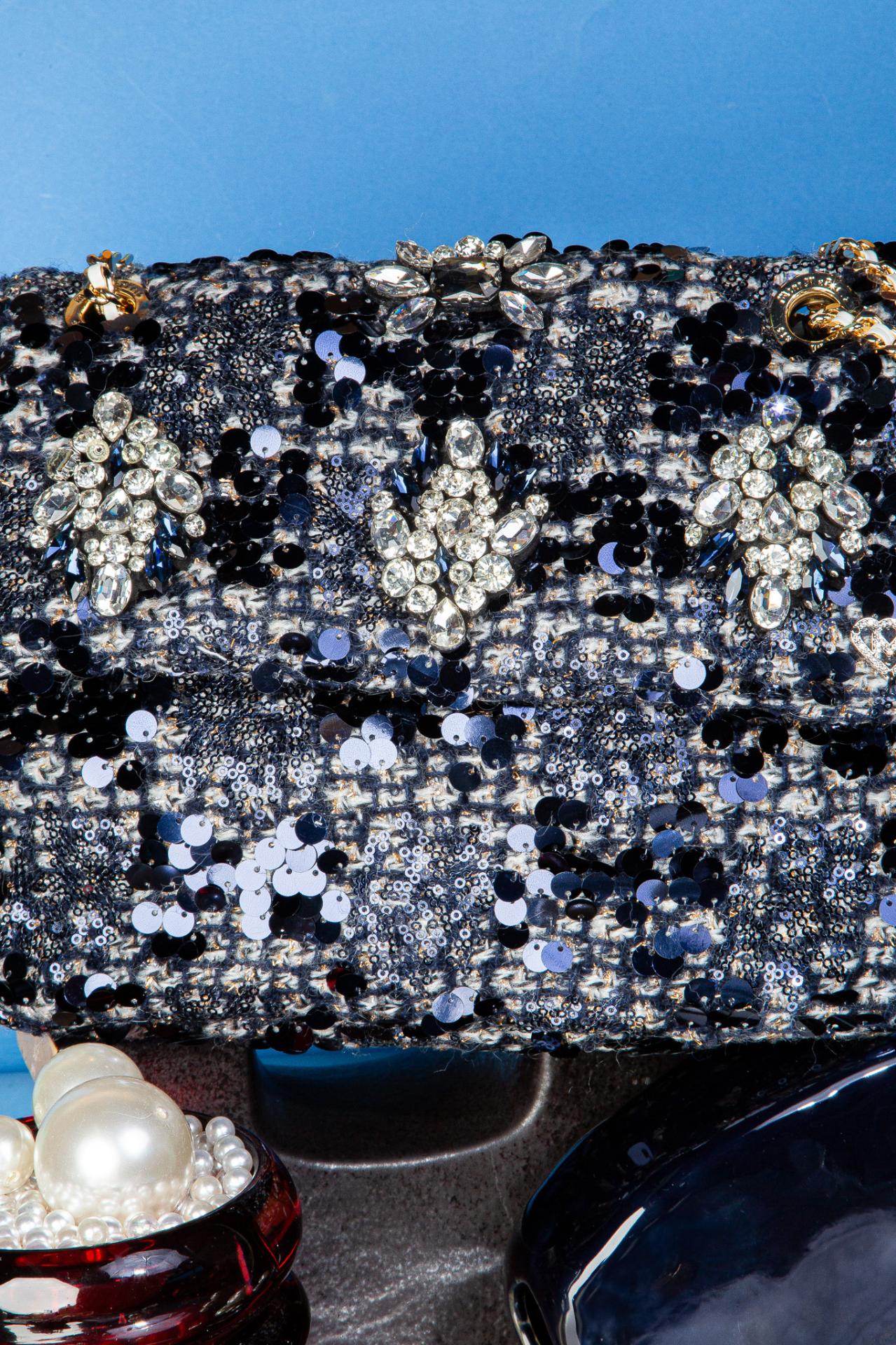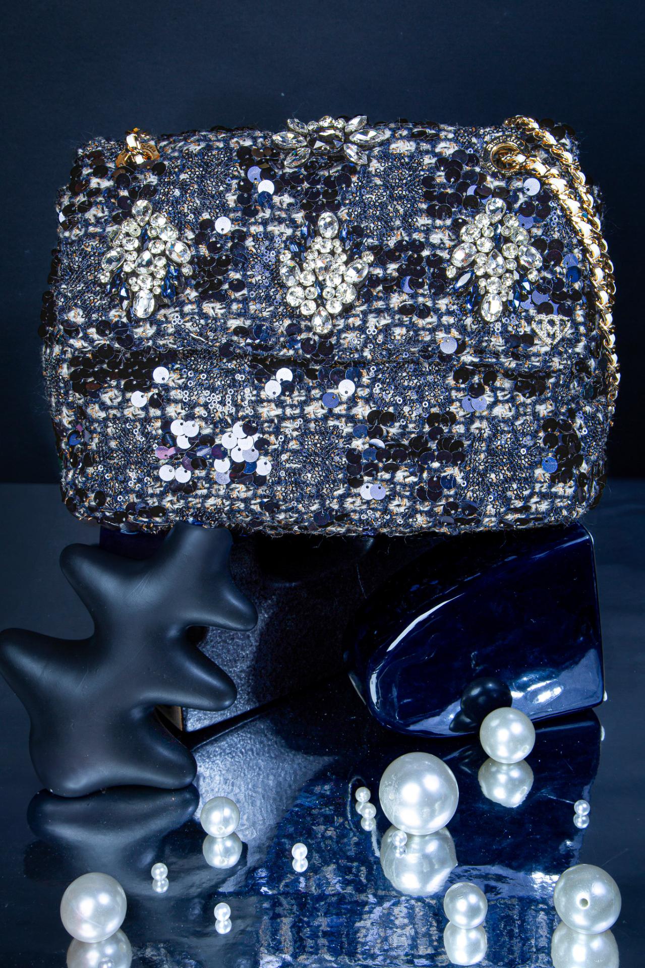 Soft M-sized tweed bag with black and silver sequins, crystal brooches, and a chunky gold chain — glam, plush, and ready to shine.
