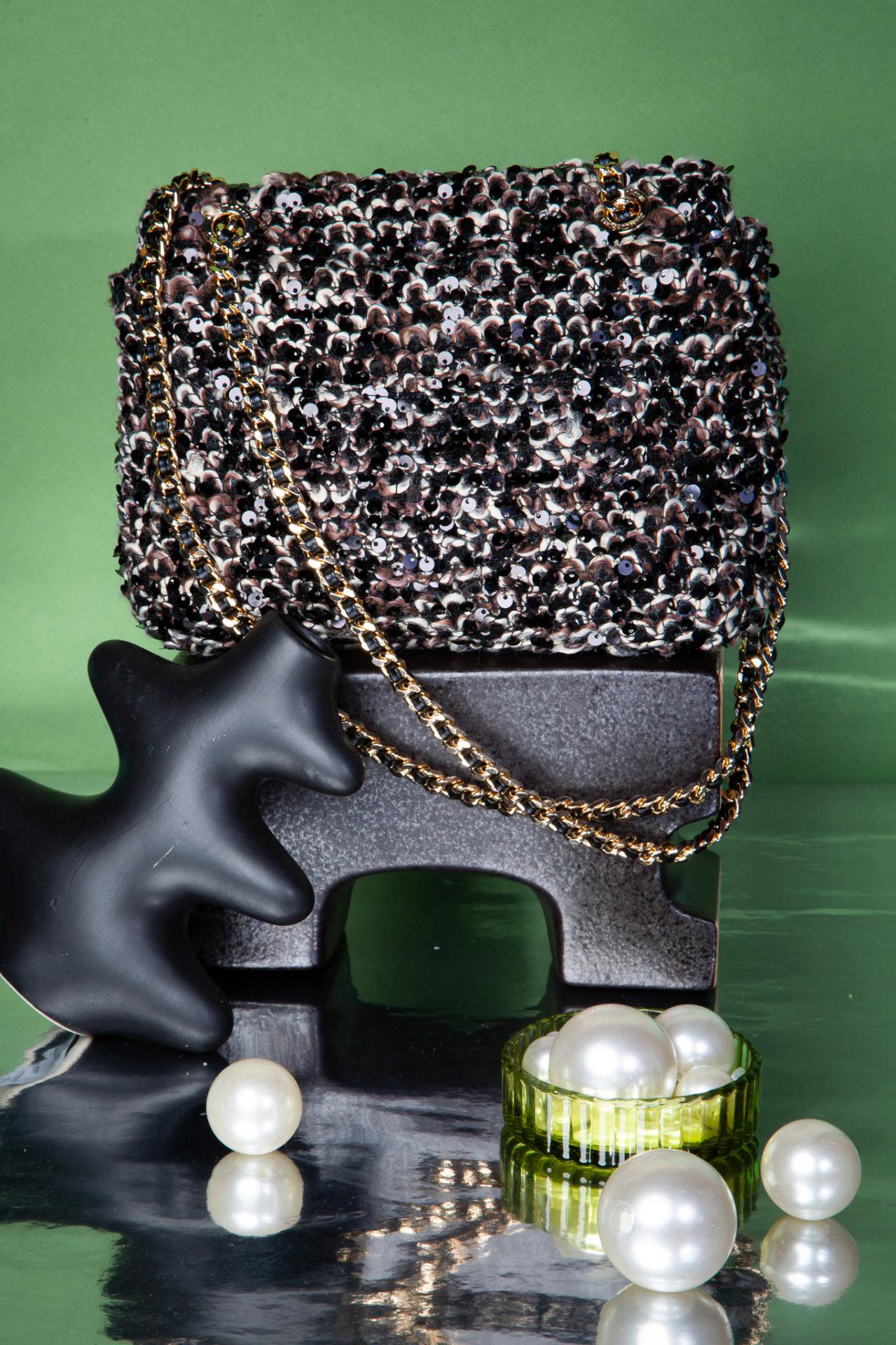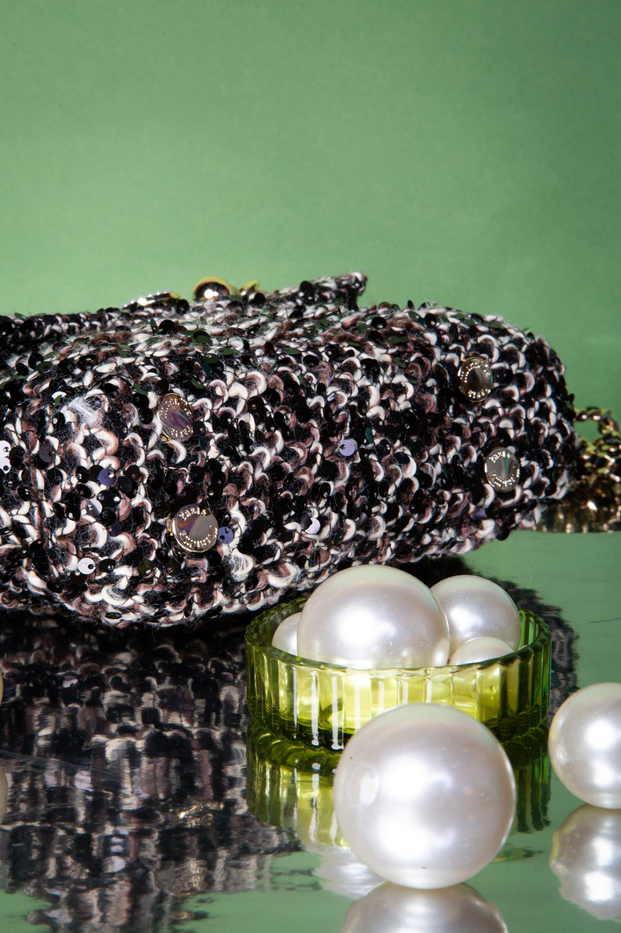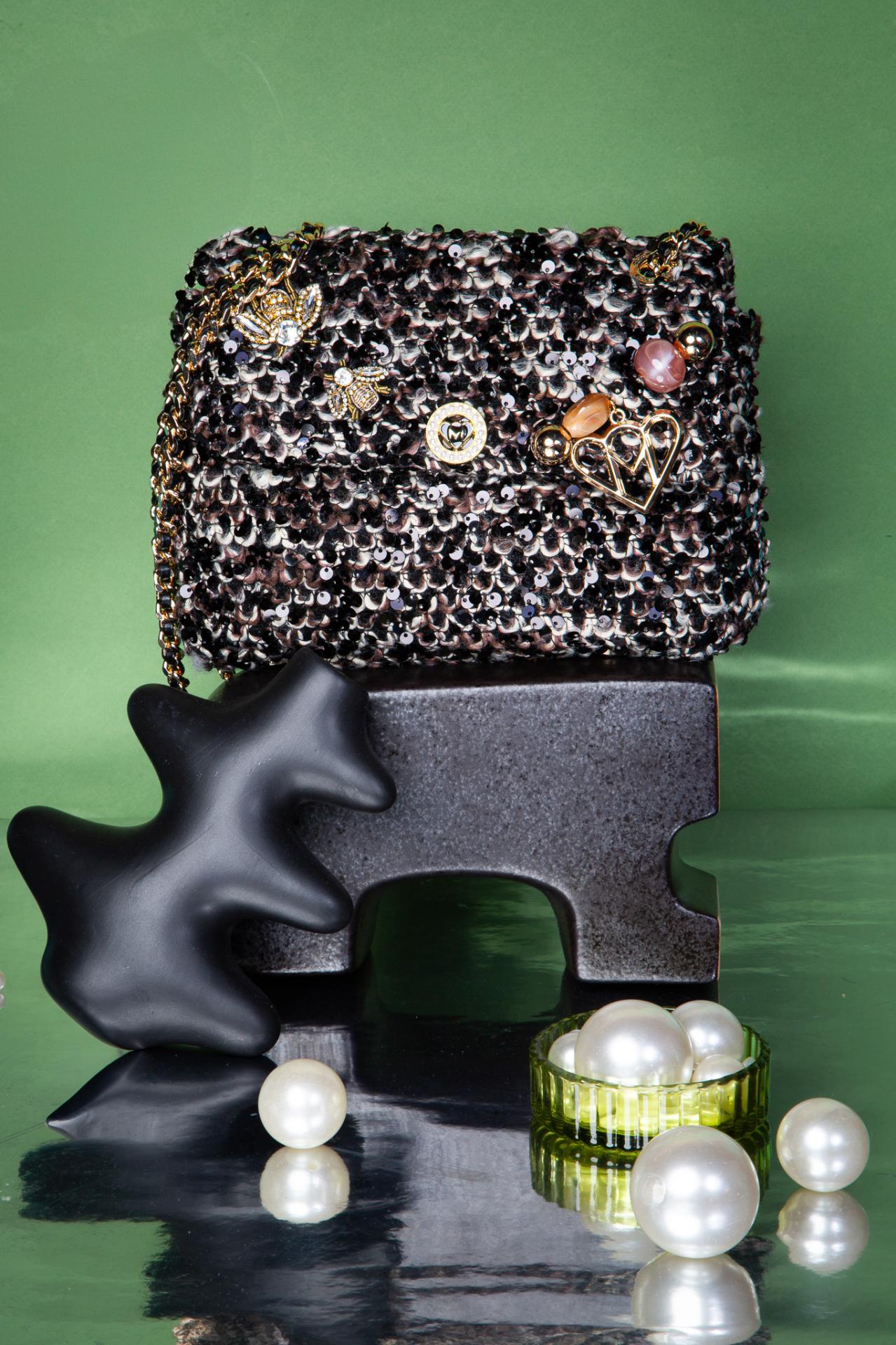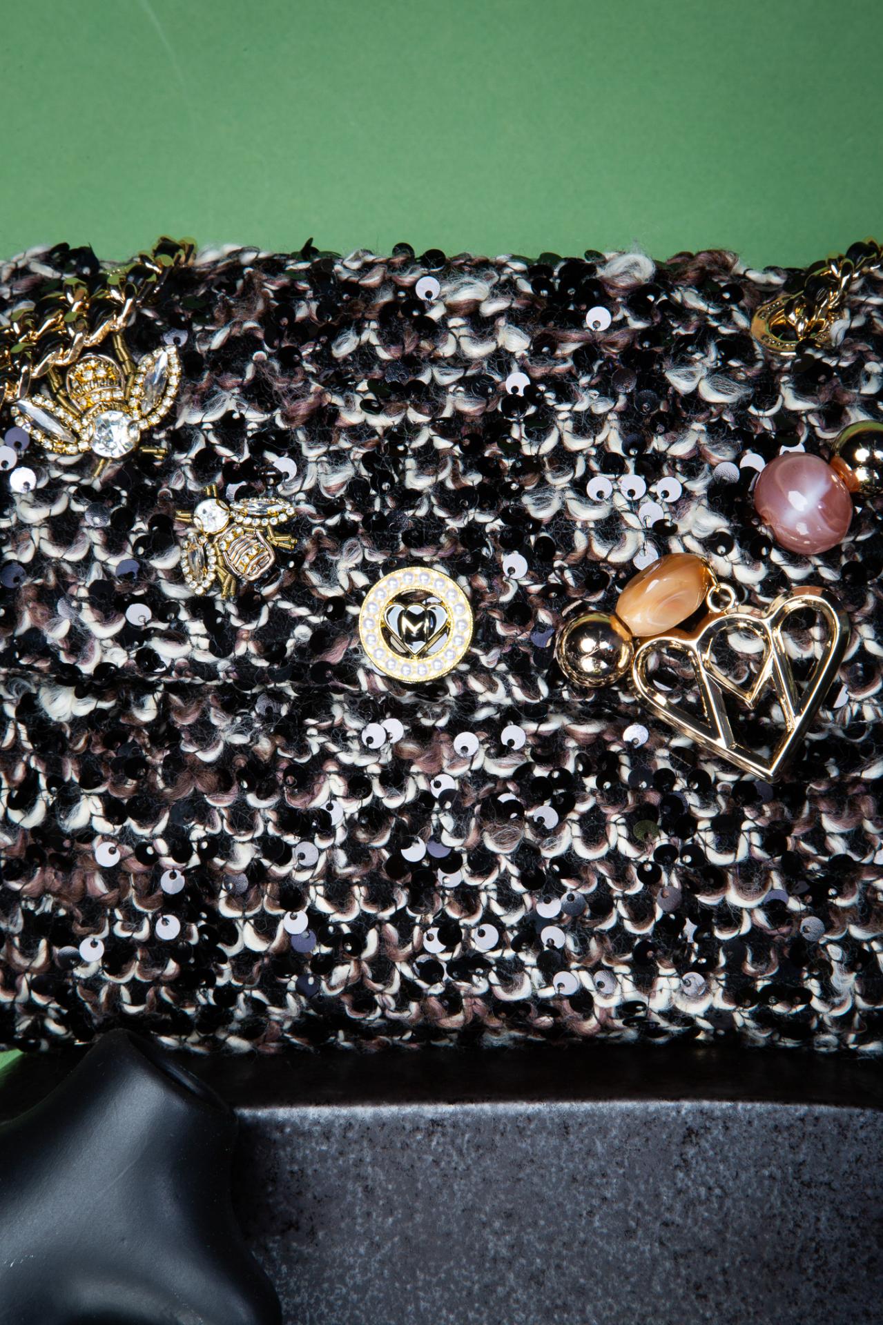 A tiny soft tweed bag sparkling with sequins and gold bee charms.