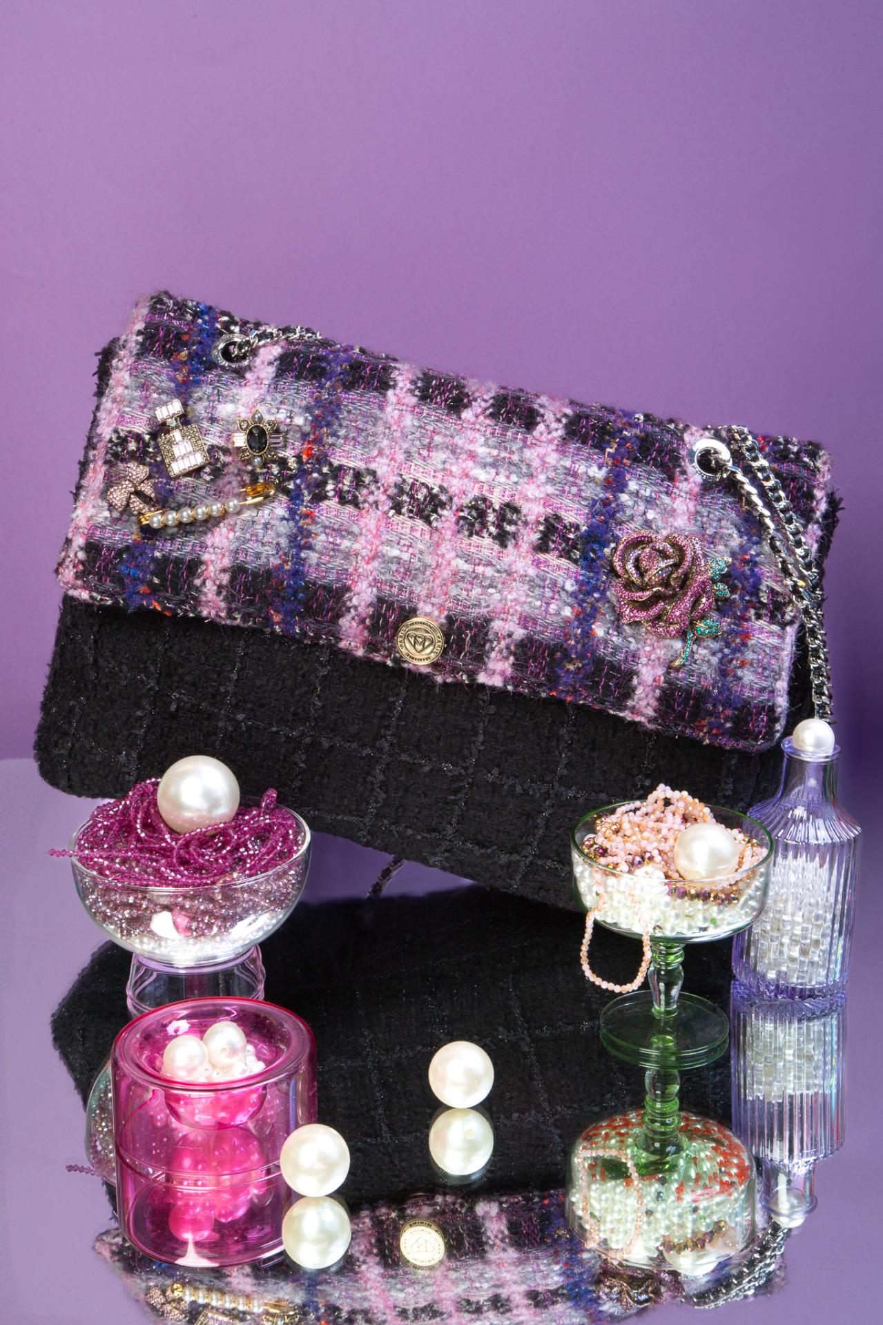 Velvet romance in oversized form, where dark tweed meets glittering charm.