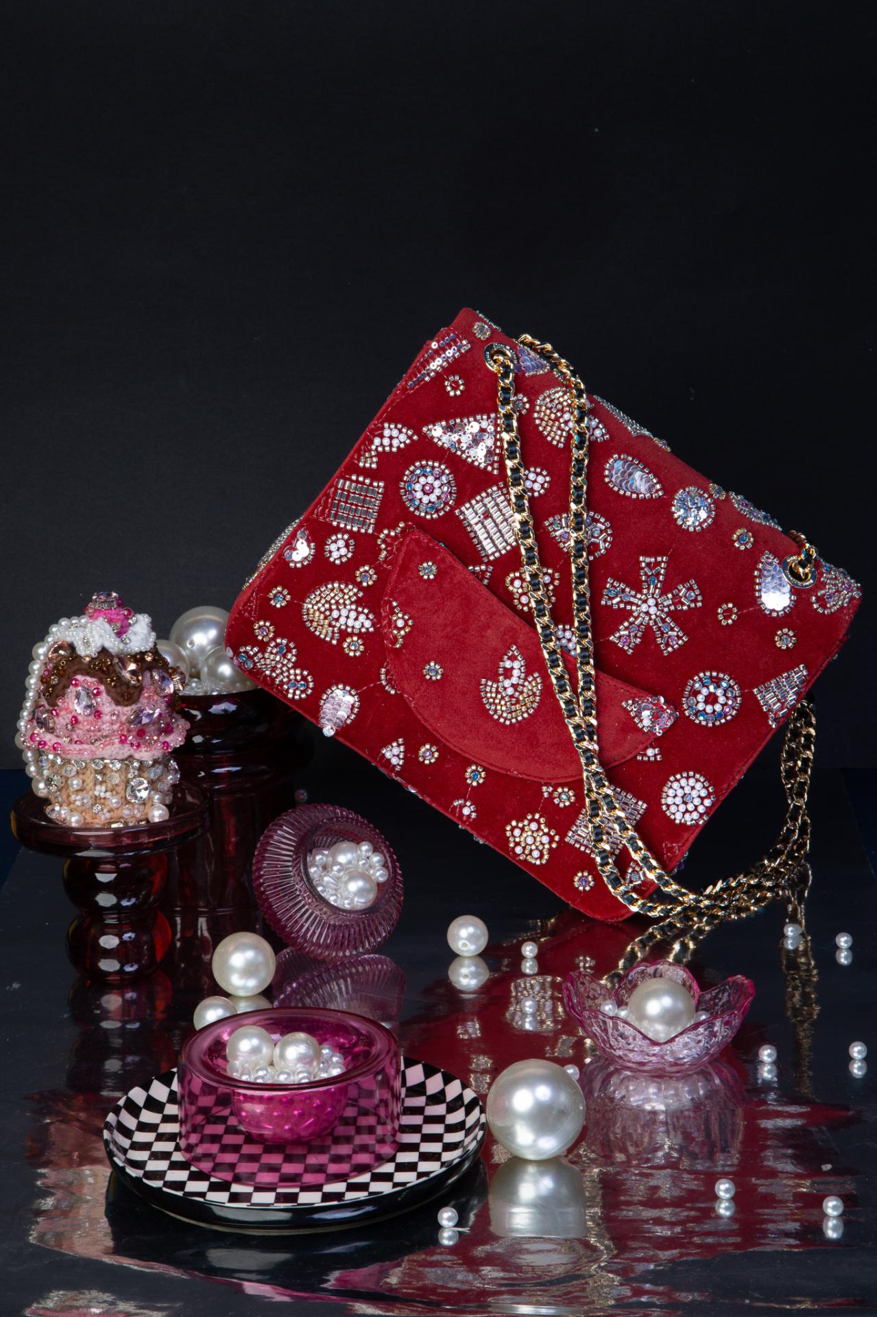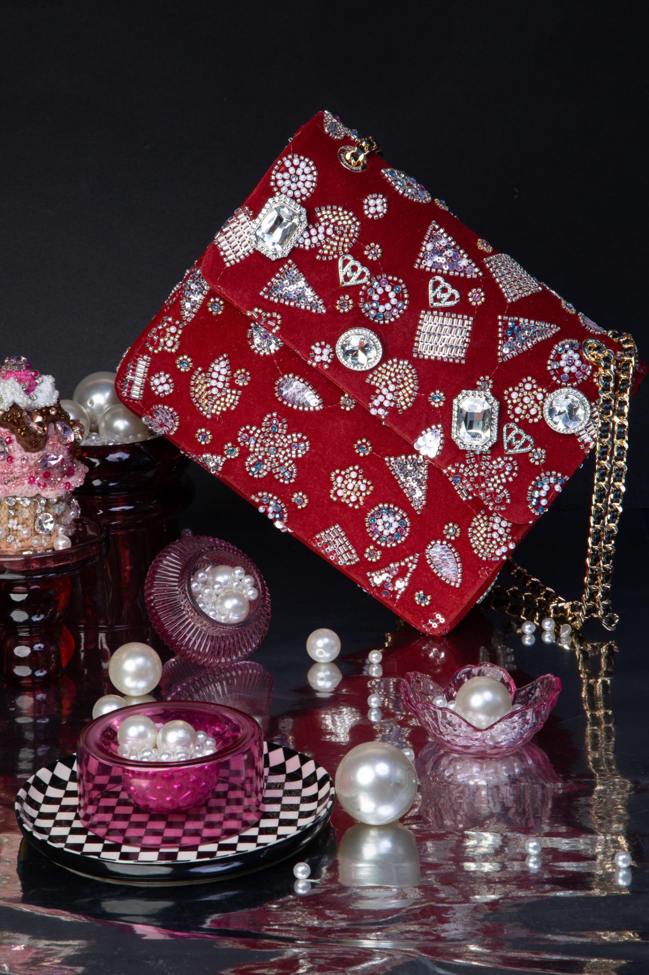 A candy-red velvet jewel box, shimmering with crystals, pearls, and gold chain magic.
